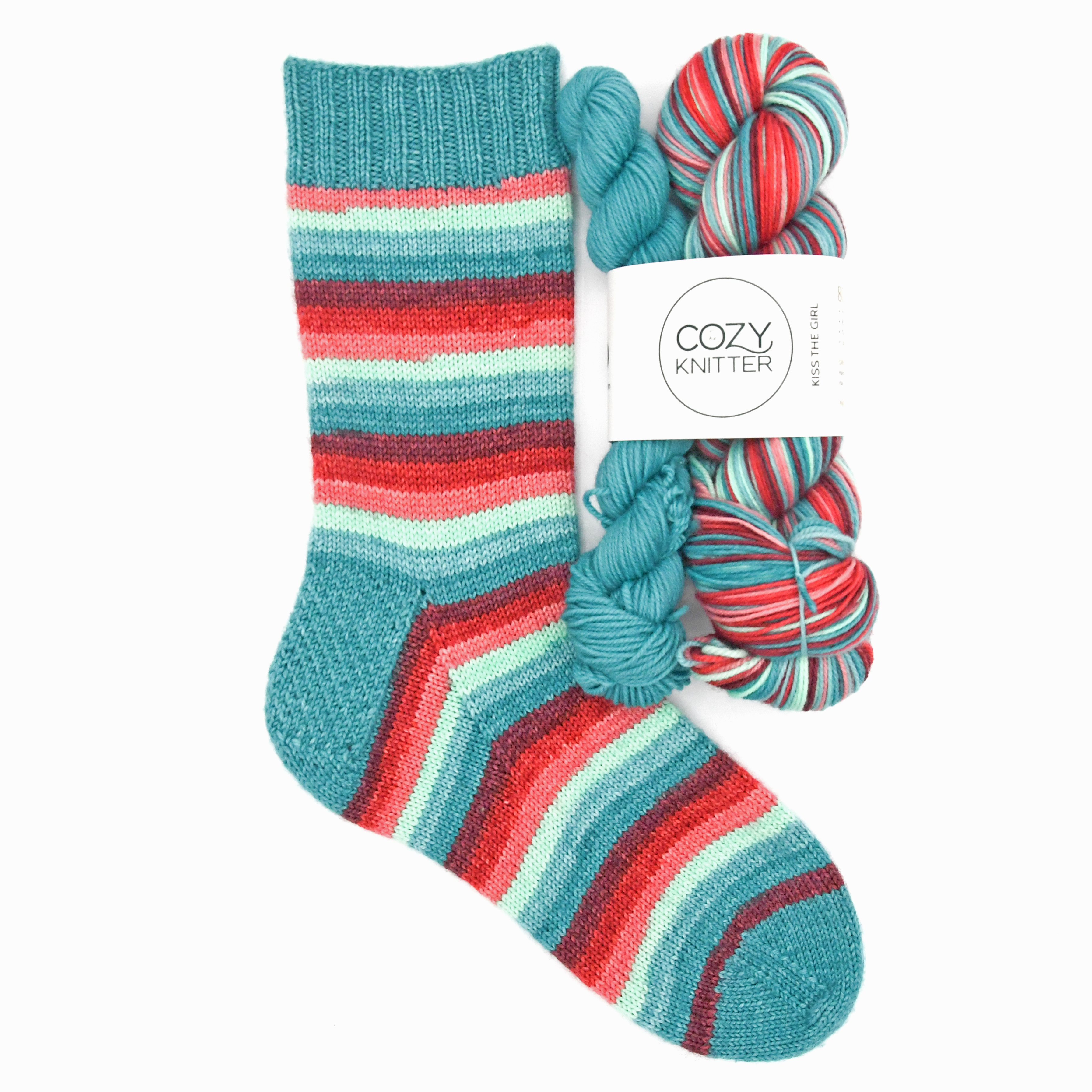 You will also receive a coordinating mini-skein for your toes/heels/cuffs in teal.