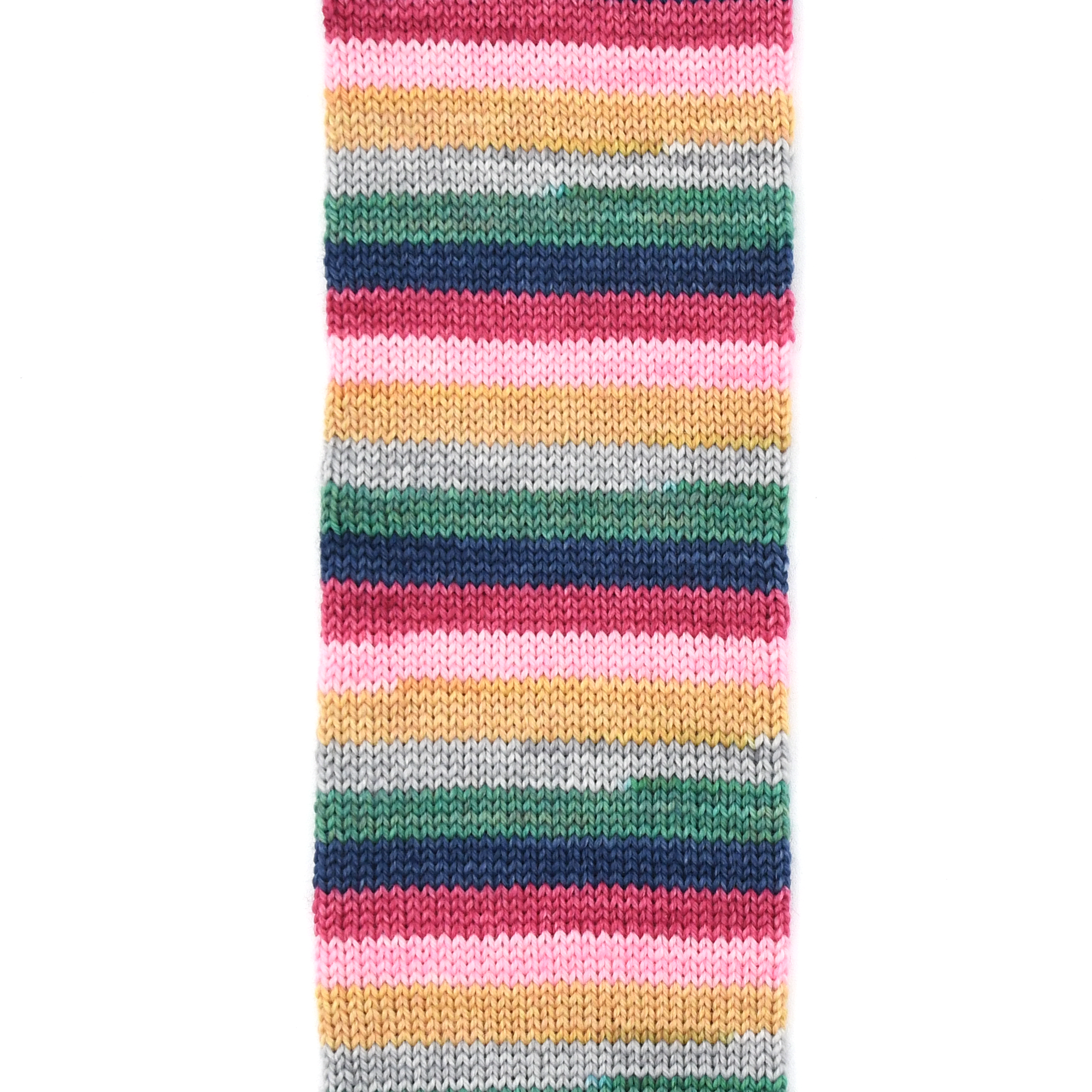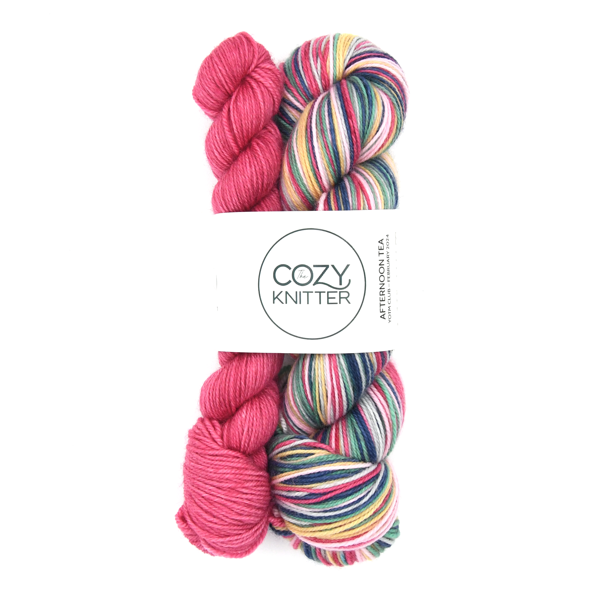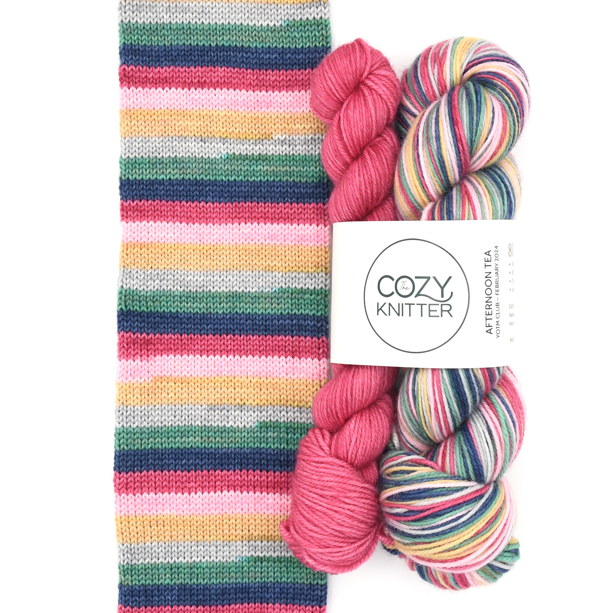 AFTERNOON TEA is the February 2024 YOTM club colourway. 1 skein of 6 stripe self-striping sock yarn each stripe is approximately 3-4 rows depending on gauge on a 64 st. sock.