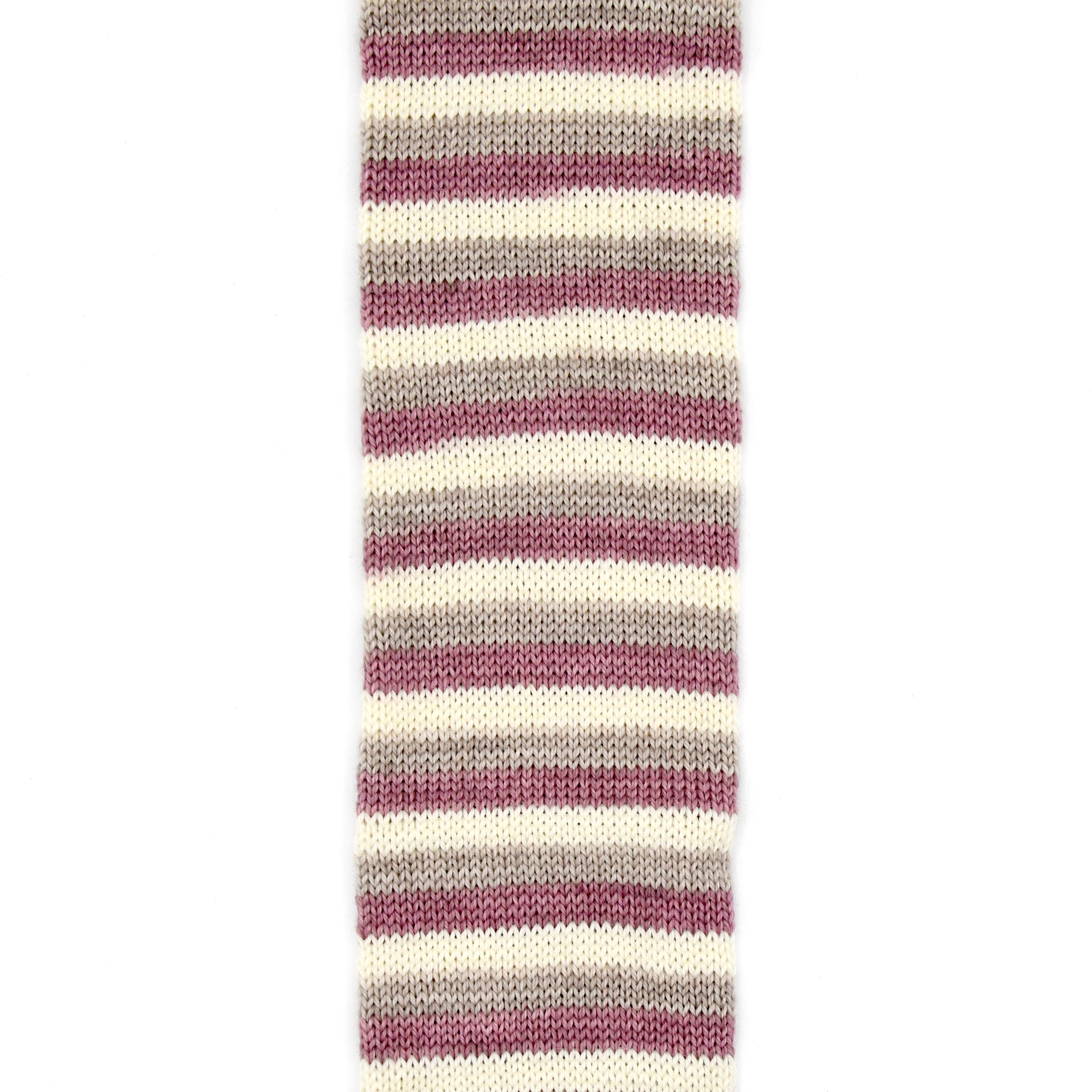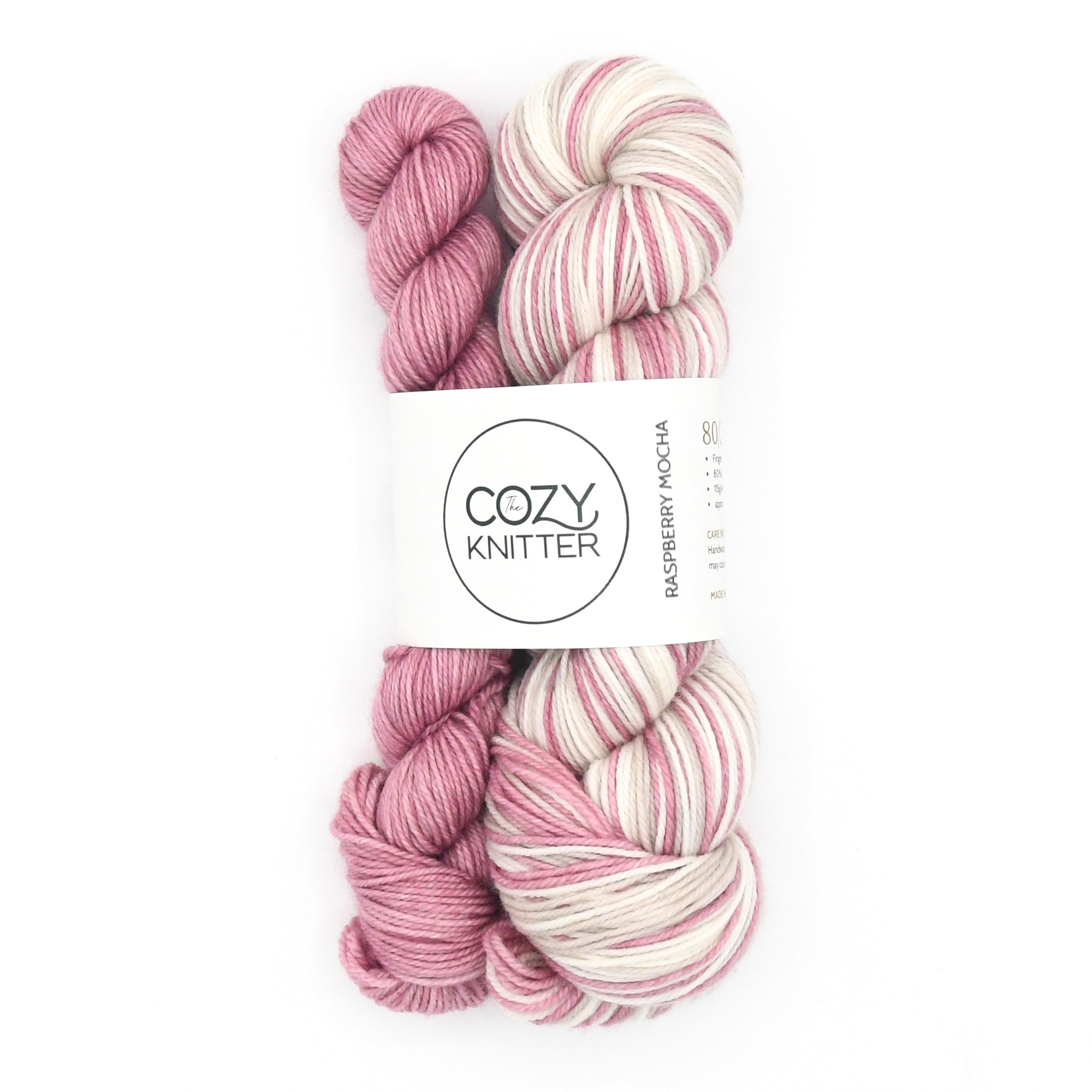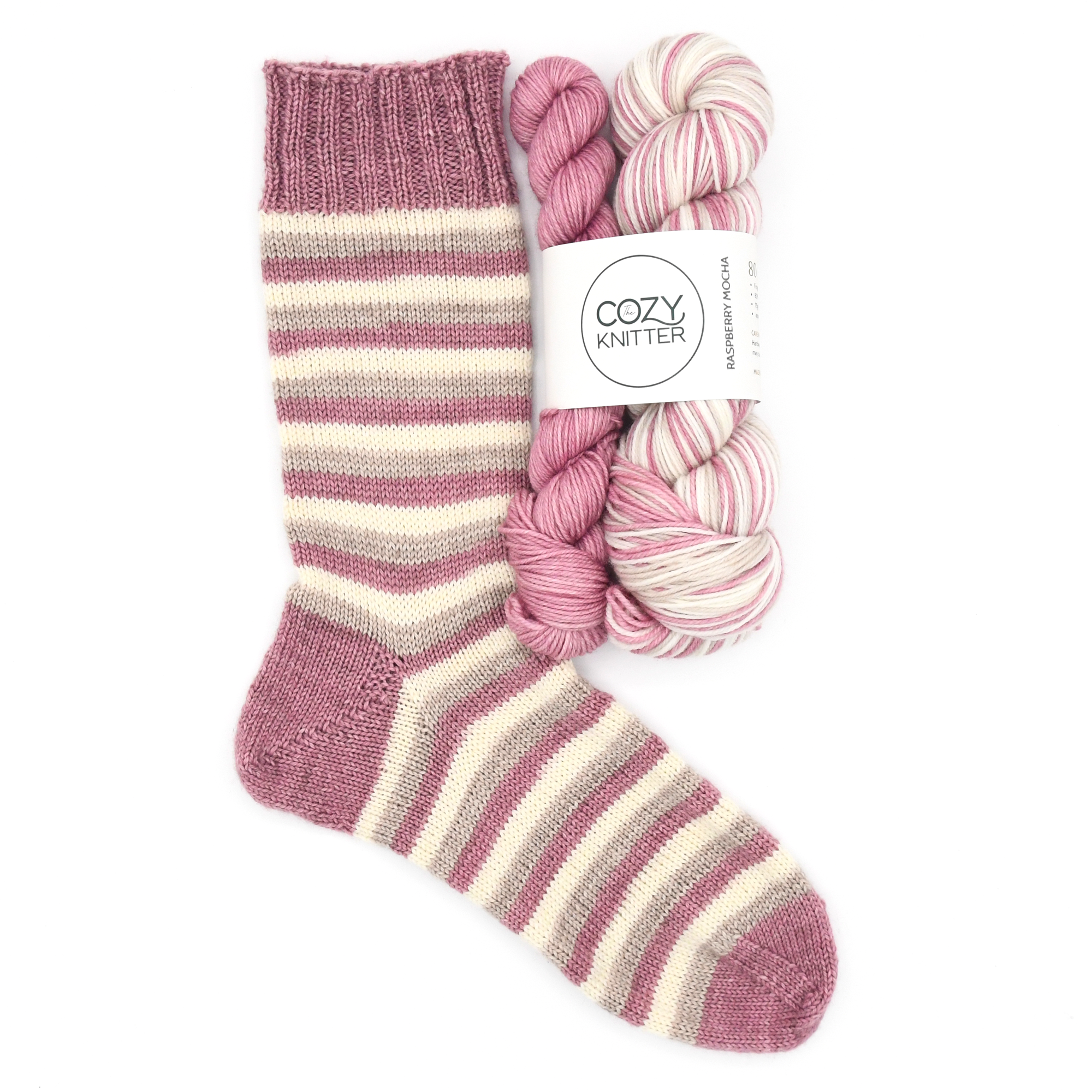 RASPBERRY MOCHA was released as the 2017 SOCK-A-THON top 5 colourway and is 1 skein of 3 stripe self-striping sock yarn each stripe is approximately 3-4 rows depending on gauge on a 64 st. sock.