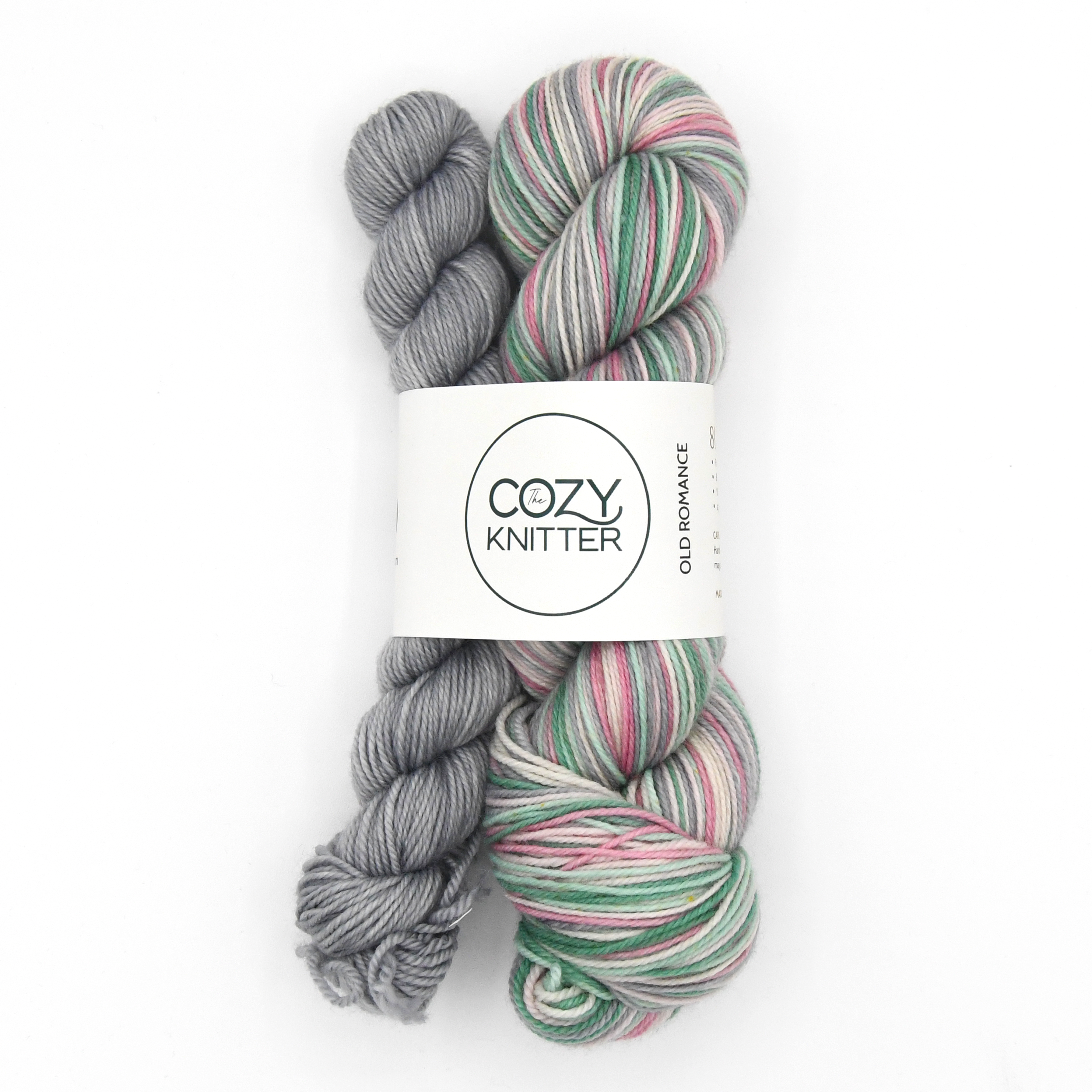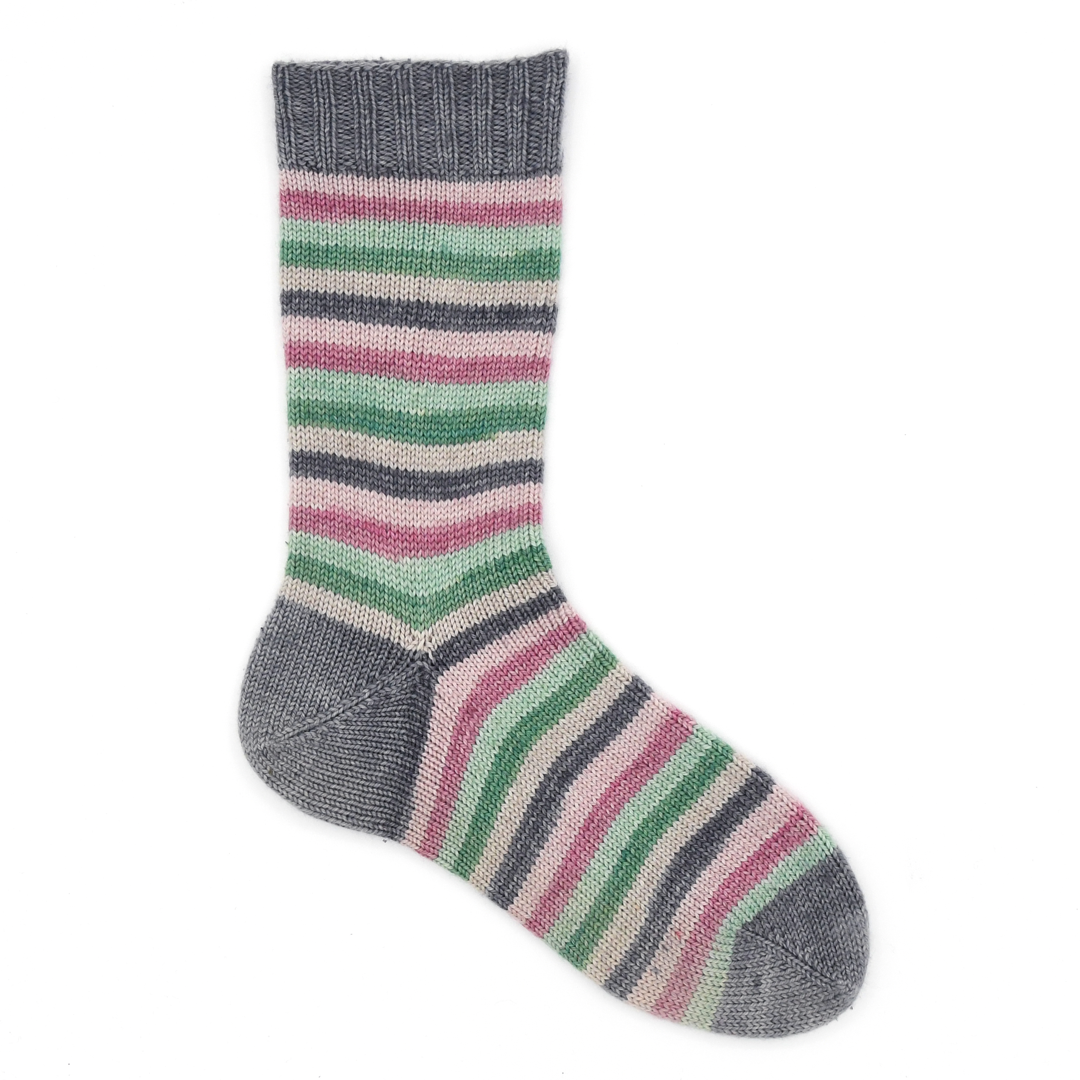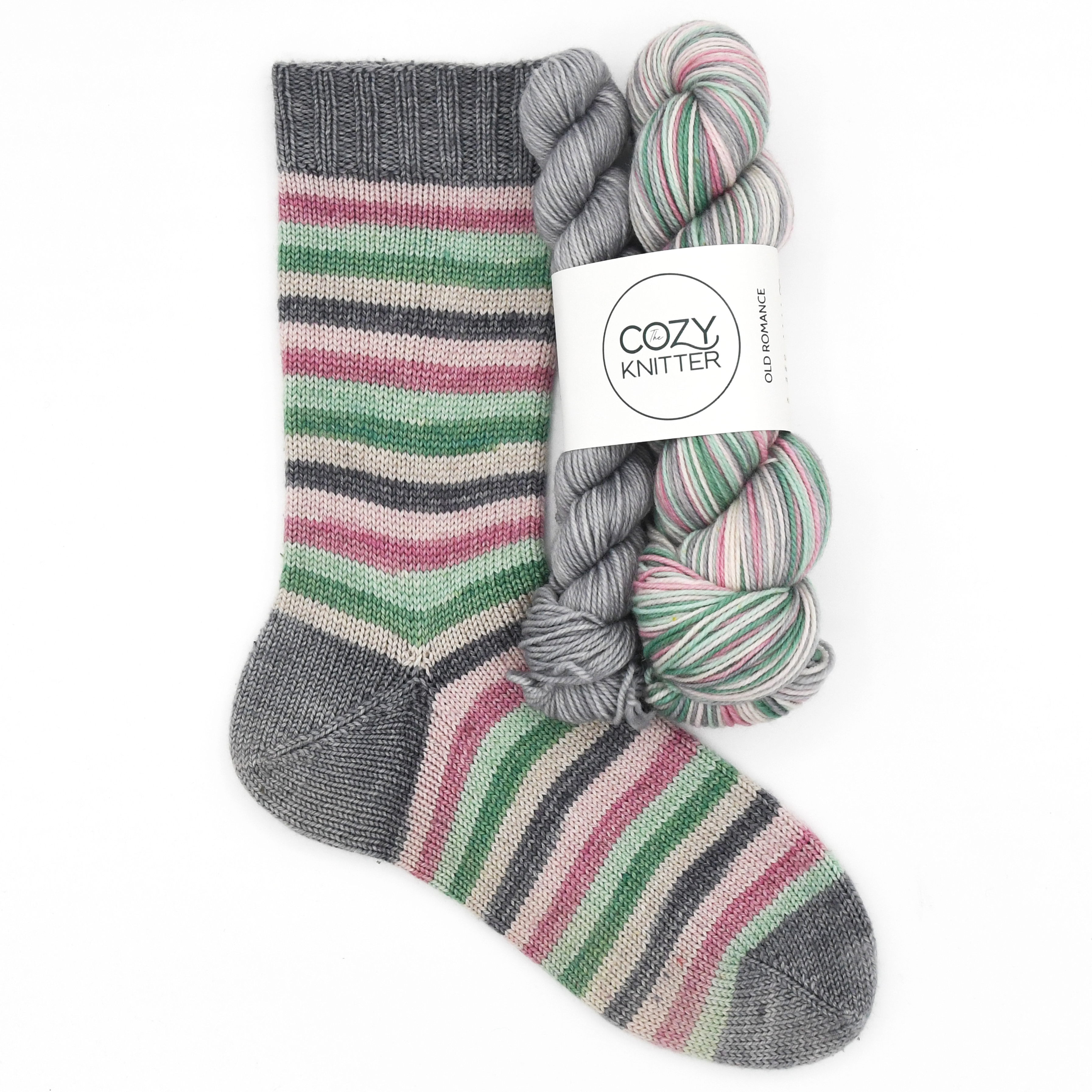 OLD ROMANCE was the June 2016 YOTM colourway. It has 6 stripes. You will also receive a co-ordinating mini-skein for your toes/heels/cuffs in the grey. Each stripe is approximately 4 rows depending on gauge on a 64 st. sock. The mini-skein for this colourway is grey