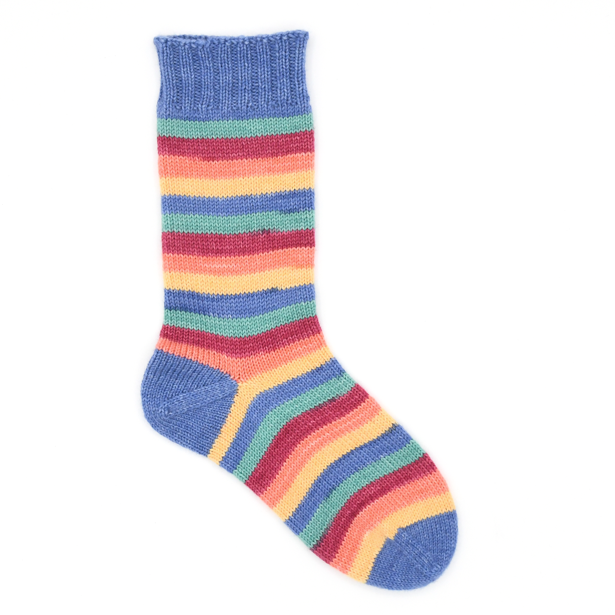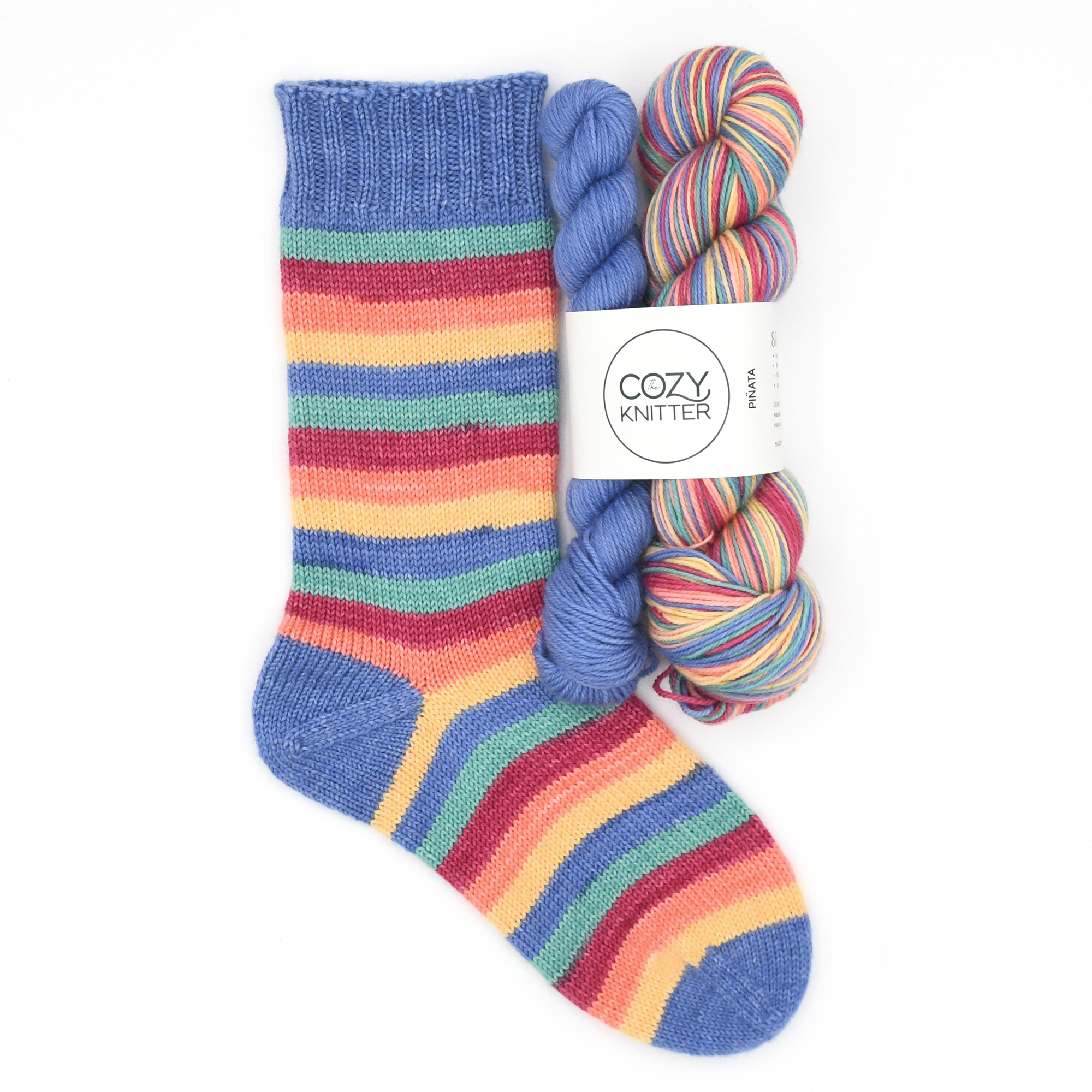PIÑATA is the March 2021 YOTM club colourway. 1 skein of 5 stripe self-striping sock yarn each stripe is approximately 5-6 rows depending on gauge on a 64 st. sock.
