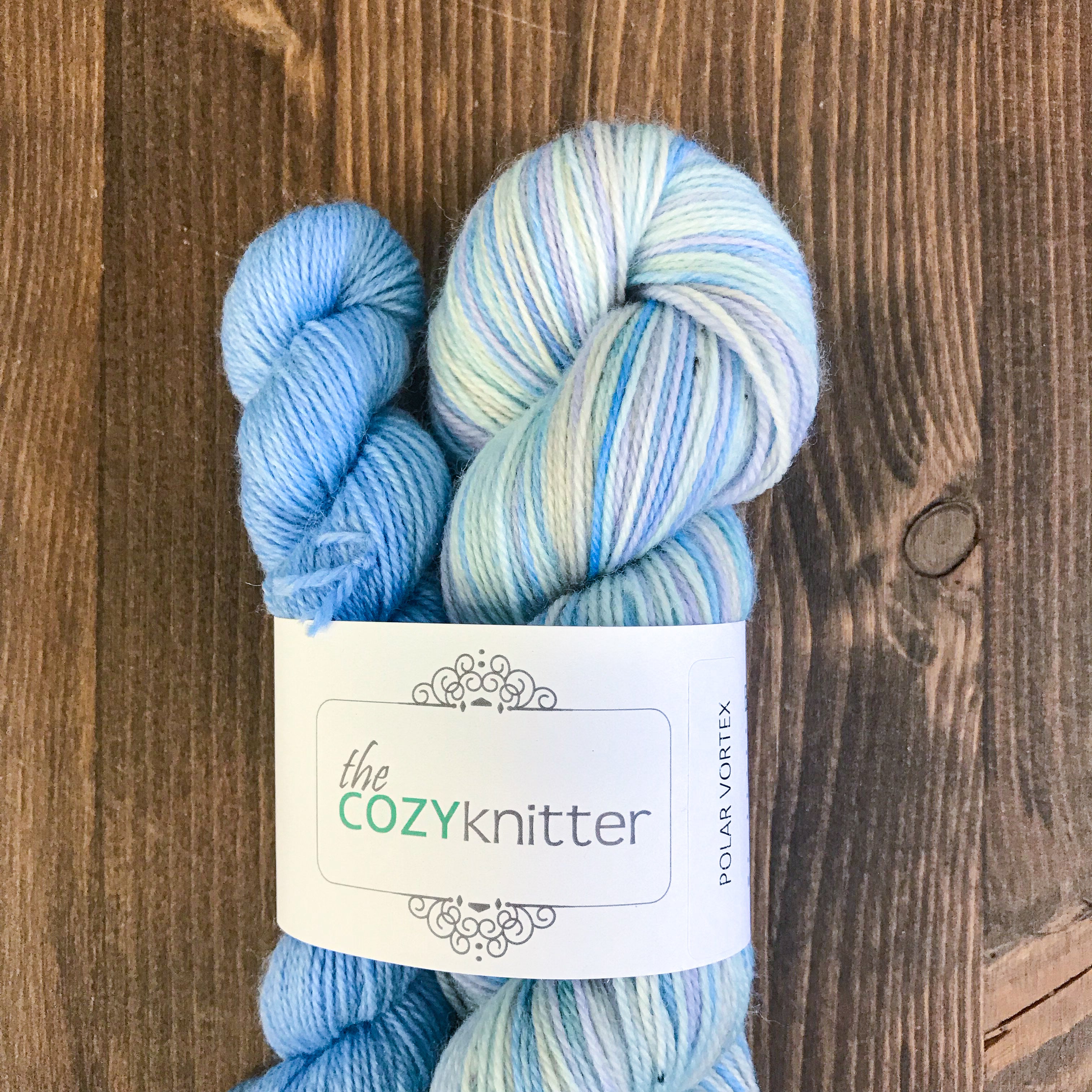 POLAR VORTEX is the February 2019 YOTM club colourway, this colour way has a fun variegated stripe with speckles. 1 skein of 5 stripe self-striping sock yarn each stripe is approximately 3-4 rows depending on gauge on a 64 st. sock.