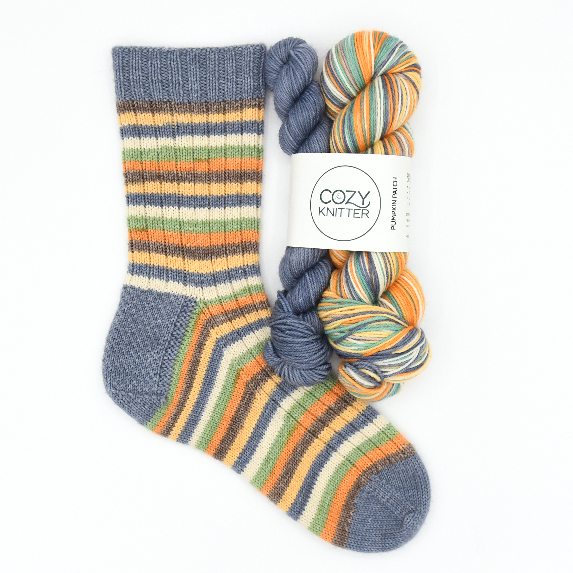 PUMPKIN PATCH is the October 2018 YOTM club colourway. 1 skein of 6 stripe self-striping sock yarn each stripe is approximately 3-4 rows depending on gauge on a 64 st. sock.