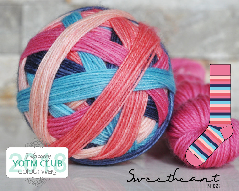 SWEETHEART is the February 2018 YOTM club colourway. 1 skein of 5-self-striping sock yarn each stripe is approximately 5-6 rows depending on gauge on a 64 st. sock.