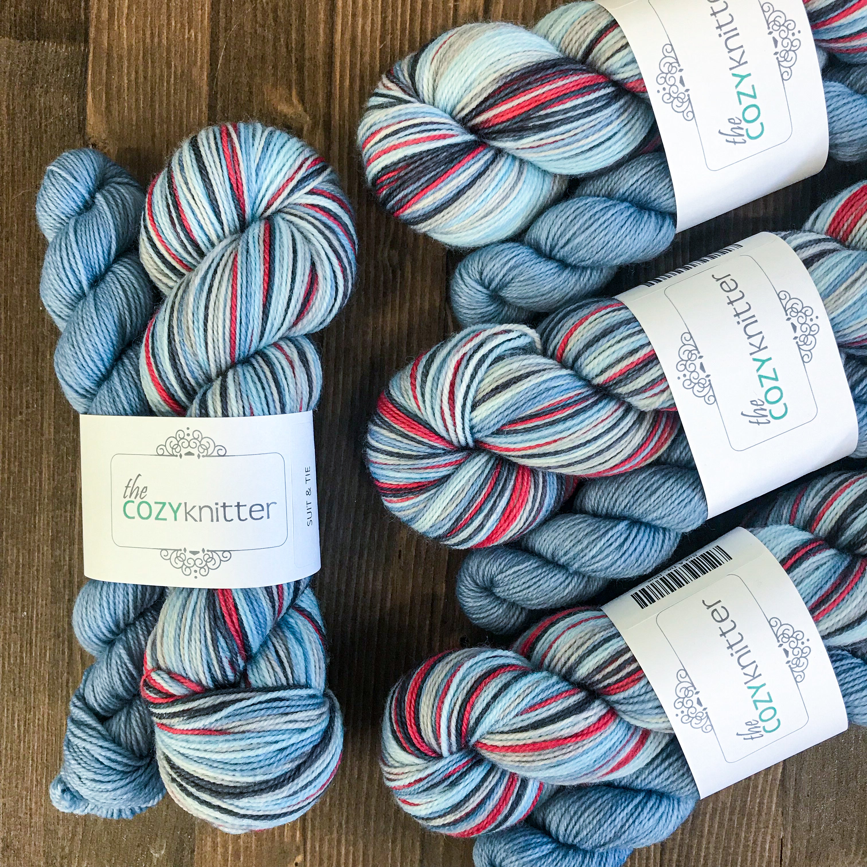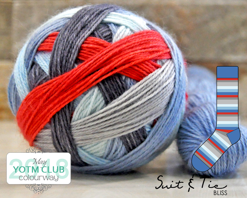 SUIT & TIE is the May 2018 YOTM club colourway. 1 skein of 6 stripe self-striping sock yarn the stripes in this colourway vary by colour, some will be about 3-4 rows on a 64st sock others will be about 9 rows.