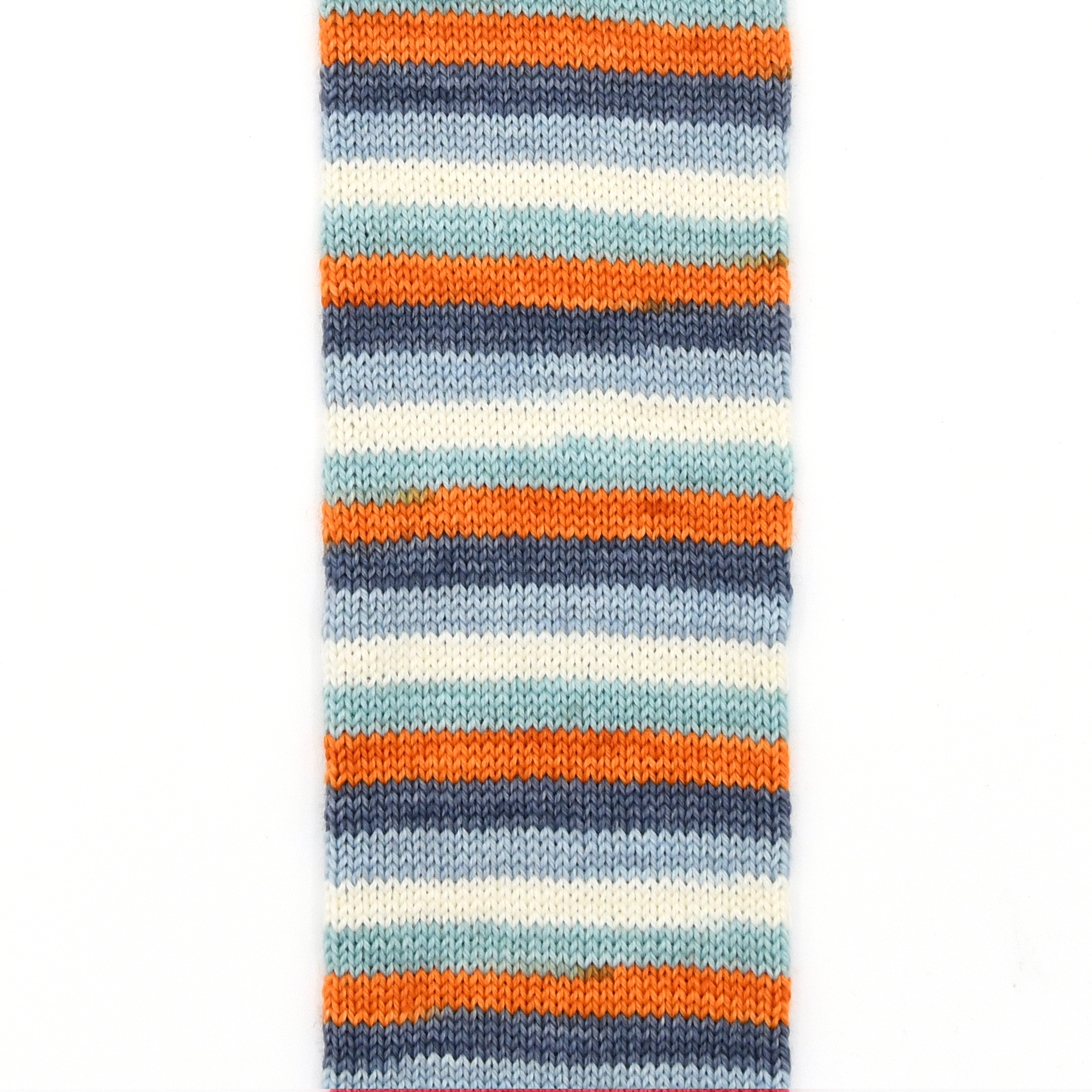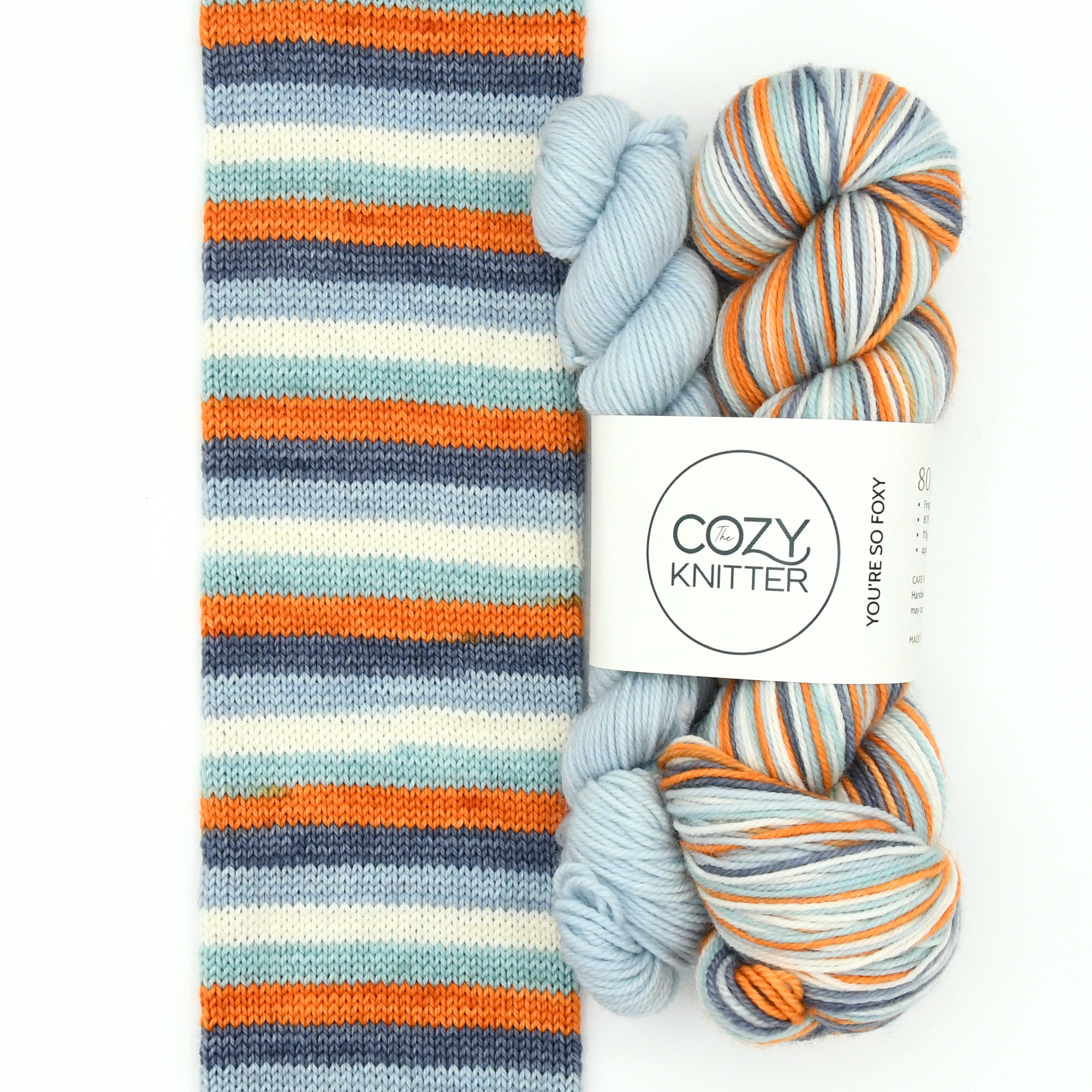 YOU'RE SO FOXY was the November 2016 YOTM colourway. It has 5 stripes. You will also receive a co-ordinating mini-skein for your toes/heels/cuffs in the blue. Each stripe is approximately 5-6 rows depending on gauge on a 64 st. sock.