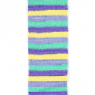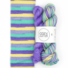IRIS is 1 skein of self-striping sock yarn {{ purple | green | lilac | yellow }} with a perfectly matched green/purple mini-skein for your toes/heels/cuffs. Each stripe is approximately 5-6 rows depending on gauge on a 64 st. sock.