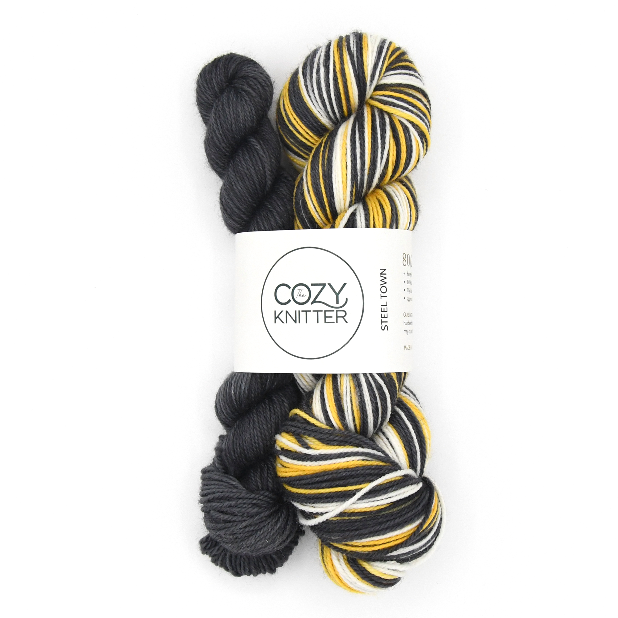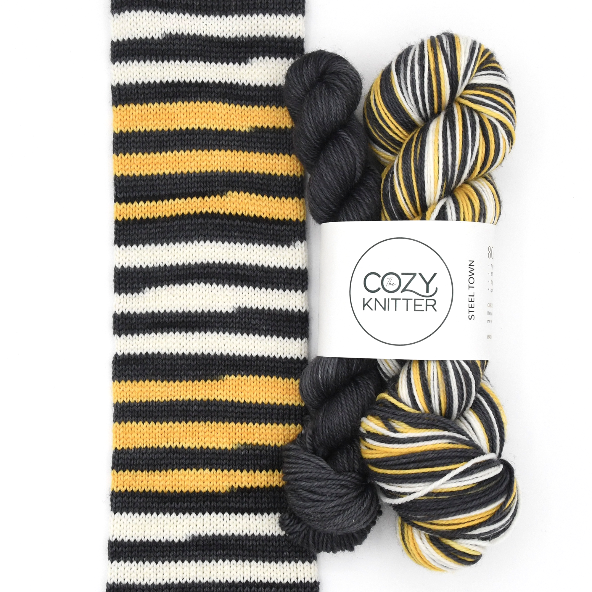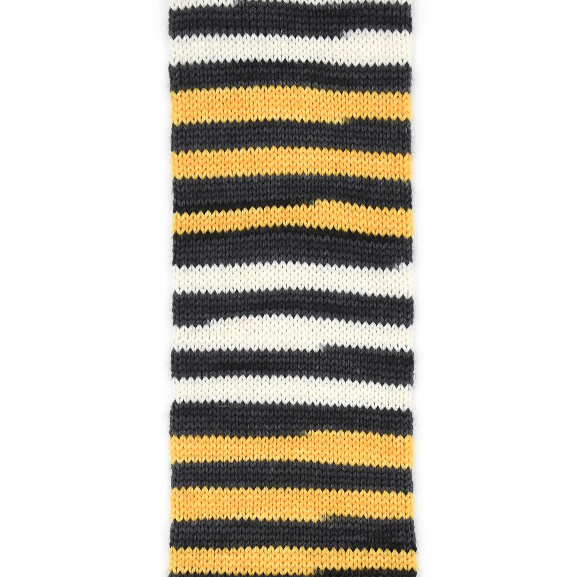 STEEL TOWN is a part of a series of 12 stripe sport themed colourways. Every other stripe is black, the alternating 6 stripes are in blocks of 3 stripes each of white and yellow. You will also receive a co-ordinating mini-skein for your toes/heels/cuffs in black. Each stripe is approximately 4 rows depending on gauge on a 64 st. sock.