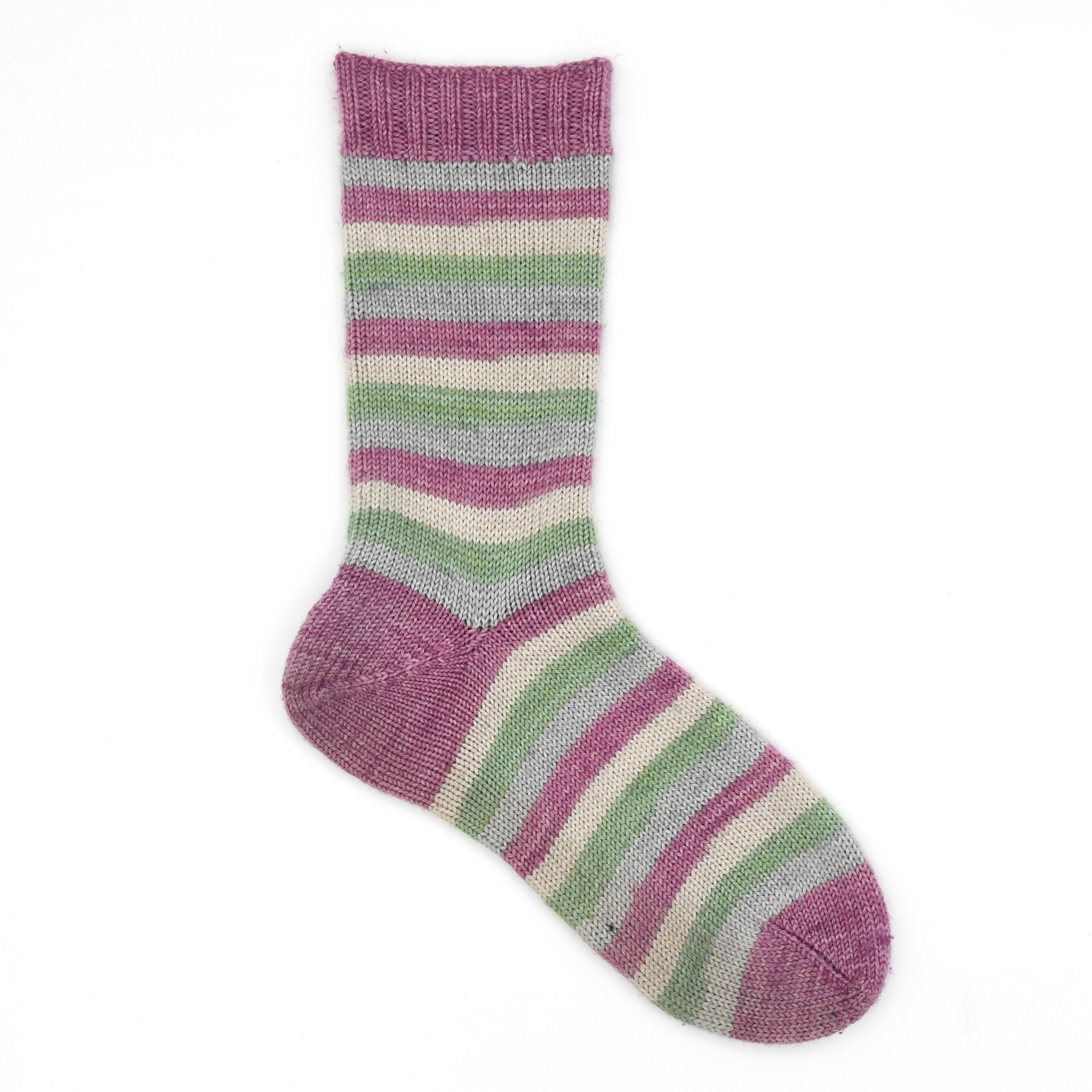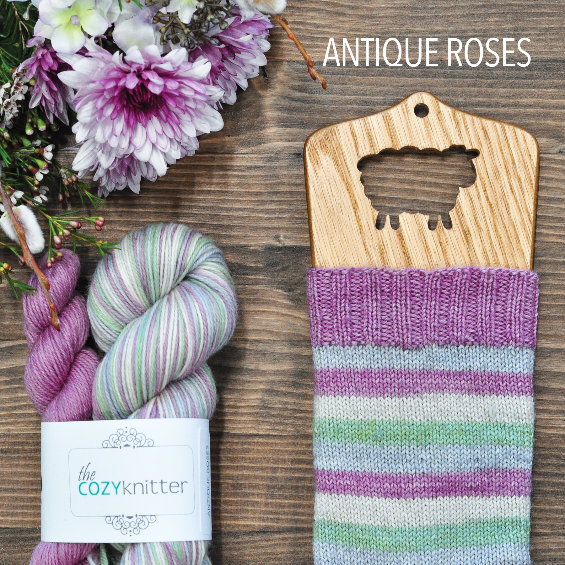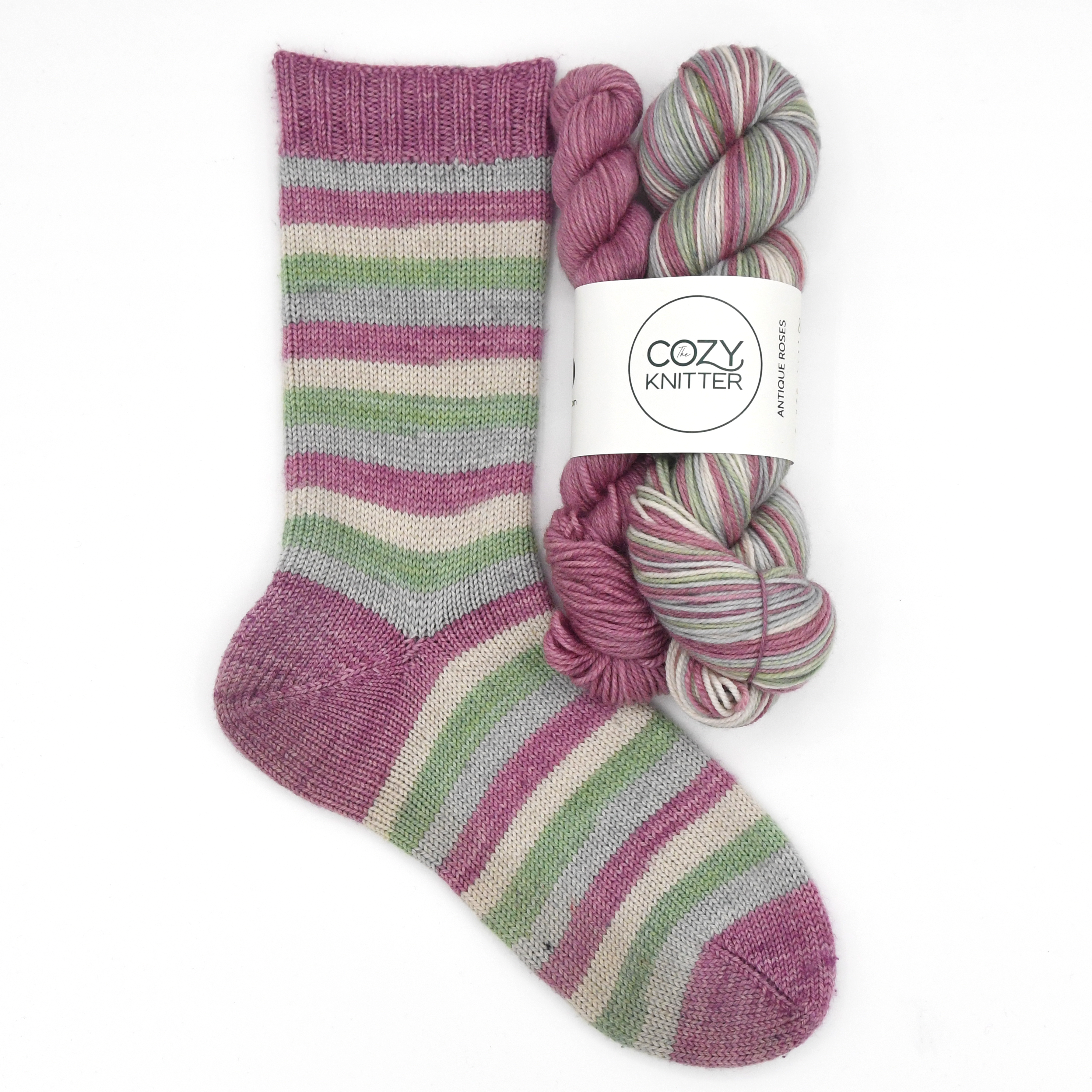 ANTIQUE ROSES was the September 2016 YOTM colourway. It has 4 stripes and is featured on Mina Philipps beautiful pattern Sweet Pea Dress. You will also receive a co-ordinating mini-skein for your toes/heels/cuffs in the mauve. Each stripe is approximately 5-6 rows depending on gauge on a 64 st. sock.