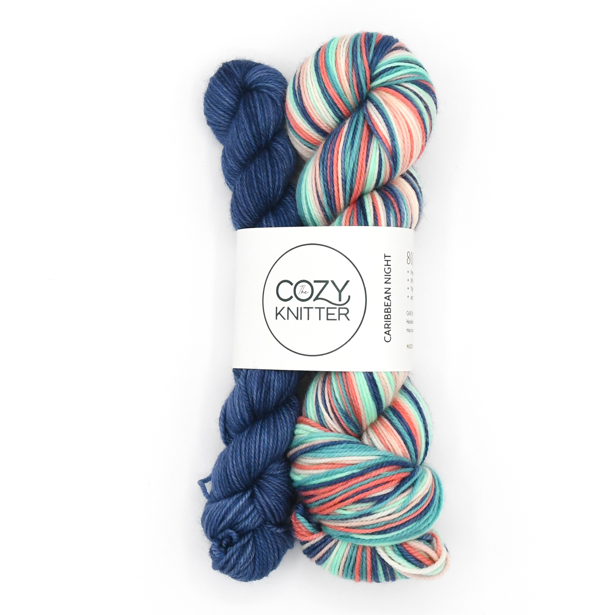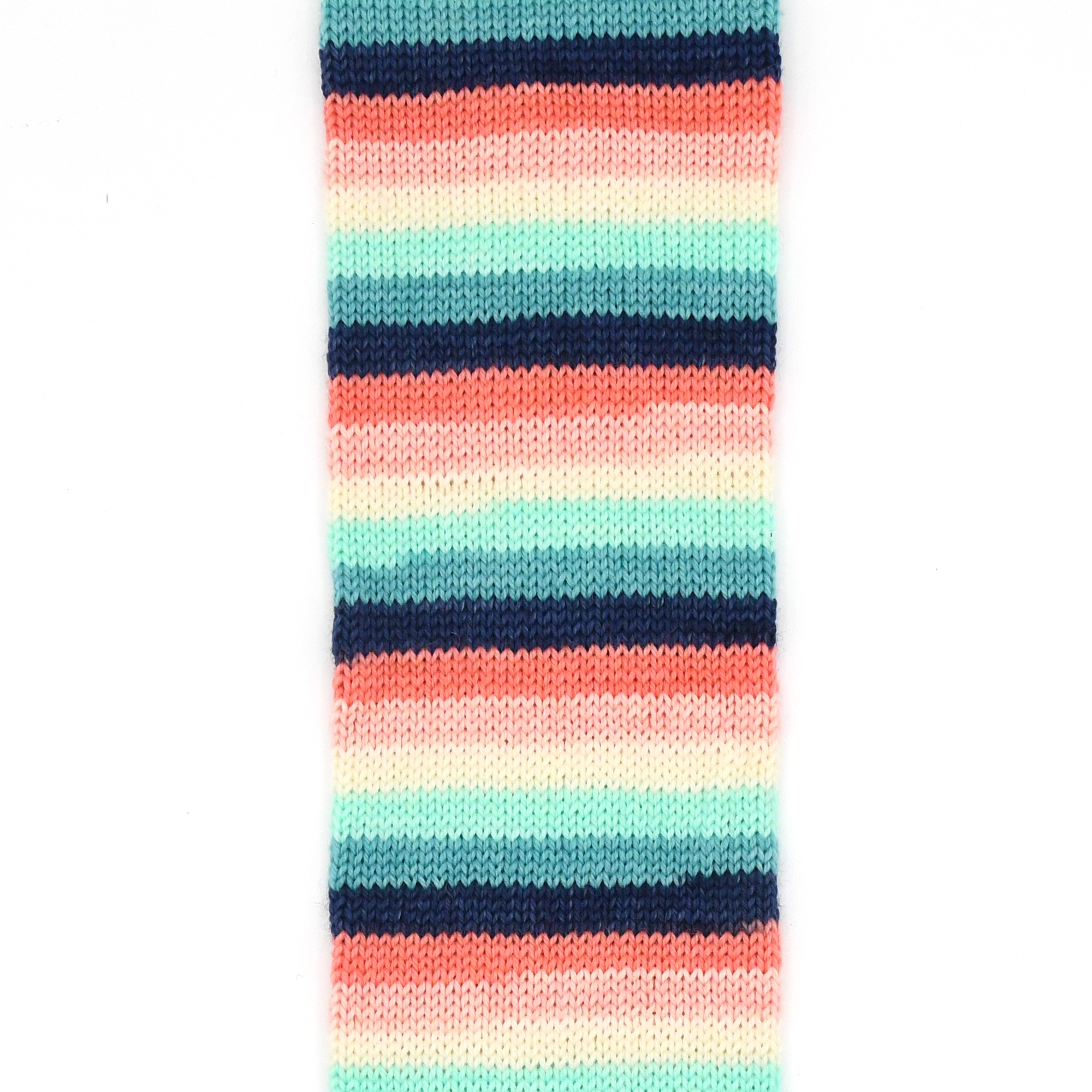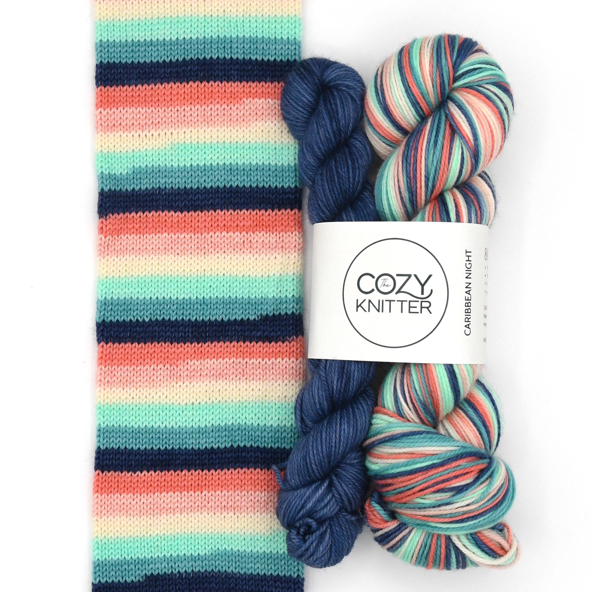 CARIBBEAN NIGHT is the July 2019 YOTM club colourway. 1 skein of 6 stripe self-striping sock yarn each stripe is approximately 3-4 rows depending on gauge on a 64 st. sock.