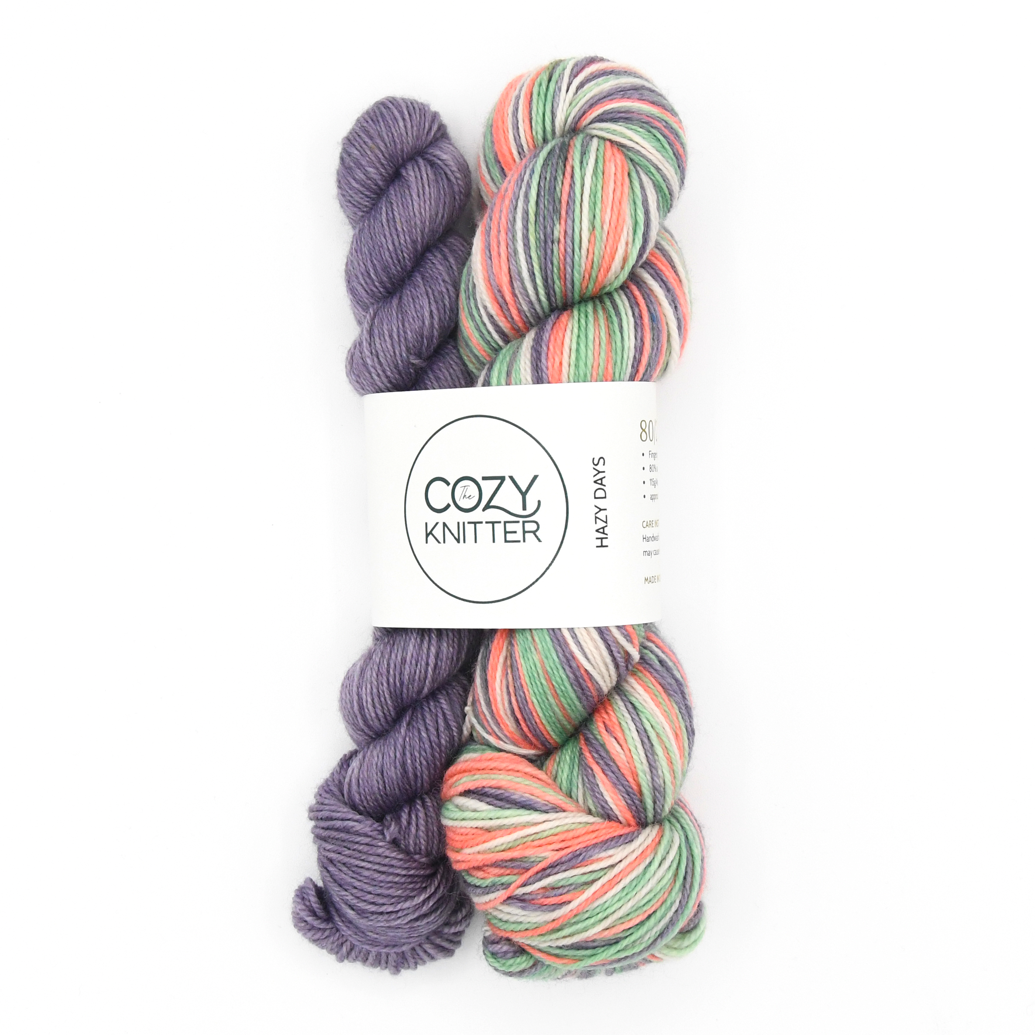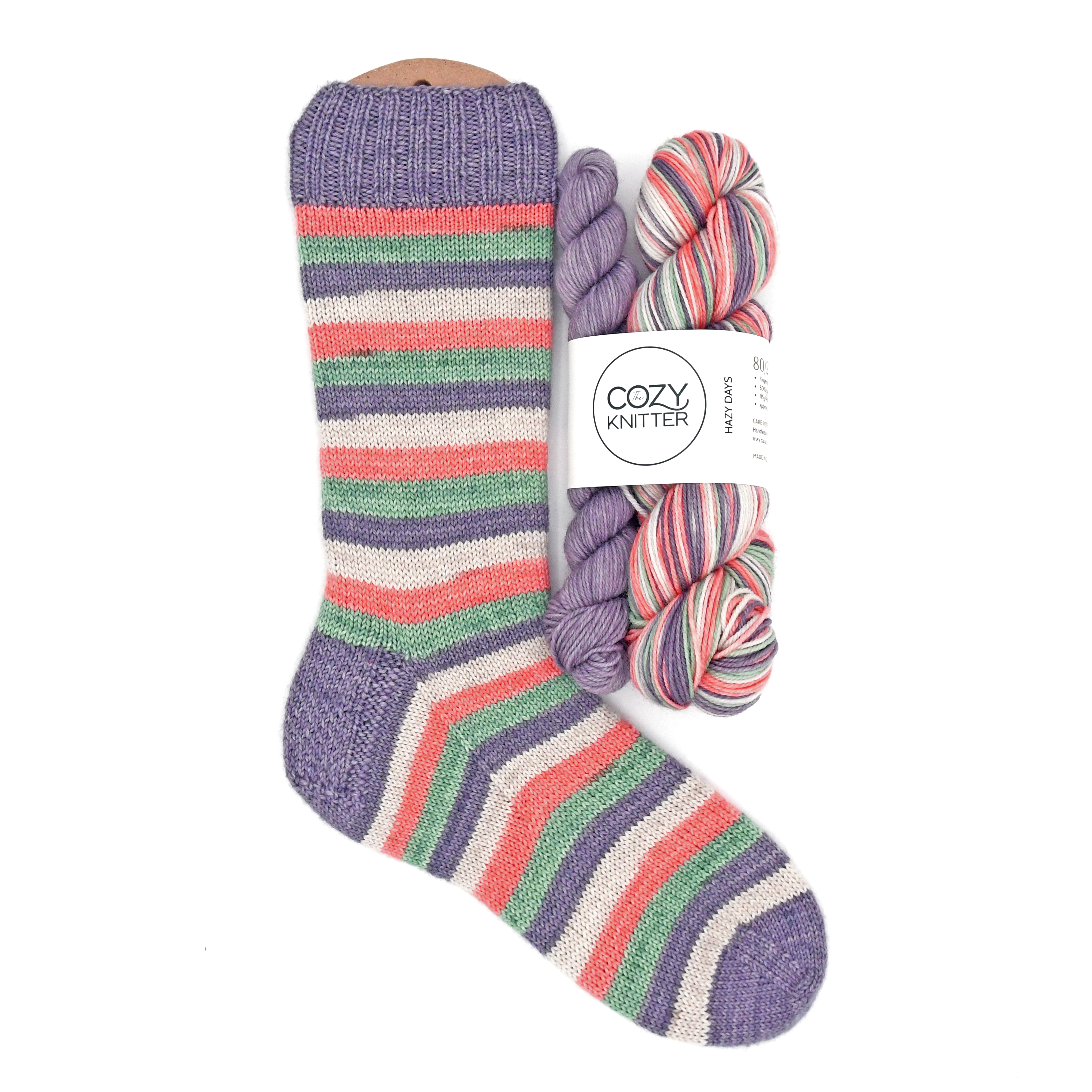HAZY DAYS is the September 2022 YOTM club colourway. 1 skein of 4 stripe self-striping sock yarn each stripe is approximately 5-6 rows depending on gauge on a 64 st. sock.