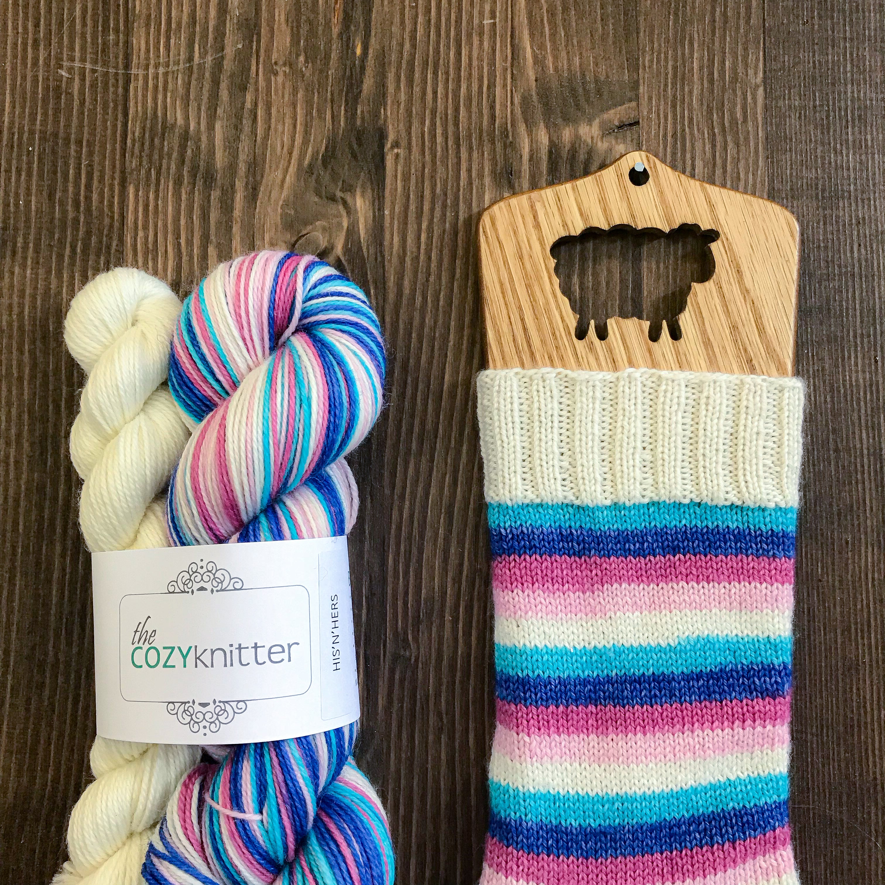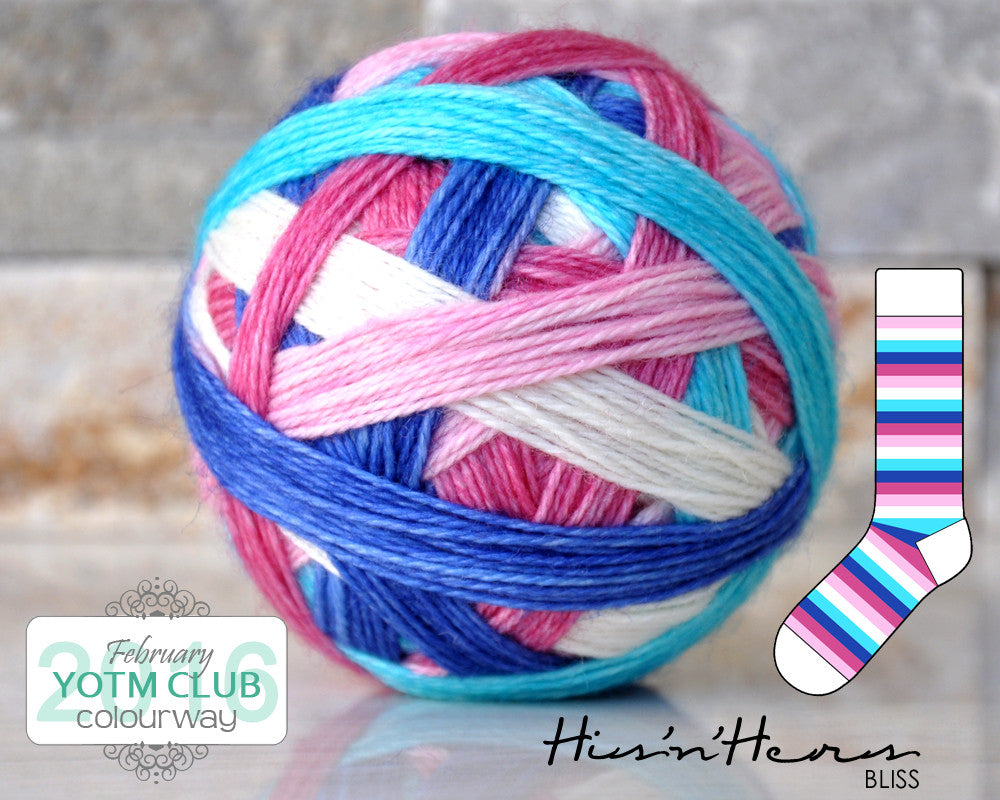 HIS'N'HERS was the February 2016 YOTM colourway. It has 5 stripes. You will also receive a co-ordinating mini-skein for your toes/heels/cuffs in the white. Each stripe is approximately 4 rows depending on gauge on a 64 st. sock.
