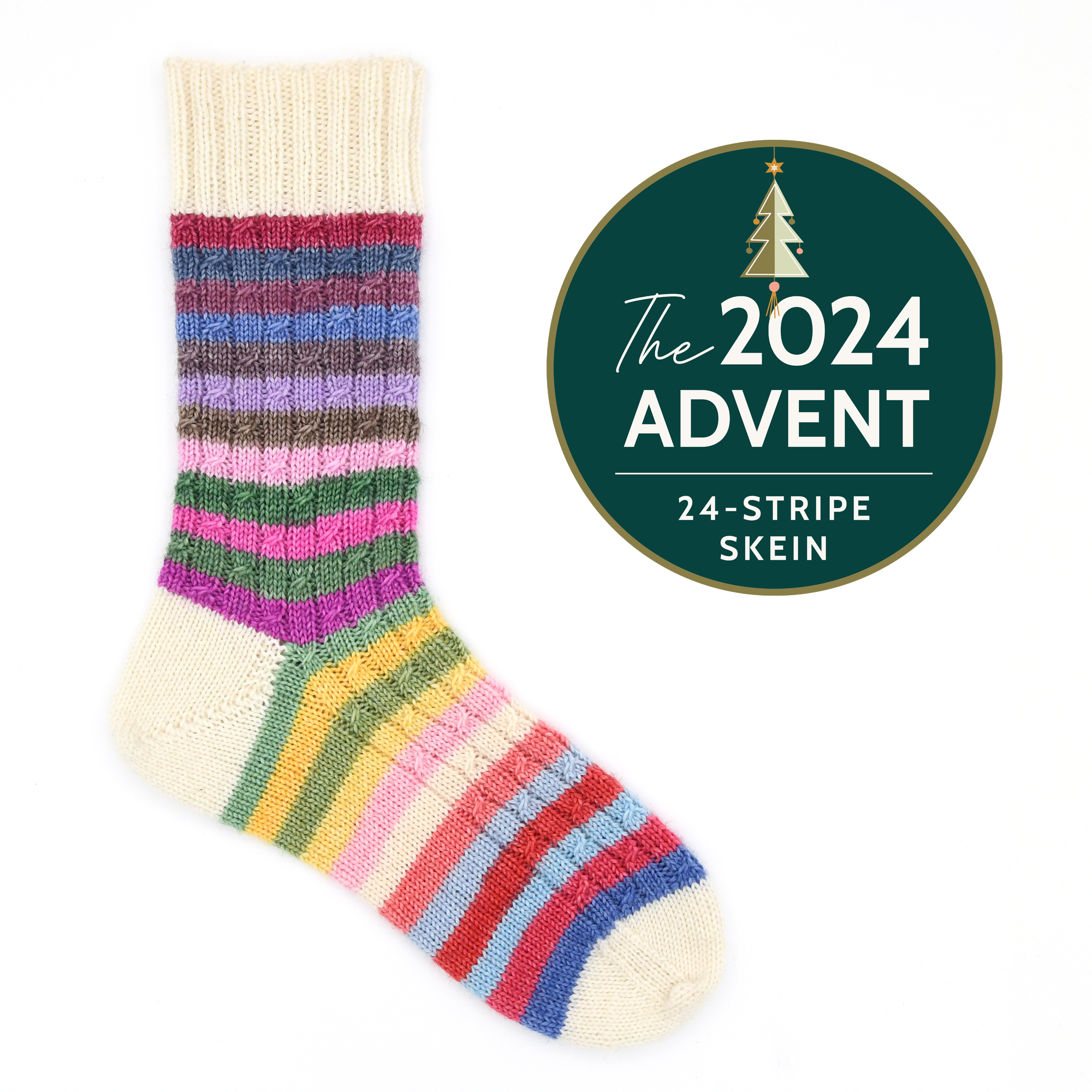 The Advent Skein is dyed on my 80/20 (Bliss) sock base which is 80% superwash merino and 20% nylon and will be approx. 120g. The skein will be split into two even half-skeins each with 2 full repeats of 24 stripes, stripes are approx. 5-6 rows depending on your gauge. To have a finished pair of socks by Christmas Day you may need to knit more than one stripe daily, this depends on your personal gauge and the size you will be knitting.