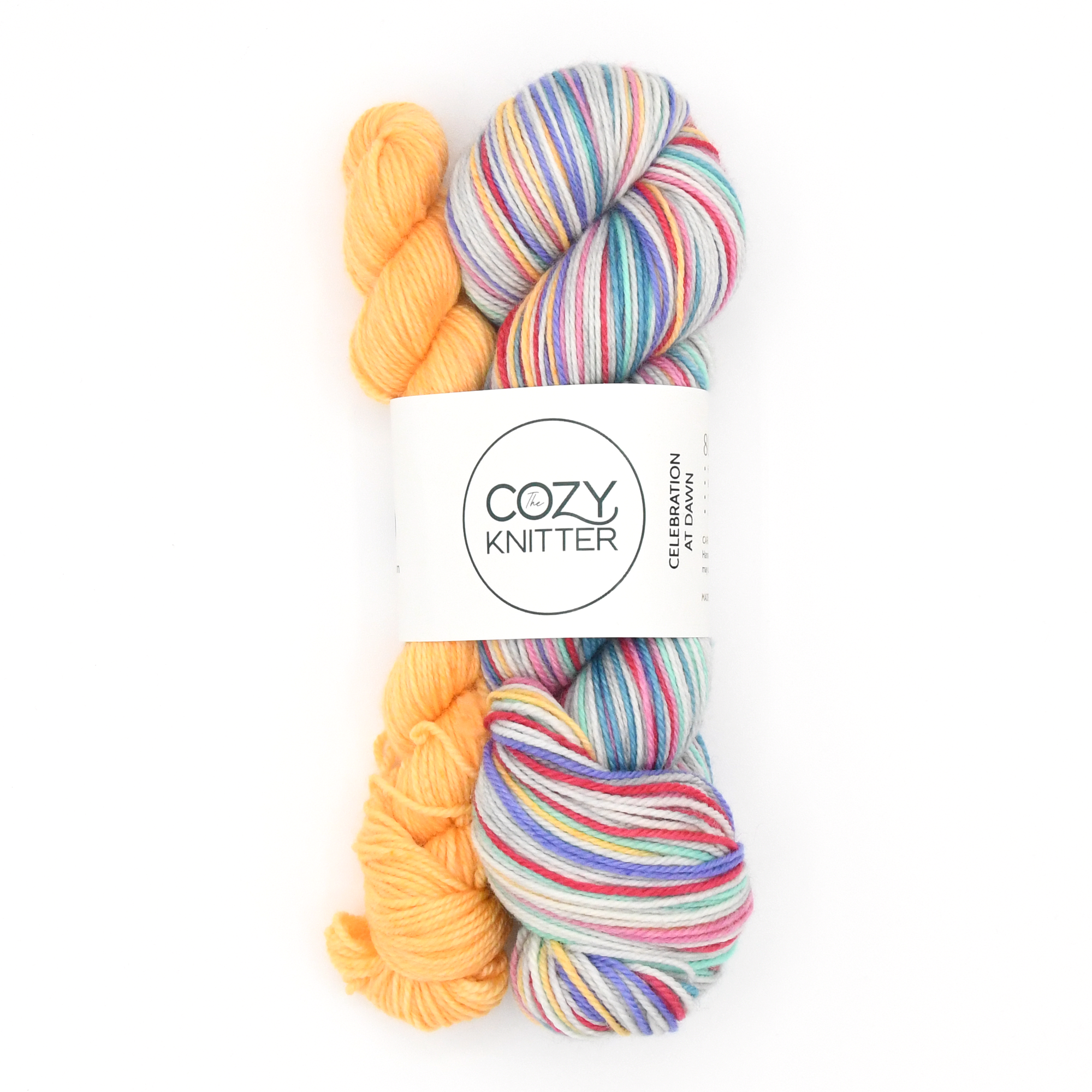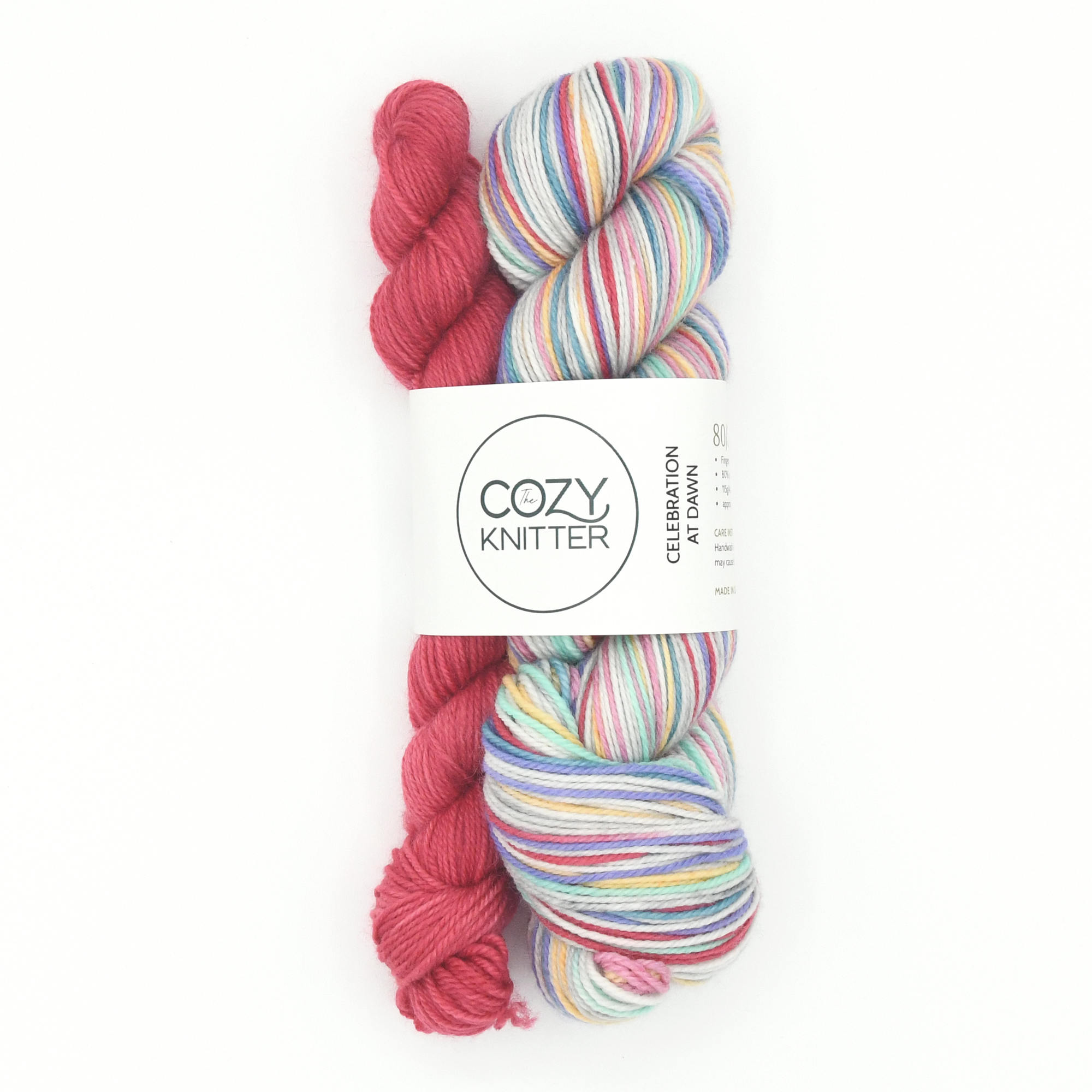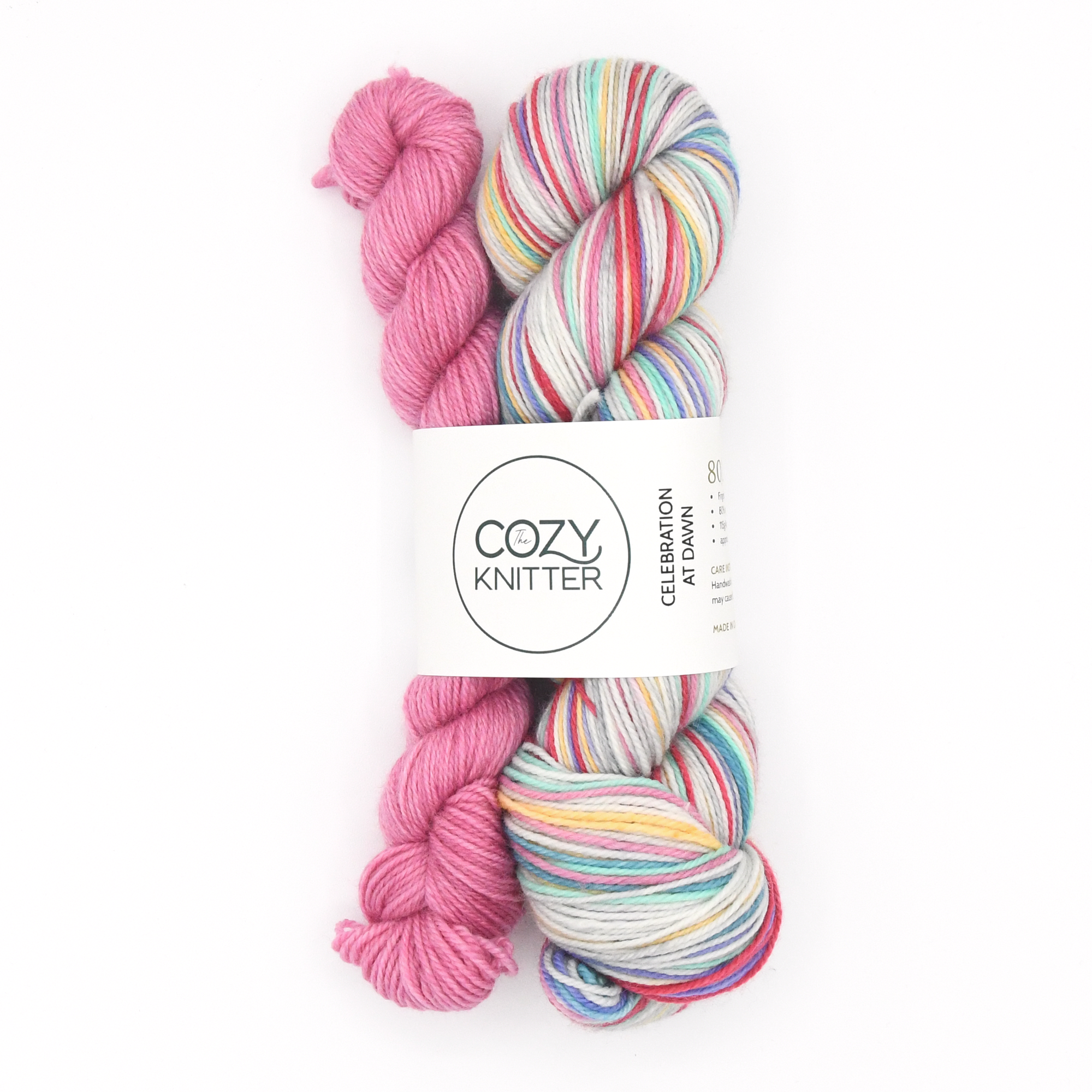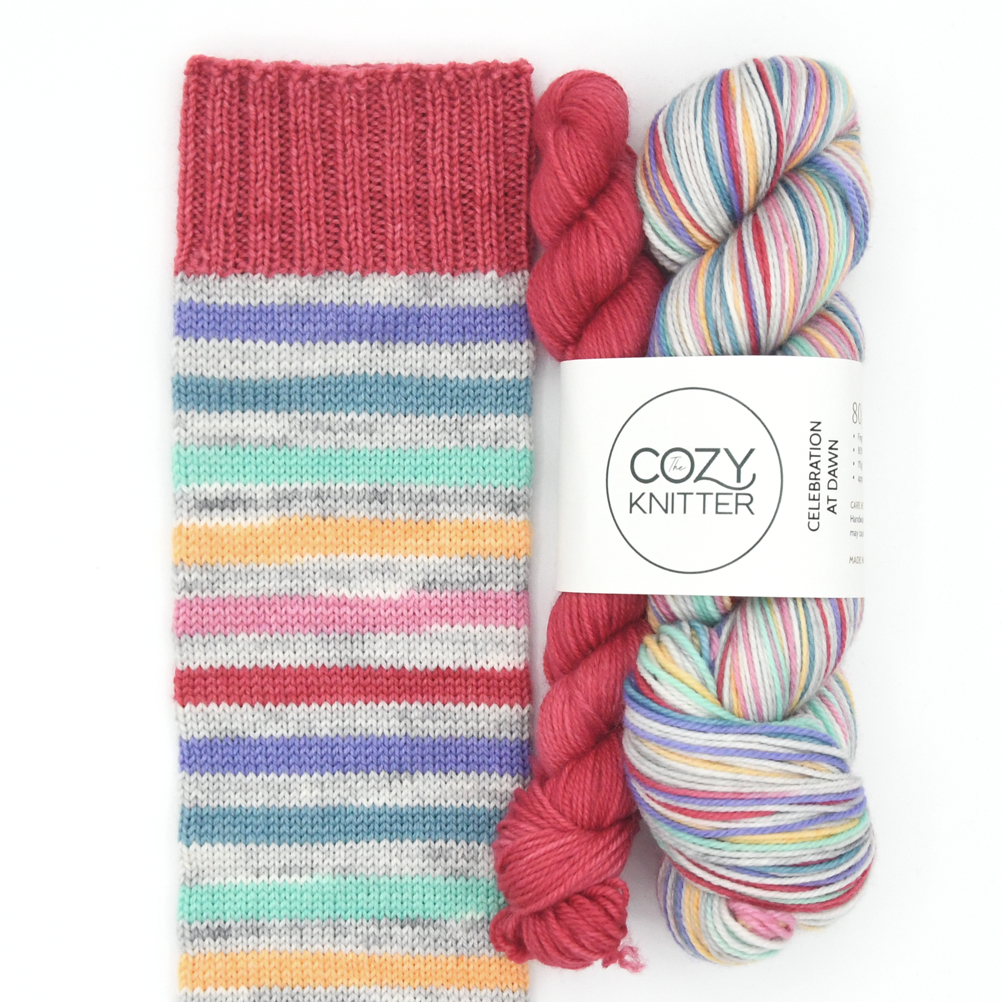 CELEBRATION AT DAWN is a 12-striping colourway, alternating colour and tonal grey stripes. This colour way has the same stripe sequence as CELEBRATION and CELEBRATE THE NIGHT on only they have white/black stripes whereas this has grey. You will also receive a co-ordinating mini-skein for your toes/heels/cuffs in one of the 6 accent colours. Each stripe is approximately 4 rows depending on gauge on a 64 st. sock.