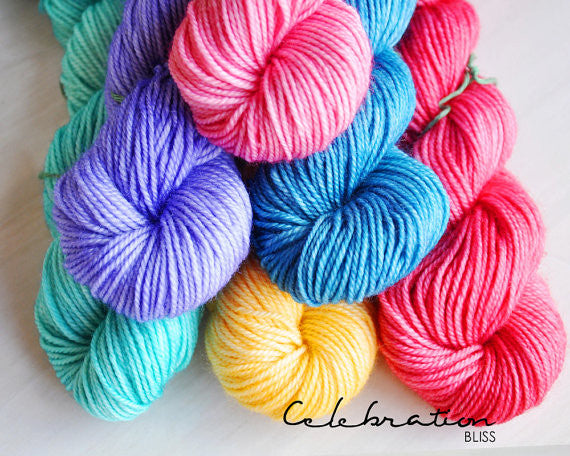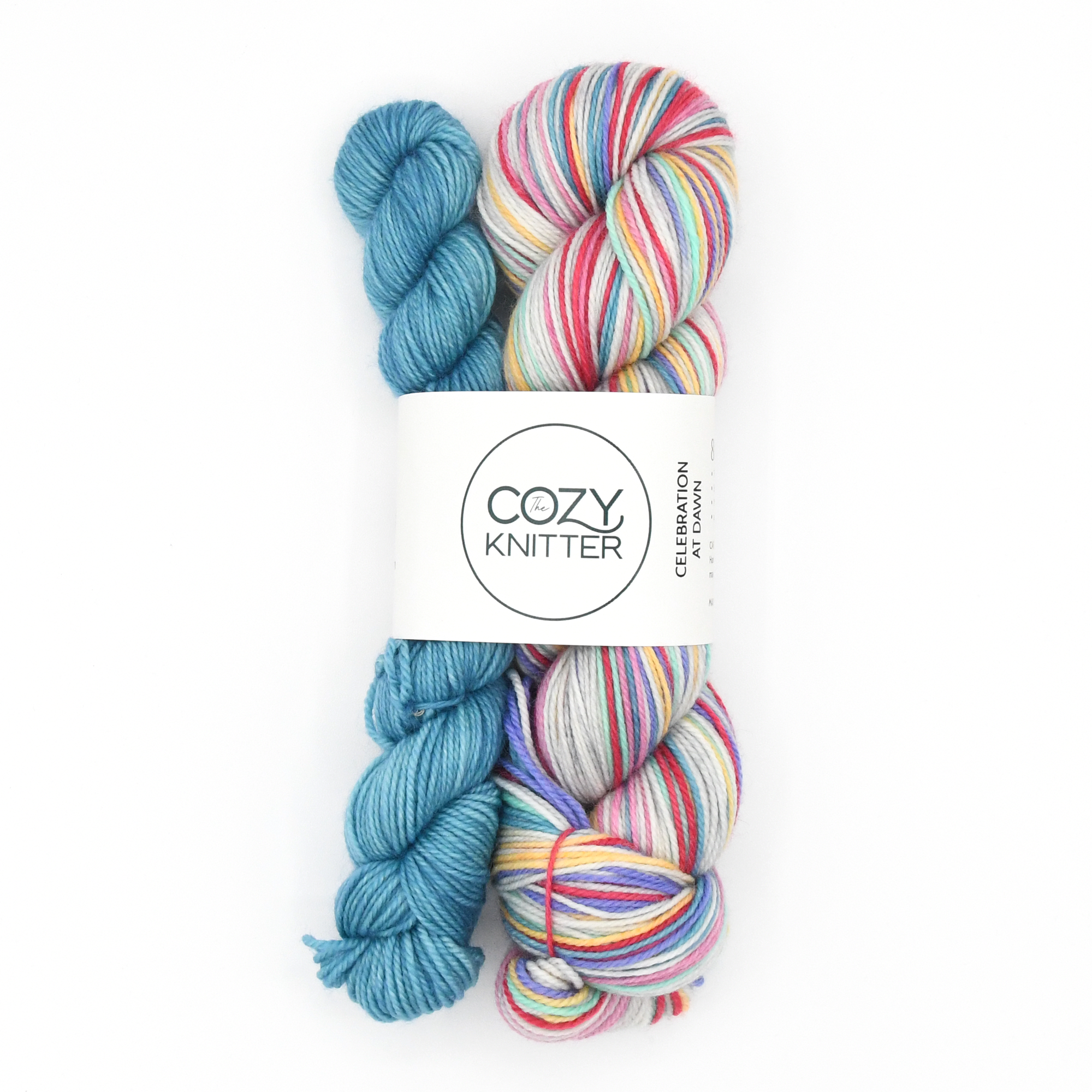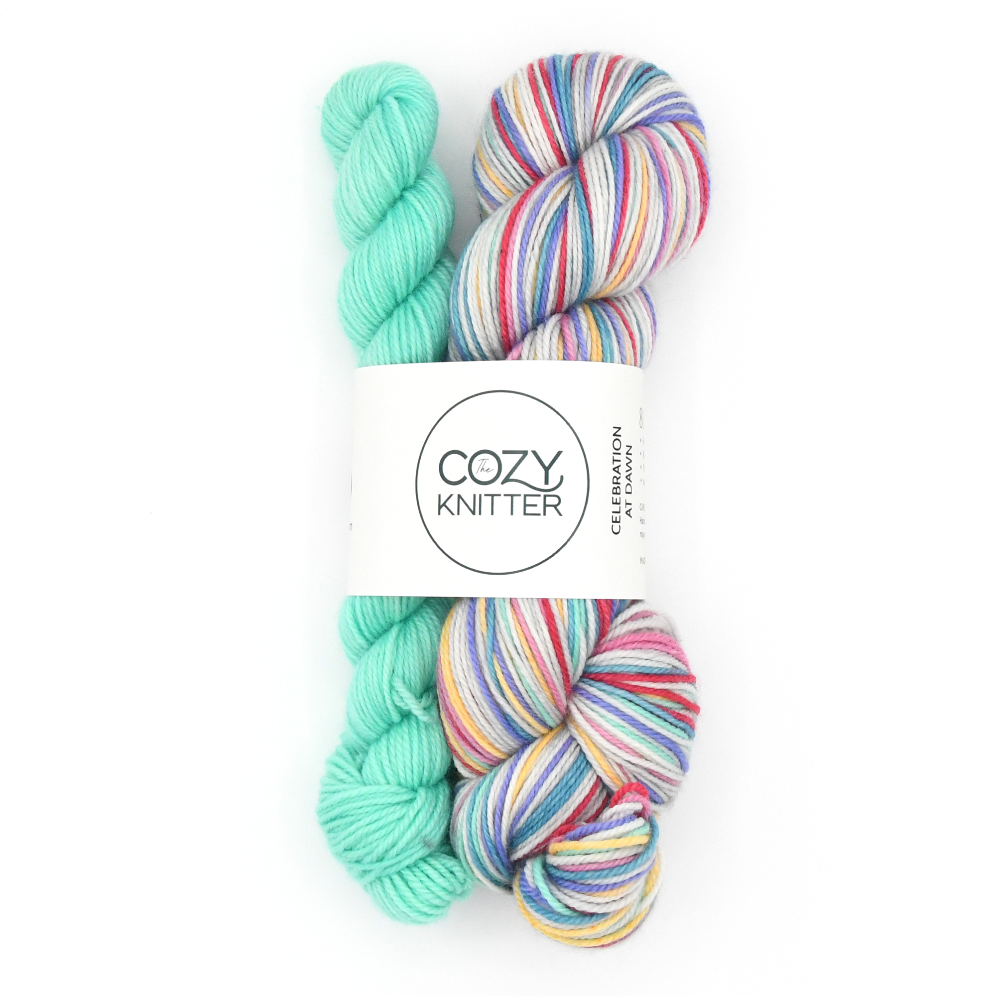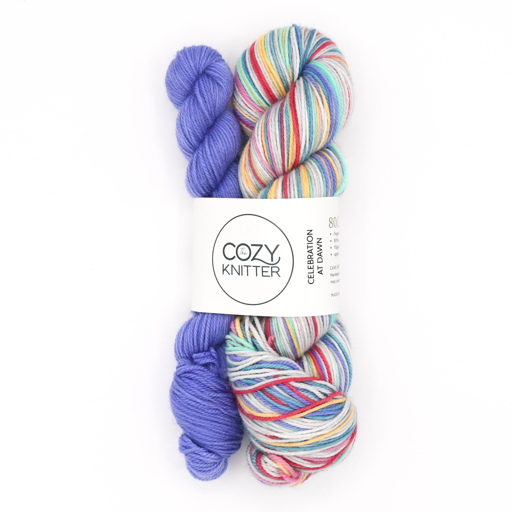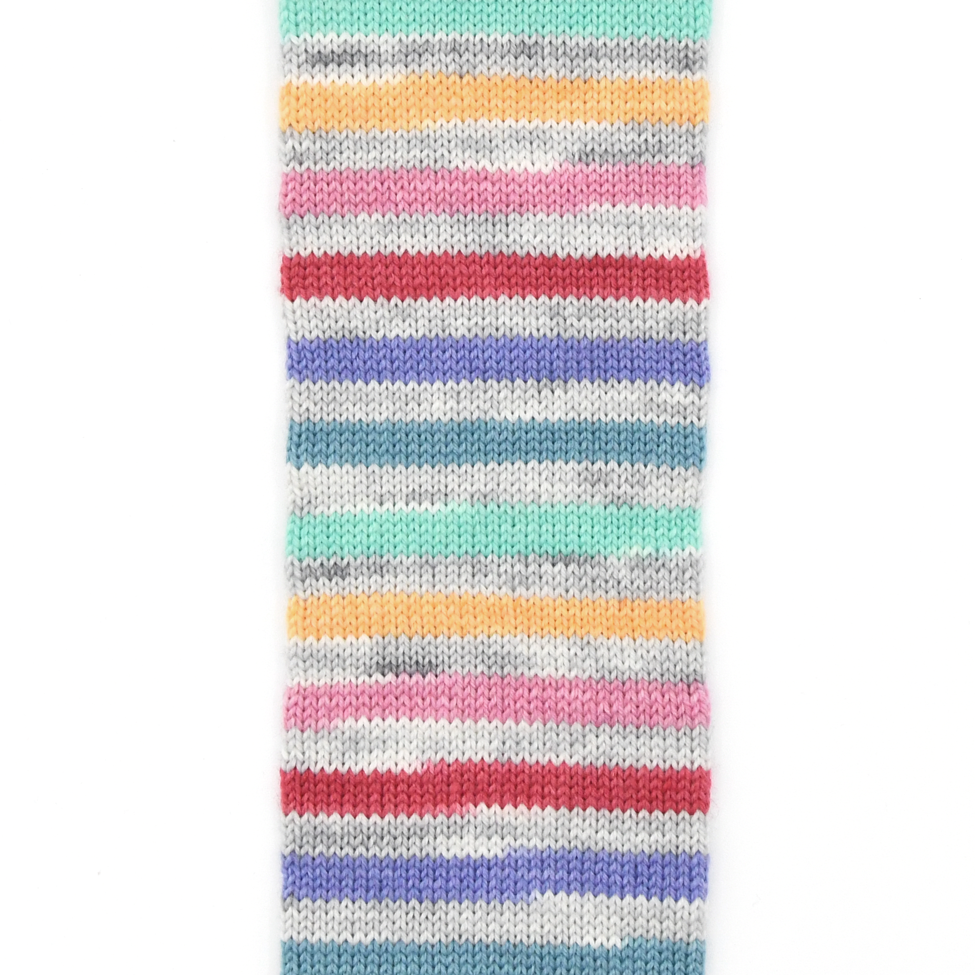CELEBRATION AT DAWN is a 12-striping colourway, alternating colour and tonal grey stripes. This colour way has the same stripe sequence as CELEBRATION and CELEBRATE THE NIGHT on only they have white/black stripes whereas this has grey. You will also receive a co-ordinating mini-skein for your toes/heels/cuffs in one of the 6 accent colours. Each stripe is approximately 4 rows depending on gauge on a 64 st. sock.