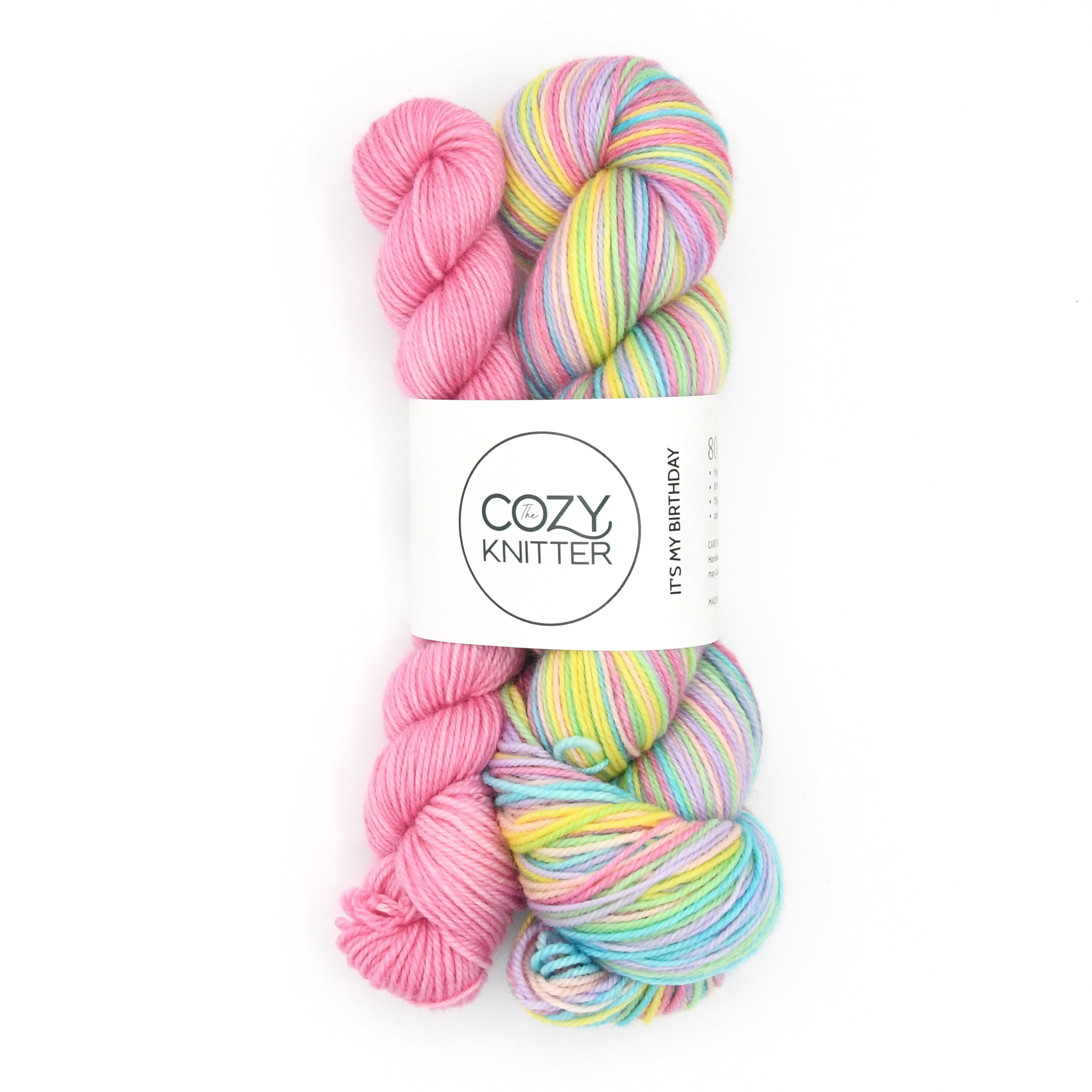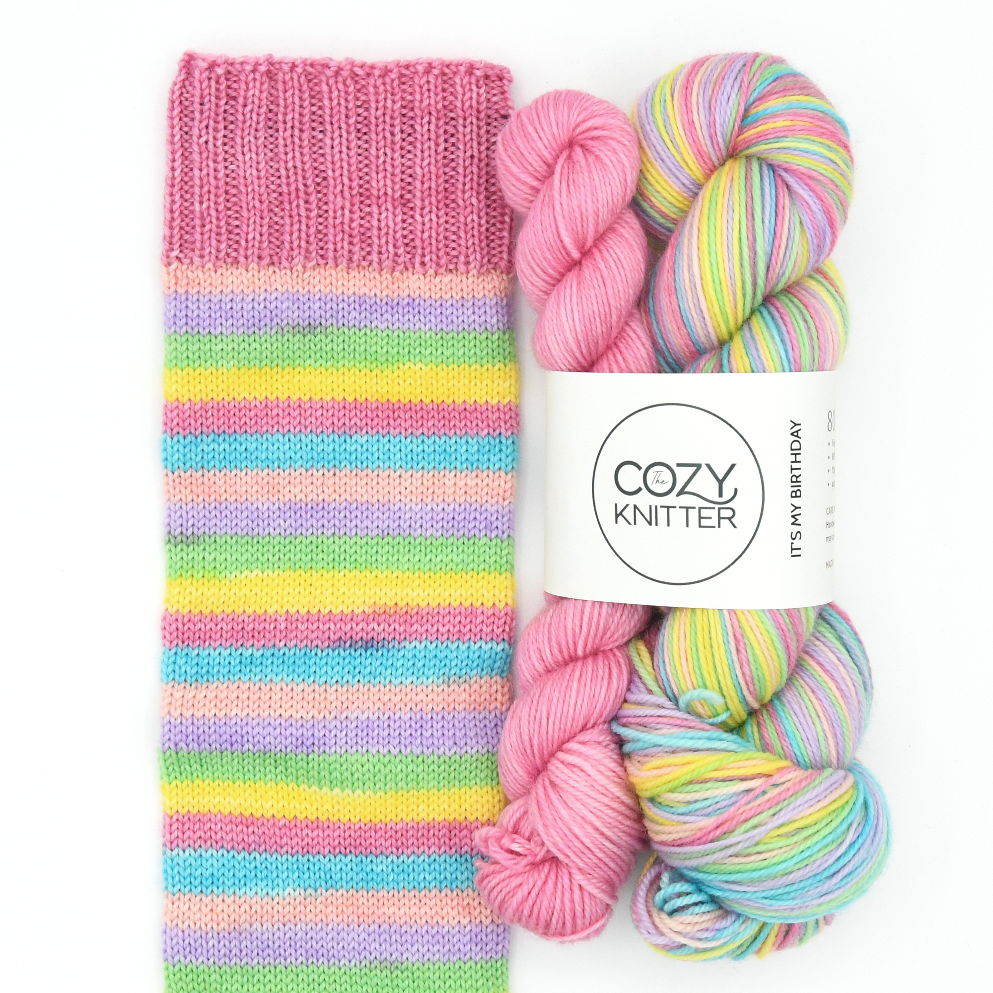 IT'S MY BIRTHDAY is a special edition colourway I released in June to celebrate my birthday. You will also receive a co-ordinating mini-skein for your toes/heels/cuffs in pink. Each stripe is approximately 4 rows depending on gauge on a 64 st. sock.