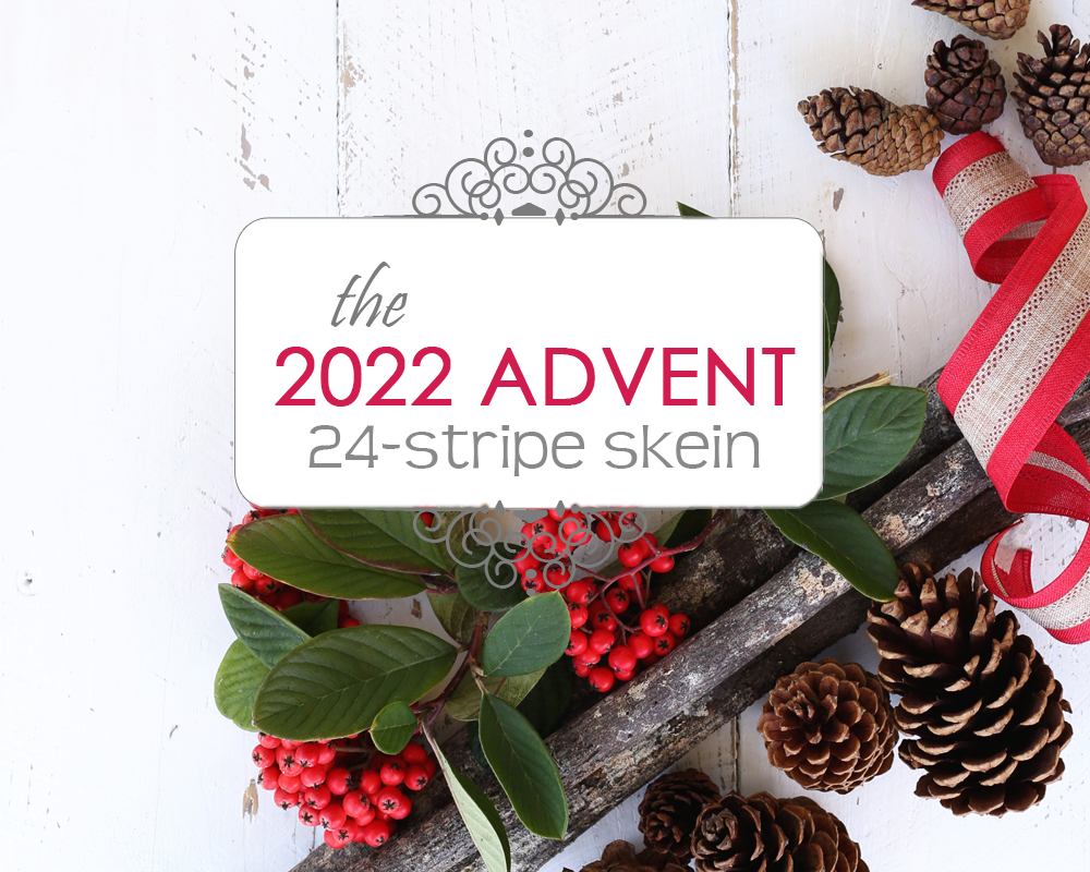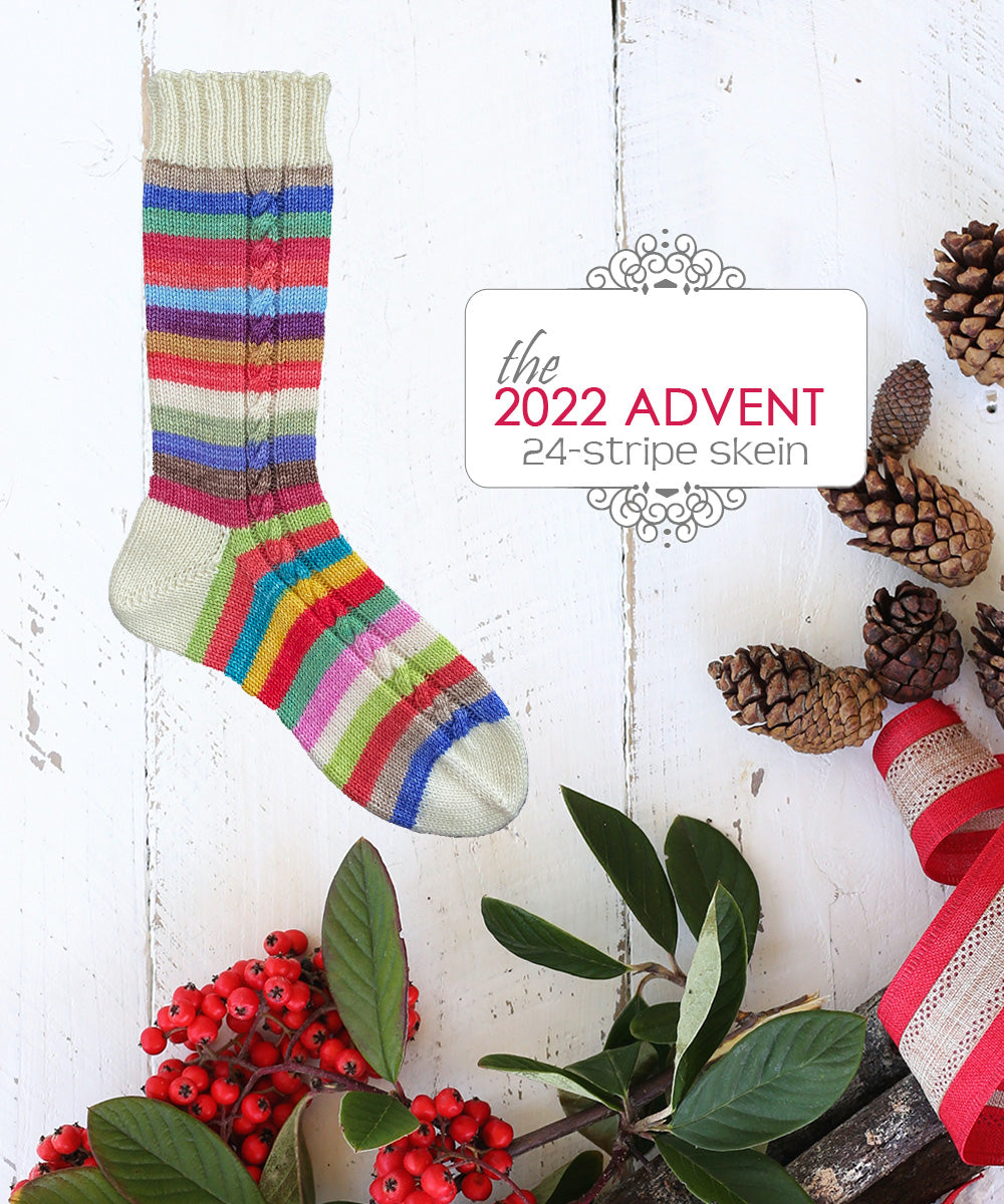 I first came up with the idea of a 24-stripe advent skein in July 2018 as I was preparing my annual Christmas update. At the time I thought it would be fun to offer an alternative to the traditional mini-skein calendars. Originally I had hoped maybe 25-50 knitters would want to join in. To my surprise this concept was welcomed with open arms by knitters and close to 400 participated that first year. In 2021 we were up to a mind boggling 2000 participants!  I am so glad that this is becoming a tradition for so many of you and I cannot wait for you to see this years version.