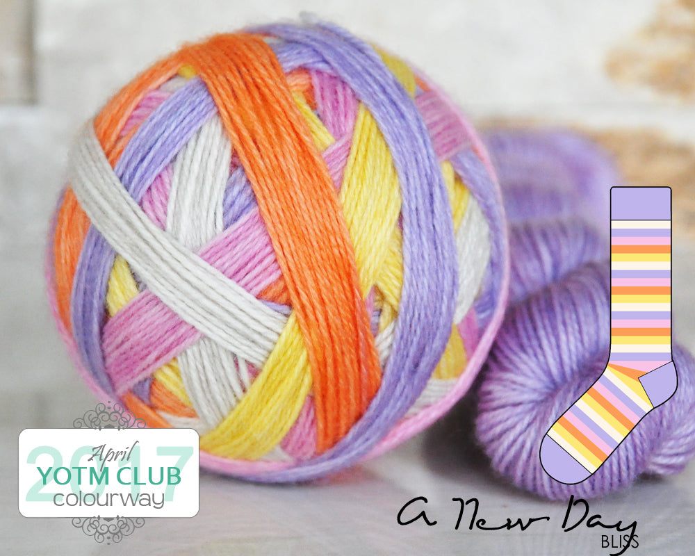 A NEW DAY was the April 2017 YOTM club colourway. 1 skein of 5-stripe self-striping sock yarn each stripe is approximately 4-5 rows depending on gauge on a 64 st. sock.
