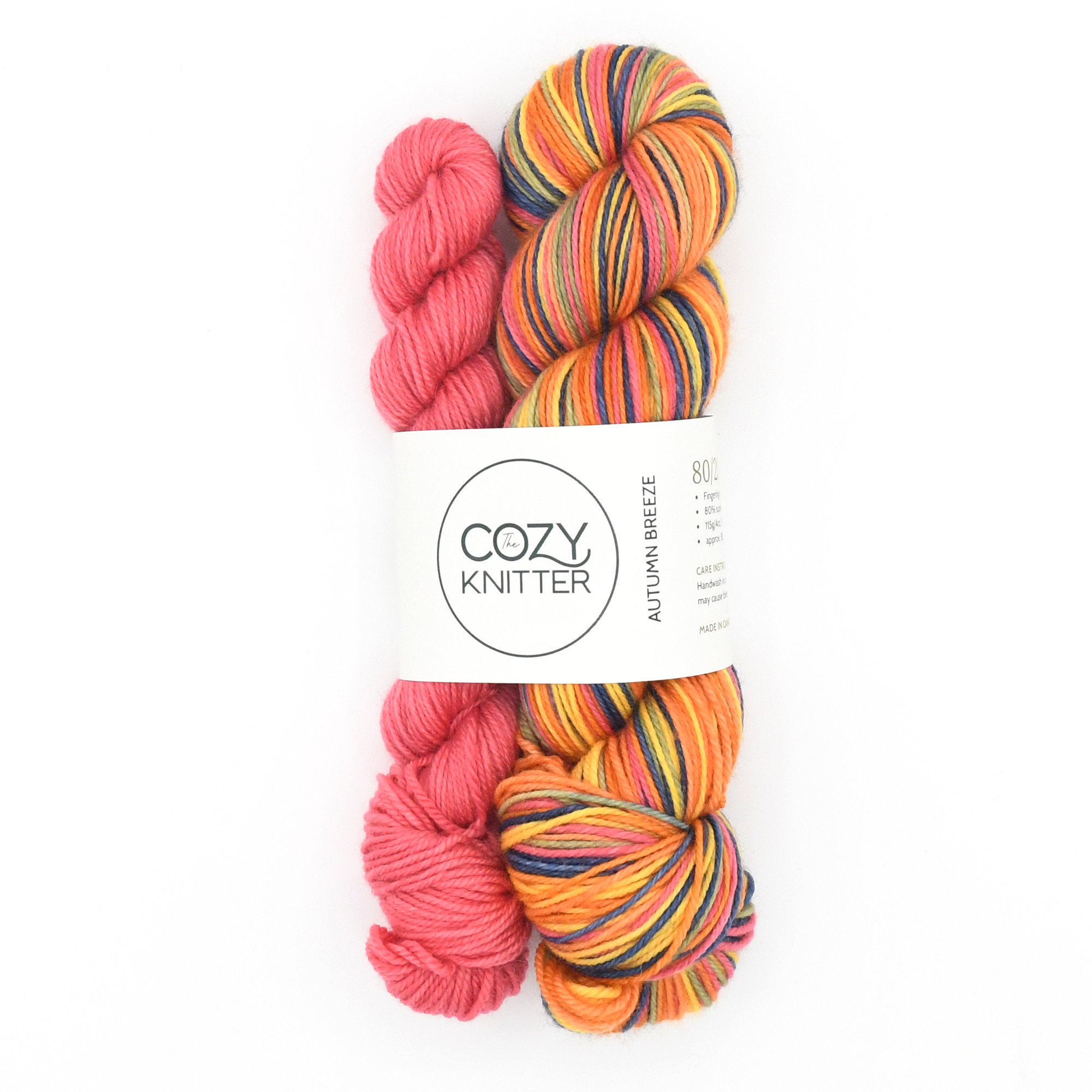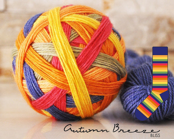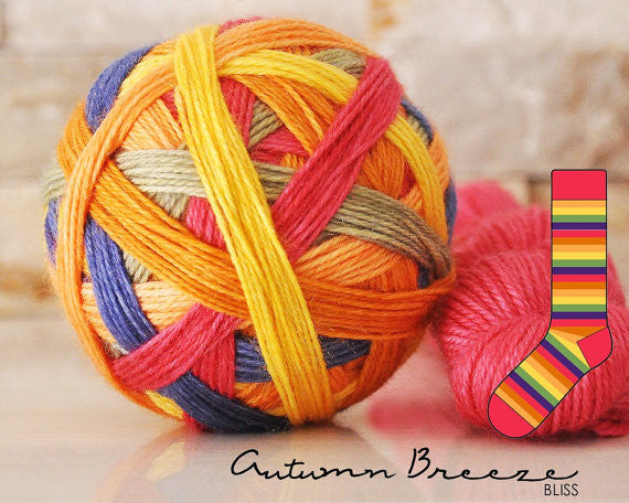 AUTUMN BREEZE is the perfect fall colourway the shades of orange, red and blue remind me of the changing leaves. 1 skein of 6-self-striping sock yarn each stripe is approximately 4 rows depending on gauge on a 64 st. sock.