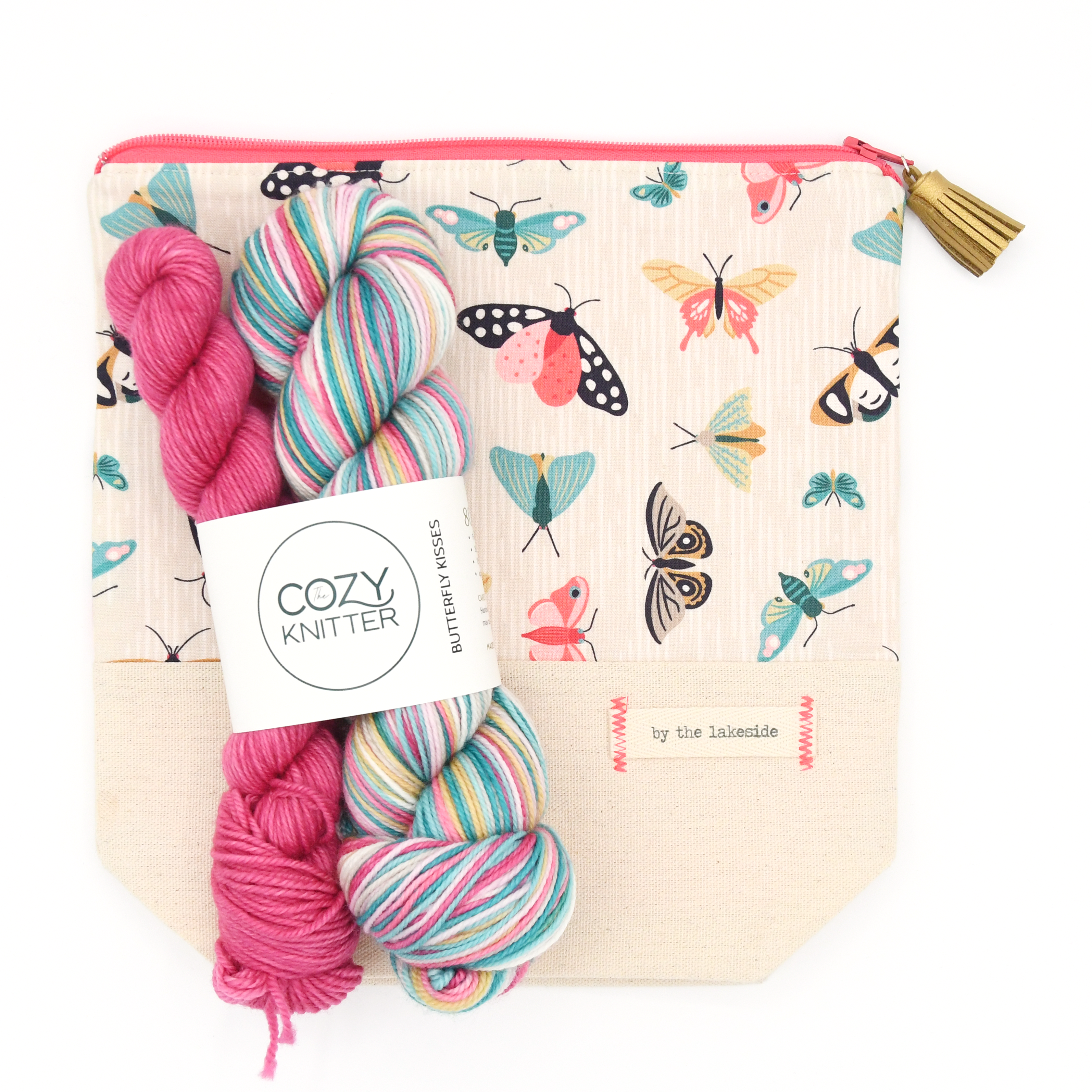 BUTTERFLY KISSES Kit is a collaboration with Sandy By The Lakeside You will receive a By the Lakeside project bag and a skein of The Cozy Knitter self-striping yarn.