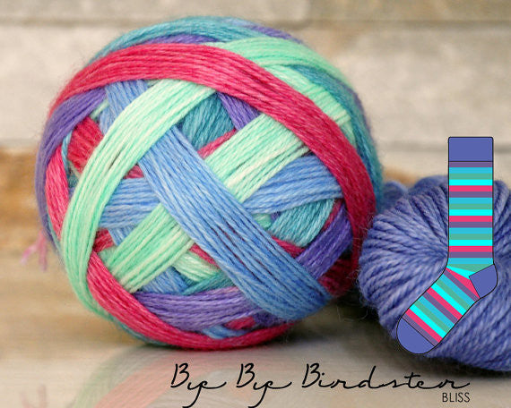 BYE BYE BIRDSTER is 1 skein of self-striping sock yarn  each stripe is approximately 4 rows depending on gauge on a 64 st. sock.