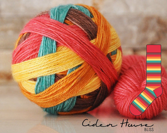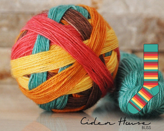 CIDER HOUSE 1 skein of 5-self-striping sock yarn each stripe is approximately 5-6 rows depending on gauge on a 64 st. sock. 1 skein is enough to knit a pair of socks in most sizes