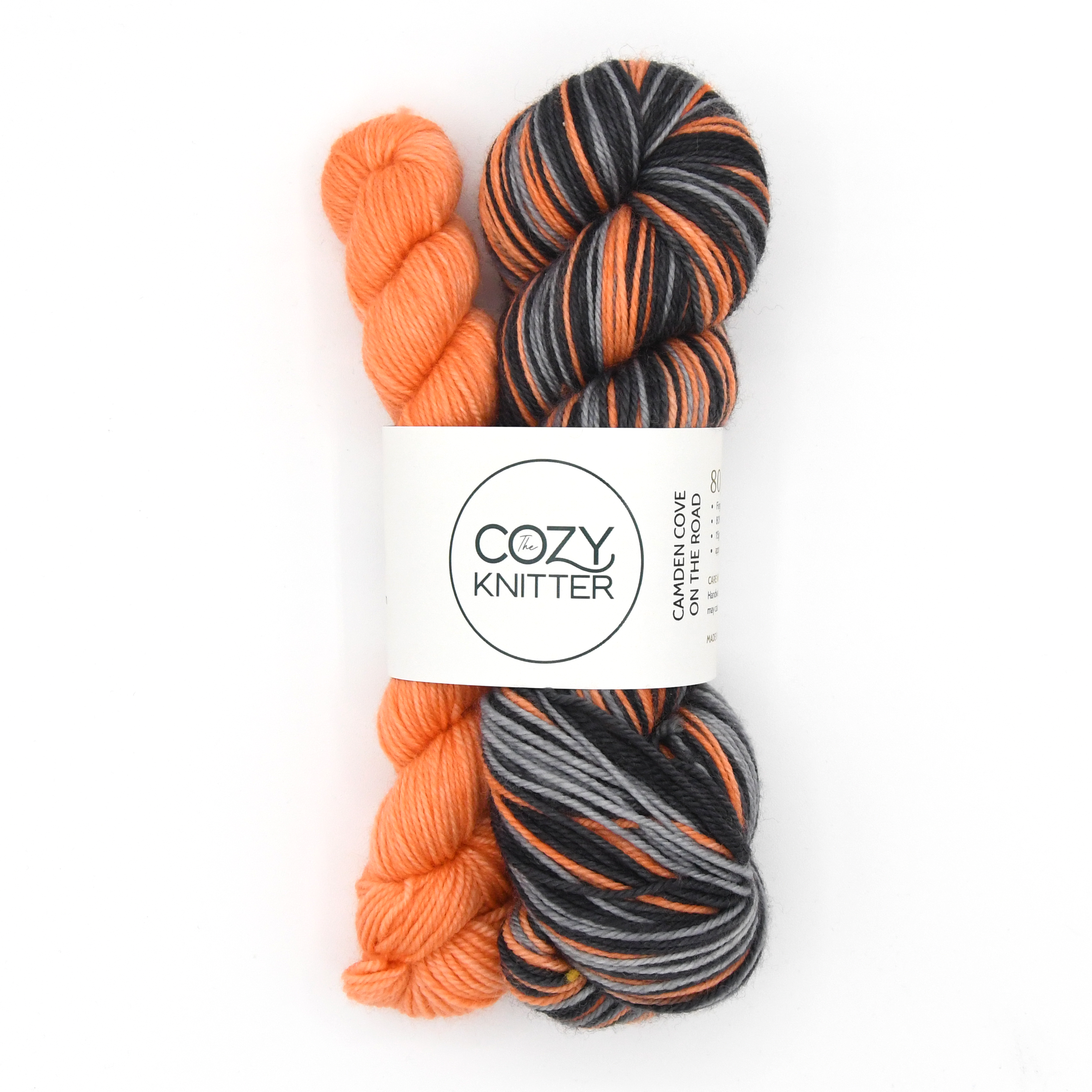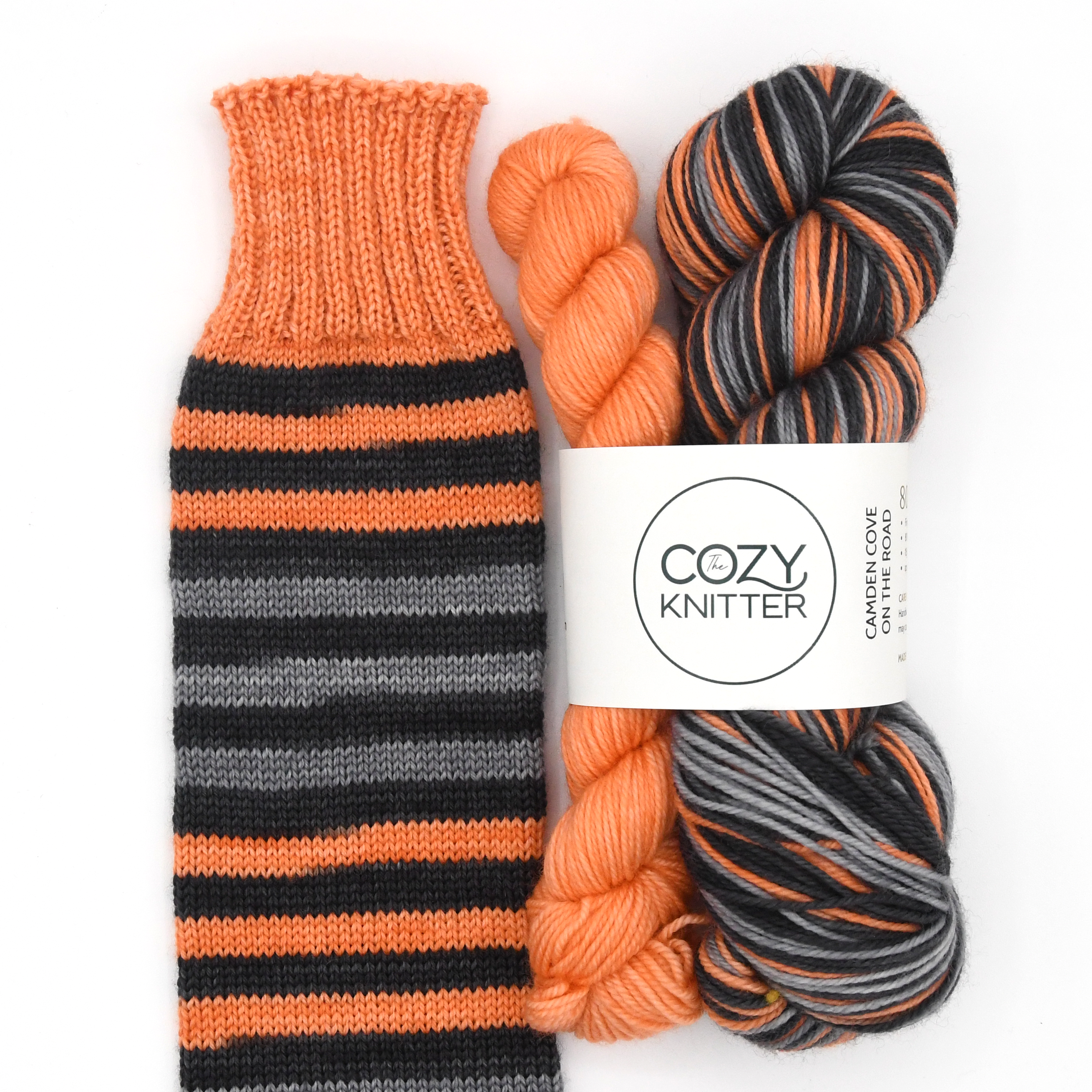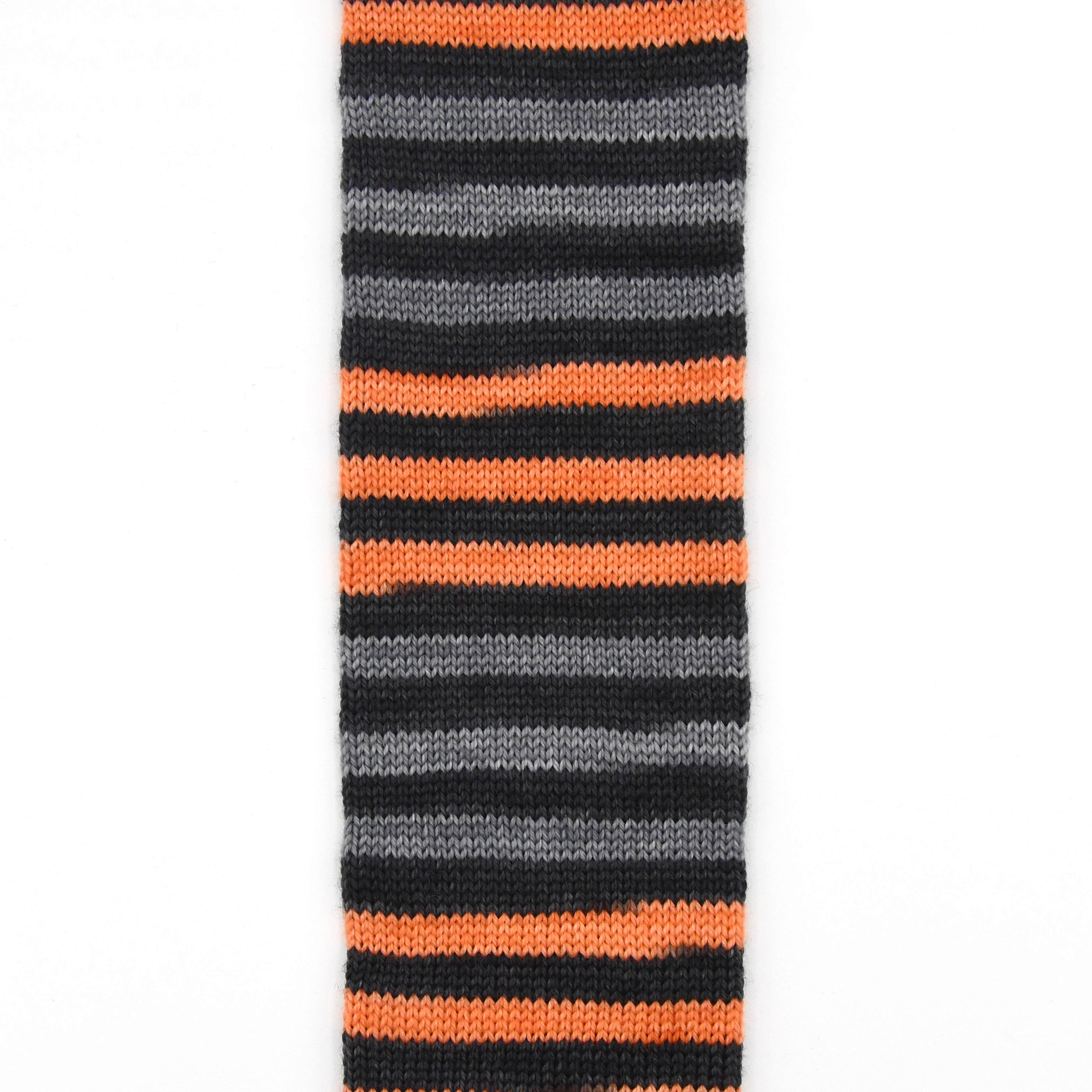 CAMDEN COVE - ON THE ROAD is a part of a series of 12 stripe sport themed colourways. This colourway has the same stripe sequence as CAMDEN COVE but with grey instead of white.  Every other stripe is black, the alternating 6 stripes are in blocks of 3 stripes each of grey and orange. You will also receive a co-ordinating mini-skein for your toes/heels/cuffs in the orange. Each stripe is approximately 4 rows depending on gauge on a 64 st. sock.