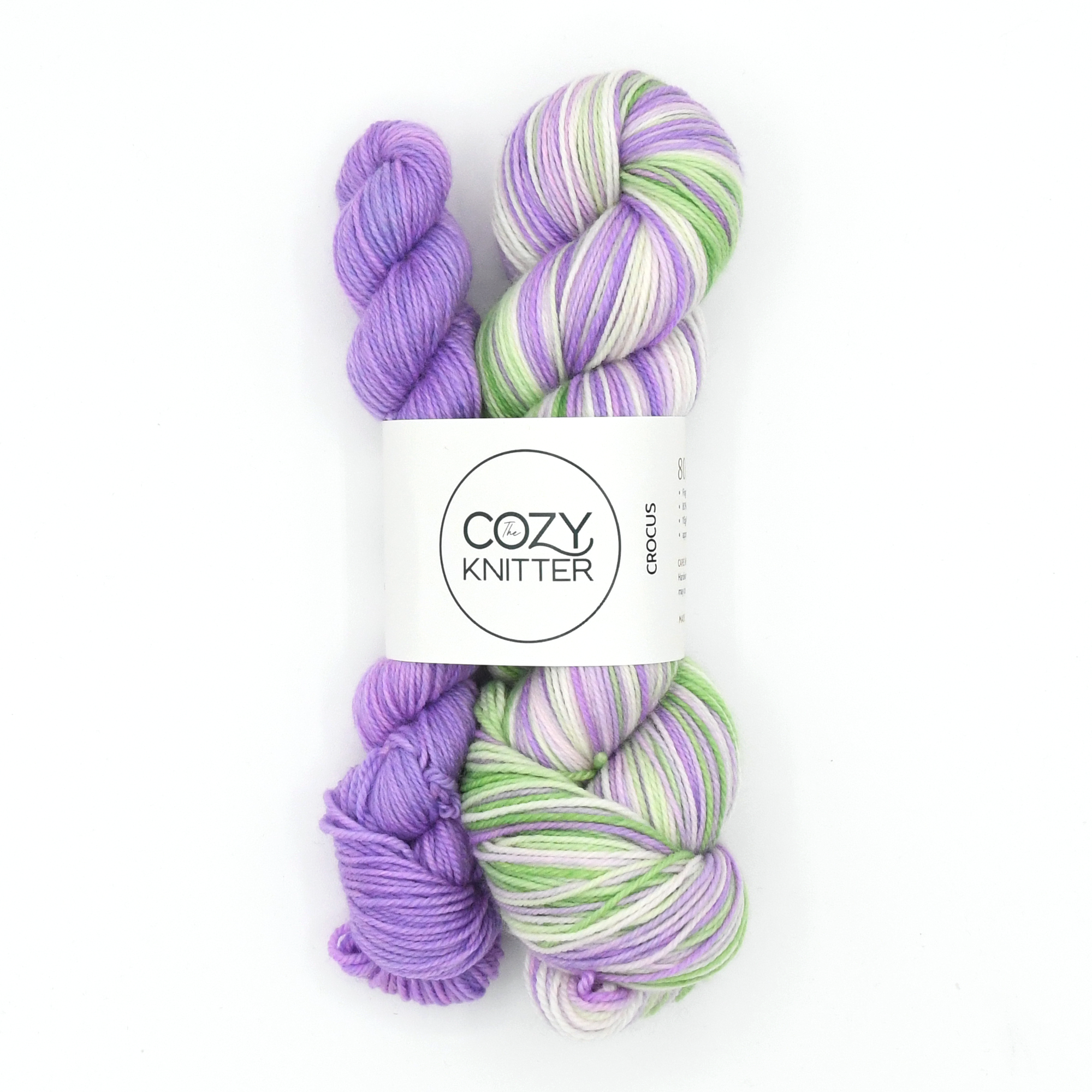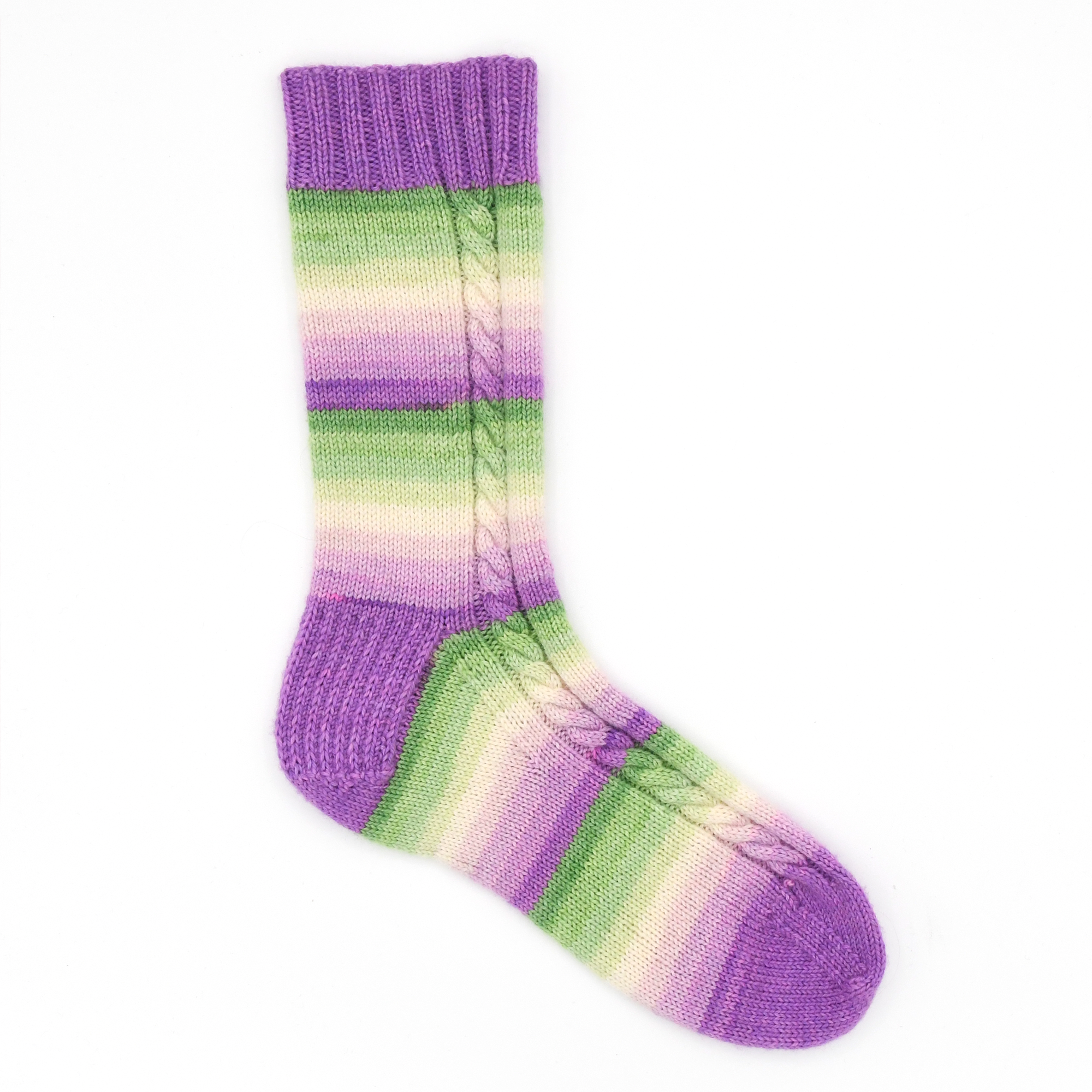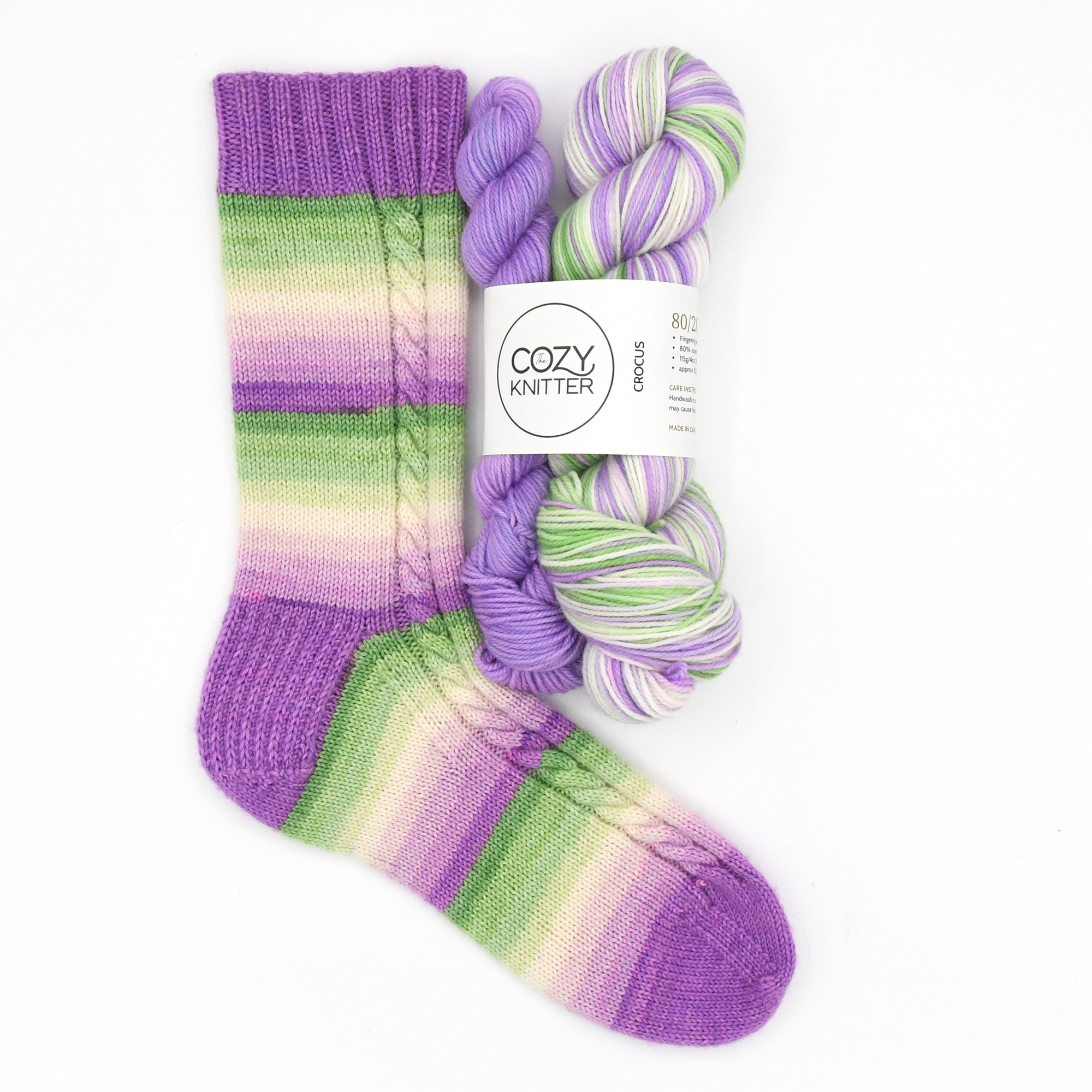 CROCUS has 9 stripes. You will also receive a co-ordinating mini-skein for your toes/heels/cuffs in purple. Each stripe is approximately 4 rows depending on gauge on a 64 st. sock.