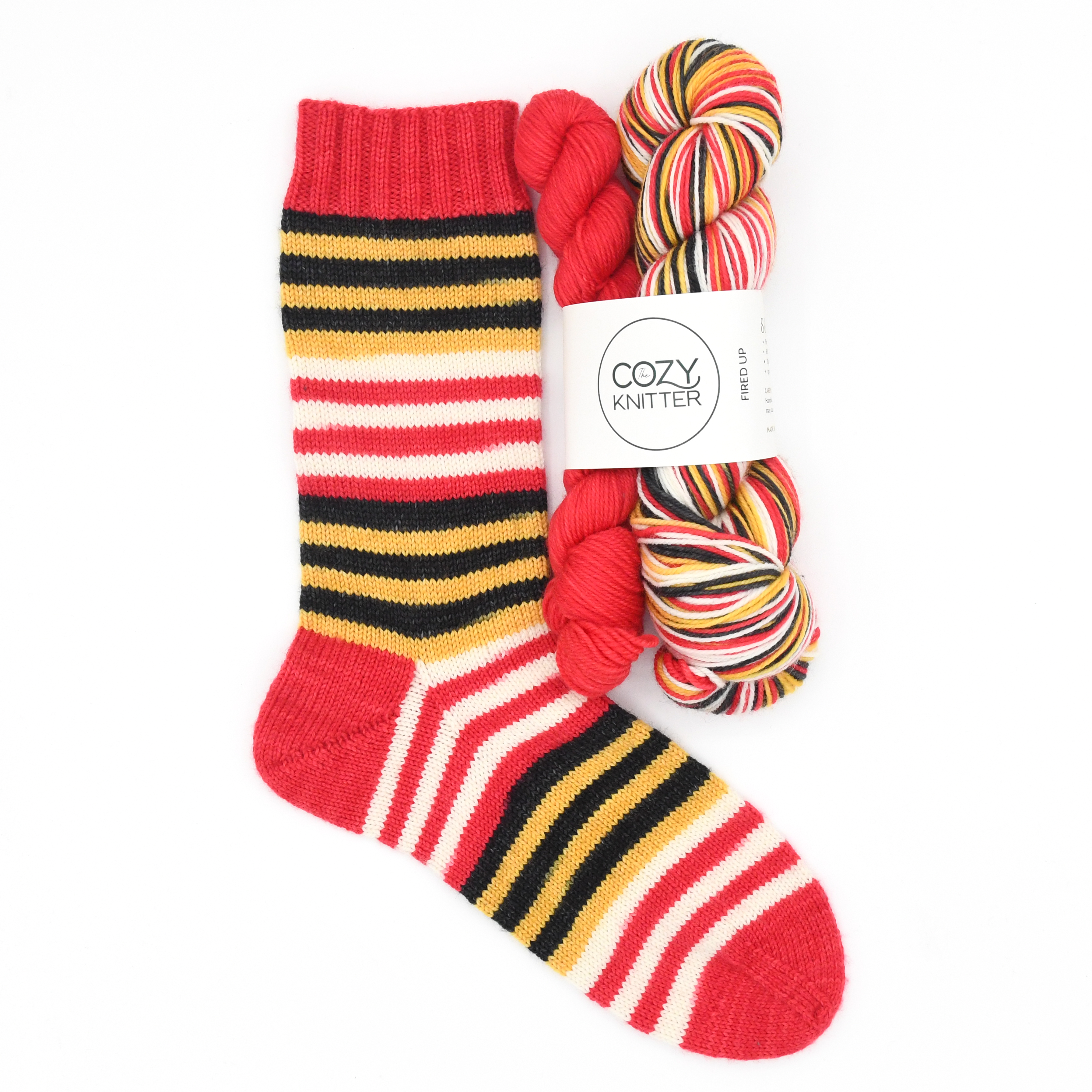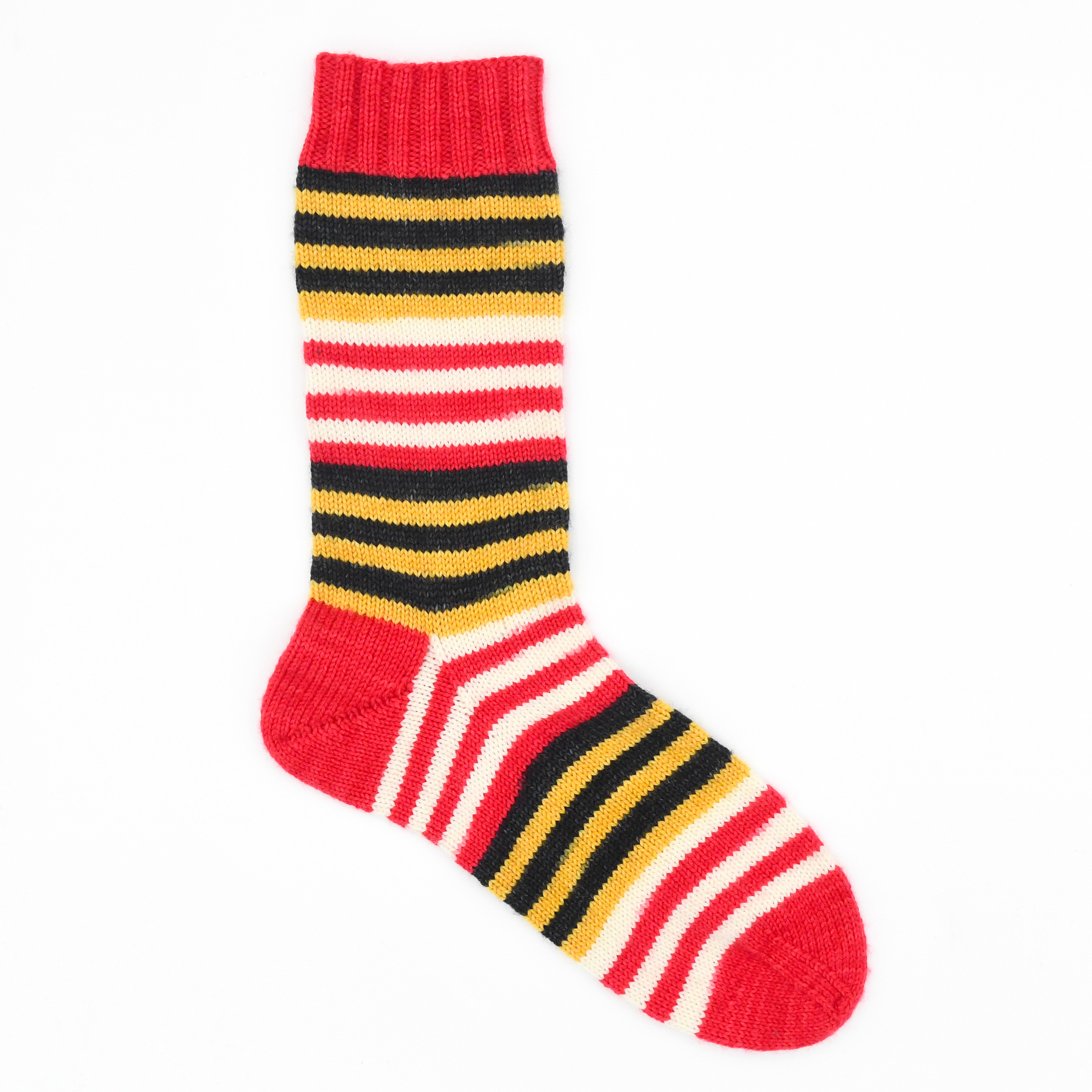 FIRED UP is a part of a series of 12 stripe sport themed colourways. This colourway has 4 colours the 6 stripes alternate black and yellow, the other 6 alternate between red and white.. You will also receive a co-ordinating mini-skein for your toes/heels/cuffs in the red. Each stripe is approximately 4 rows depending on gauge on a 64 st. sock.