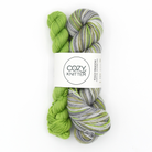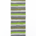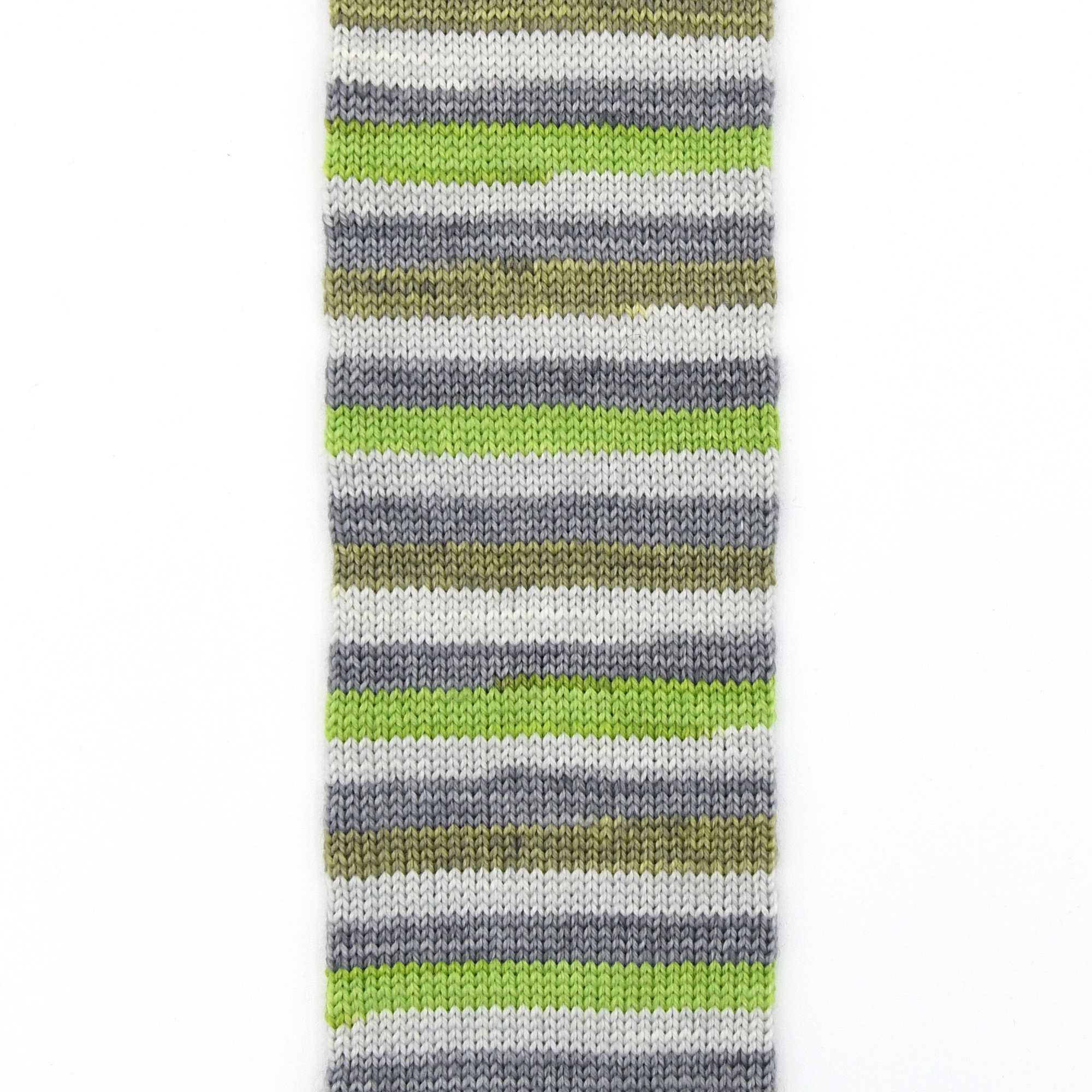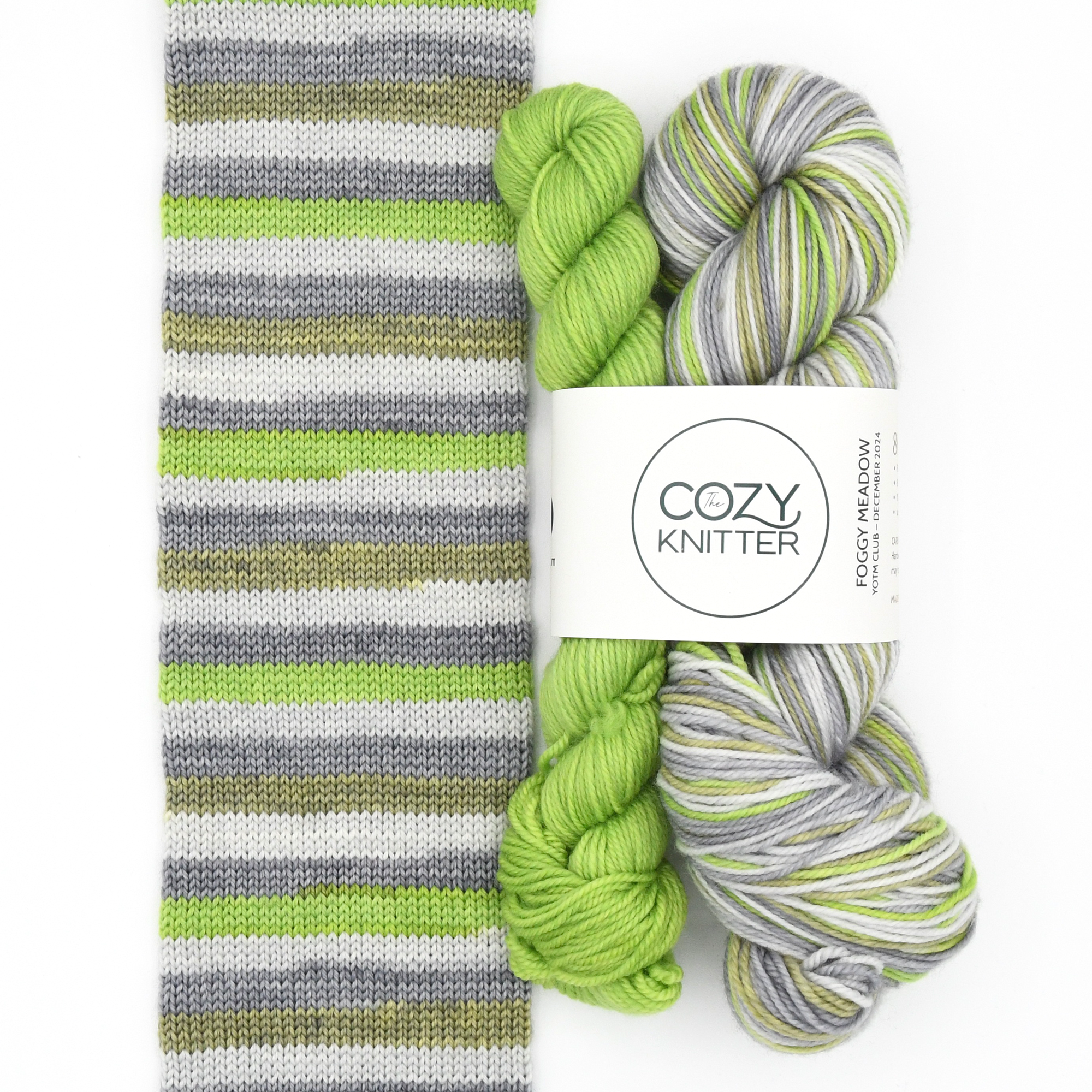 FOGGY MEADOW is the December 2024 YOTM club colourway. 1 skein of 6 stripe self-striping sock yarn each stripe is approximately 3-4rows depending on gauge on a 64 st. sock.