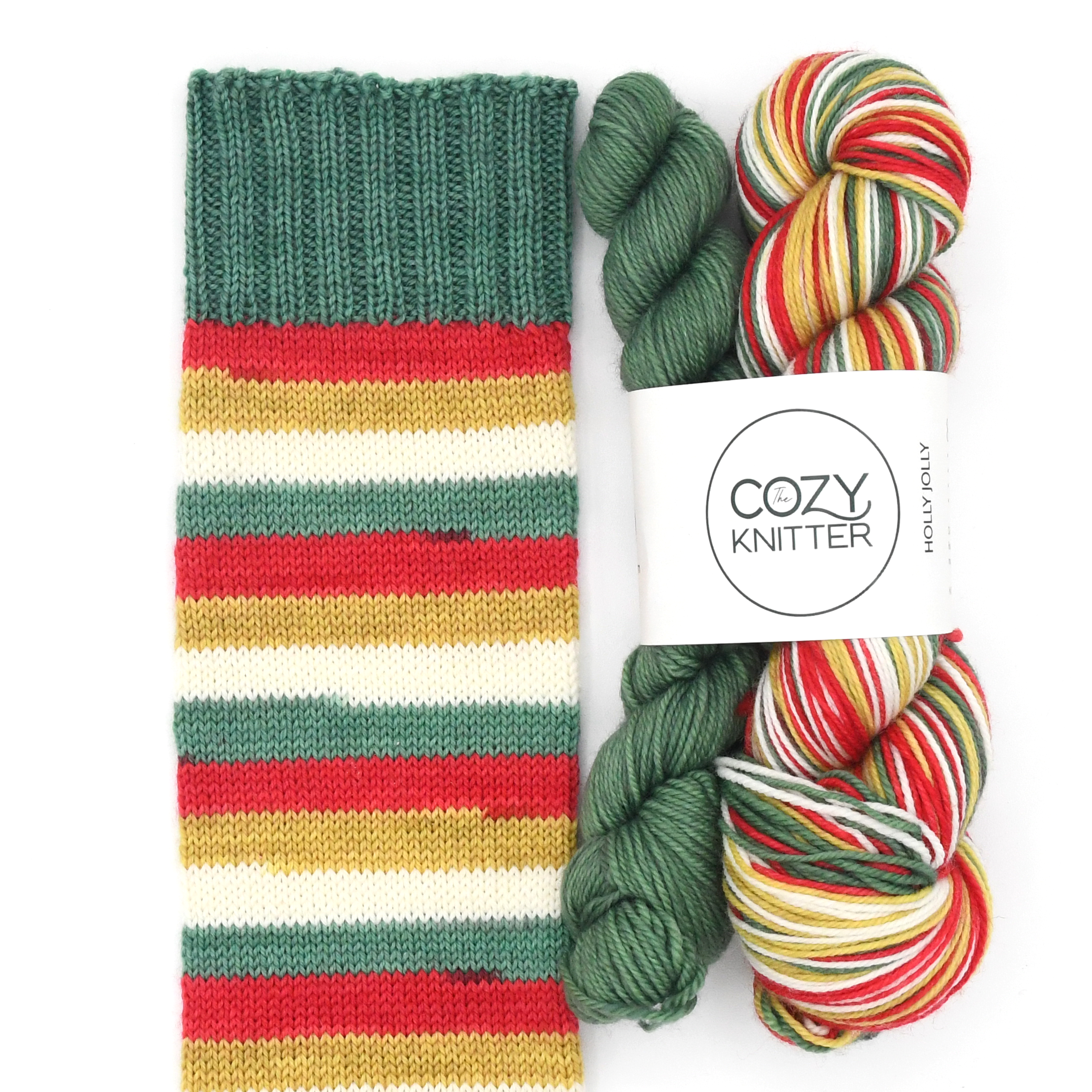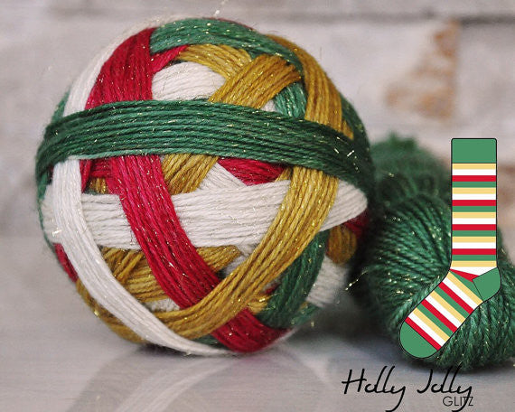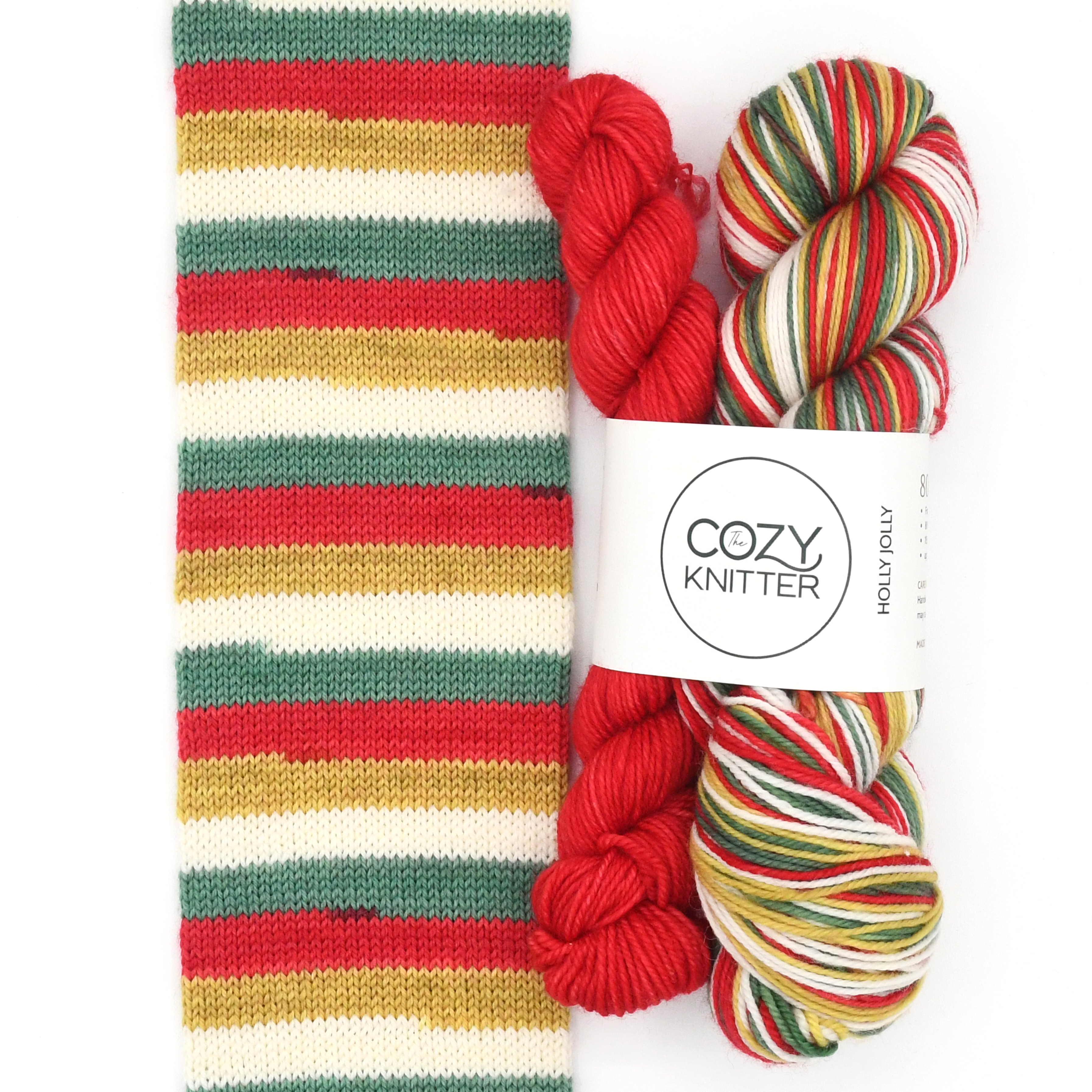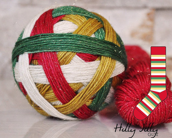 HOLLY JOLLY is 4-striping Christmas colourway. 1 skein of self-striping sock yarn {{ red | green | white | gold }} each stripe is approximately 6 rows depending on gauge on a 64 st. sock.