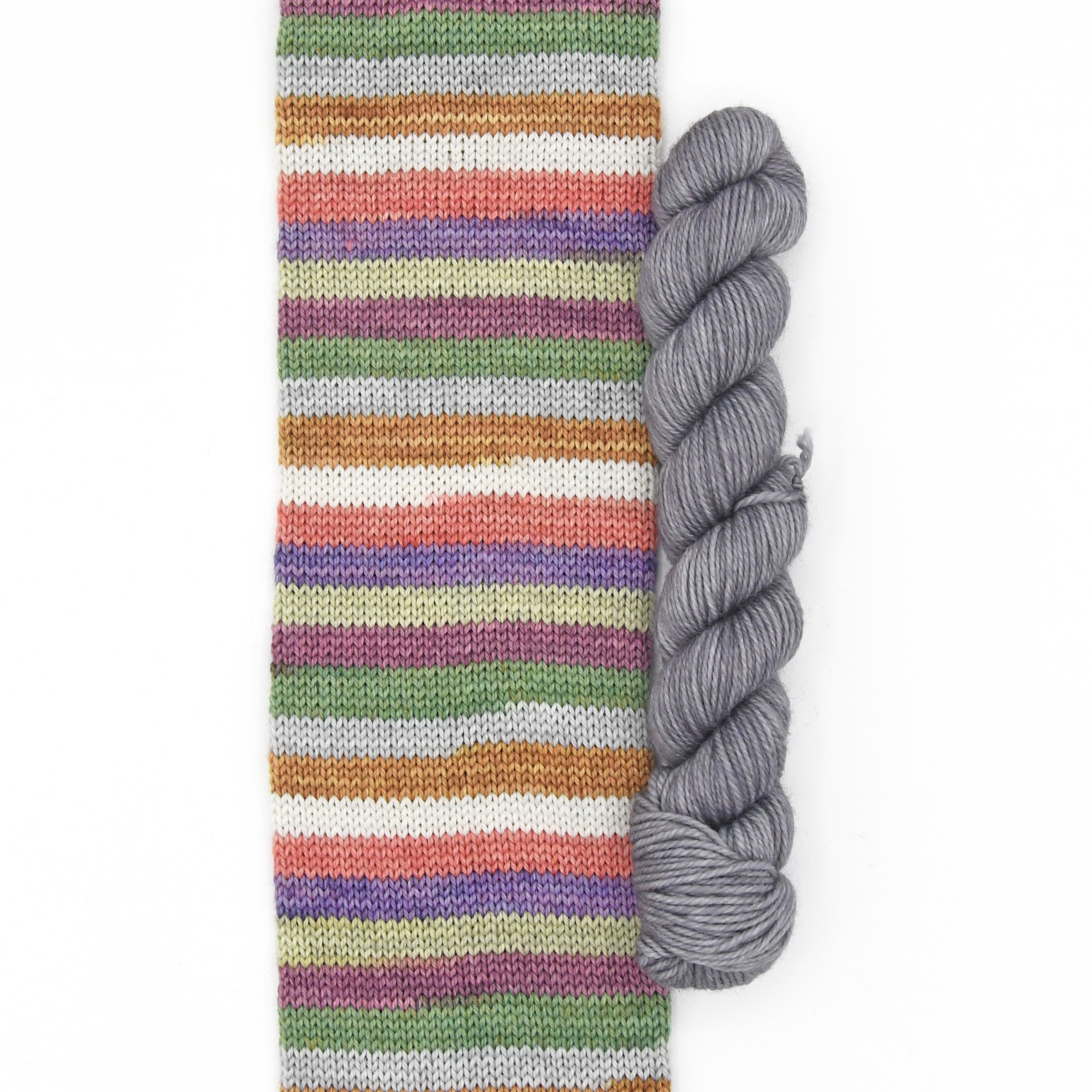 You will also receive a coordinating mini-skein for your toes/heels/cuffs in dusty grey.