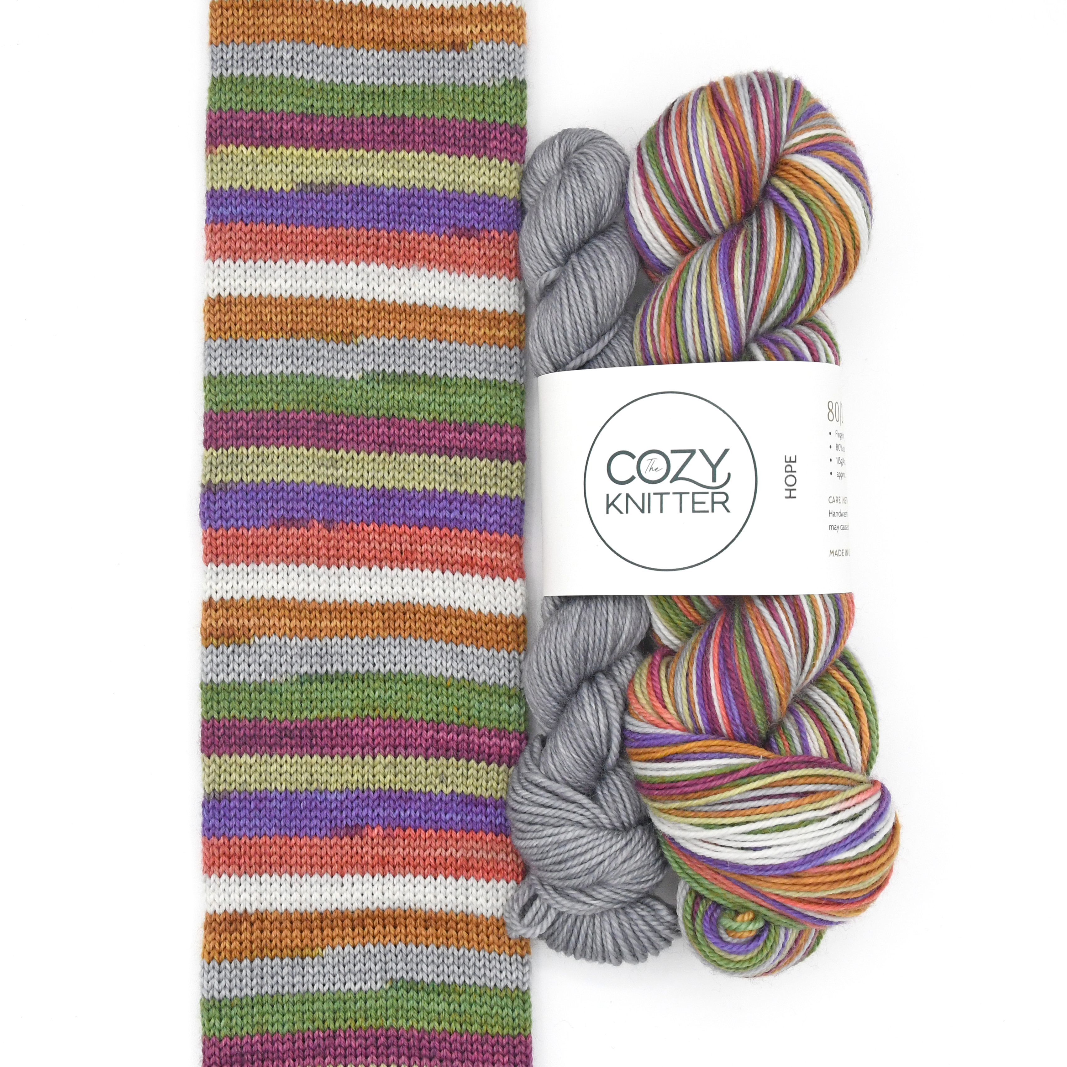 HOPE is the December 2020 YOTM club colourway. 1 skein of 8 stripe self-striping sock yarn each stripe is approximately 3-4 rows depending on gauge on a 64 st. sock.