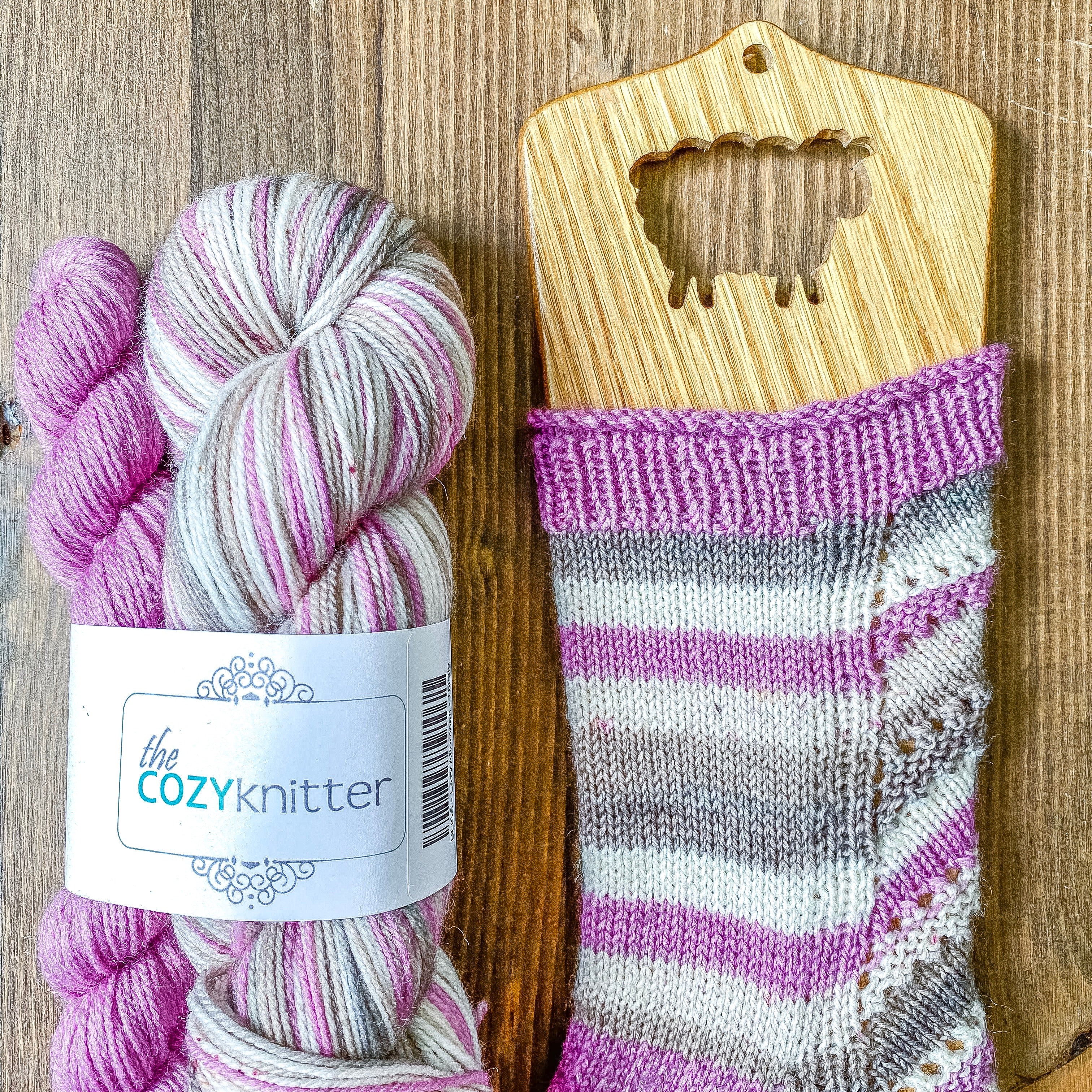 LAZY AFTERNOON is 1 skein of of 5-stripe self-striping sock yarn which was a collaboration with Tracie Millar of The Grocery Girls for Knit City Vancouver 2019 it comes with a perfectly matched mini-skein in thistle for your toes/heels/cuffs. Tracie designed the Lazy Afternoon Socks pattern which is available for purchase on Ravelry.