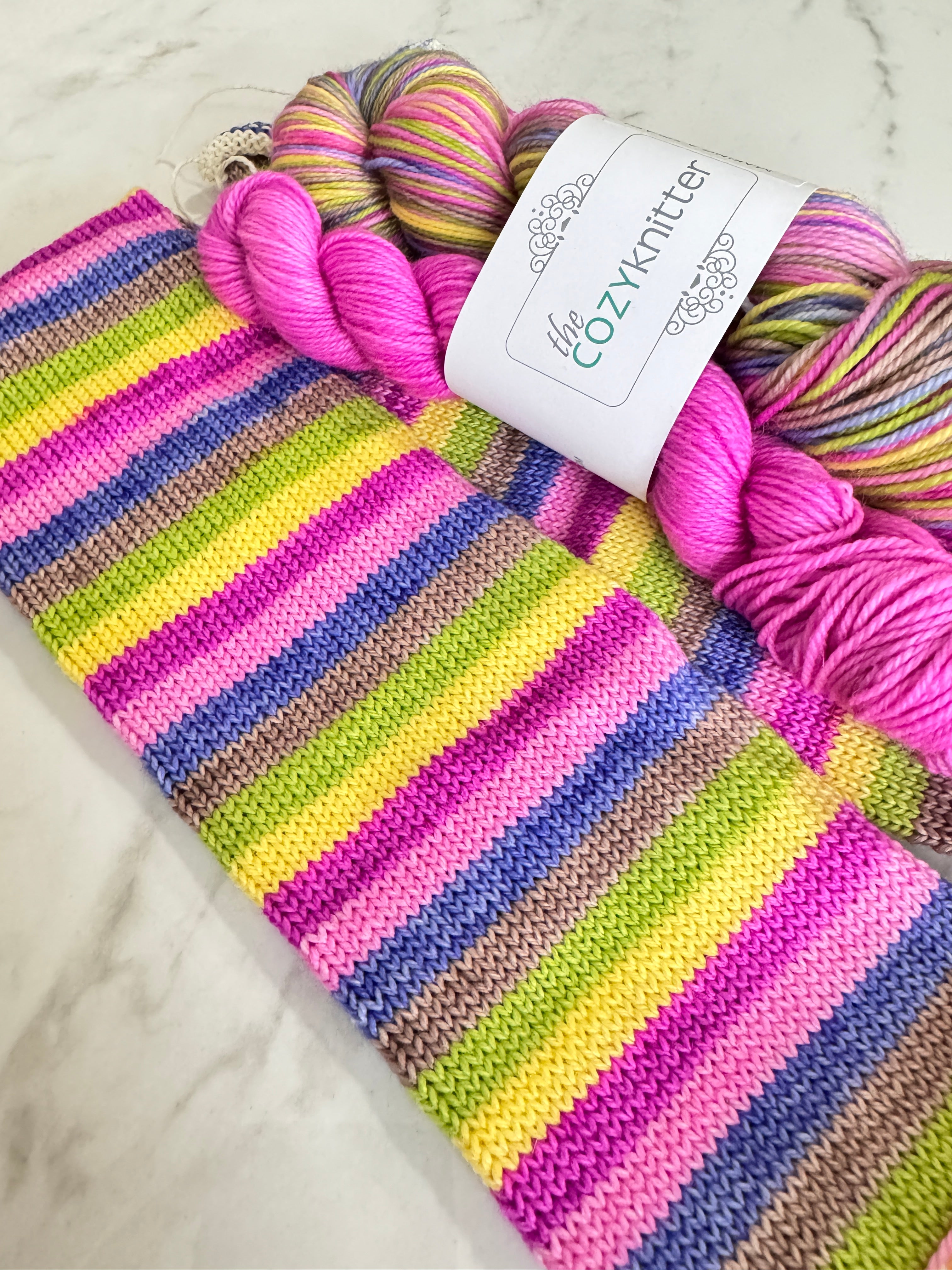 You will also receive a coordinating mini-skein for your toes/heels/cuffs in pink.