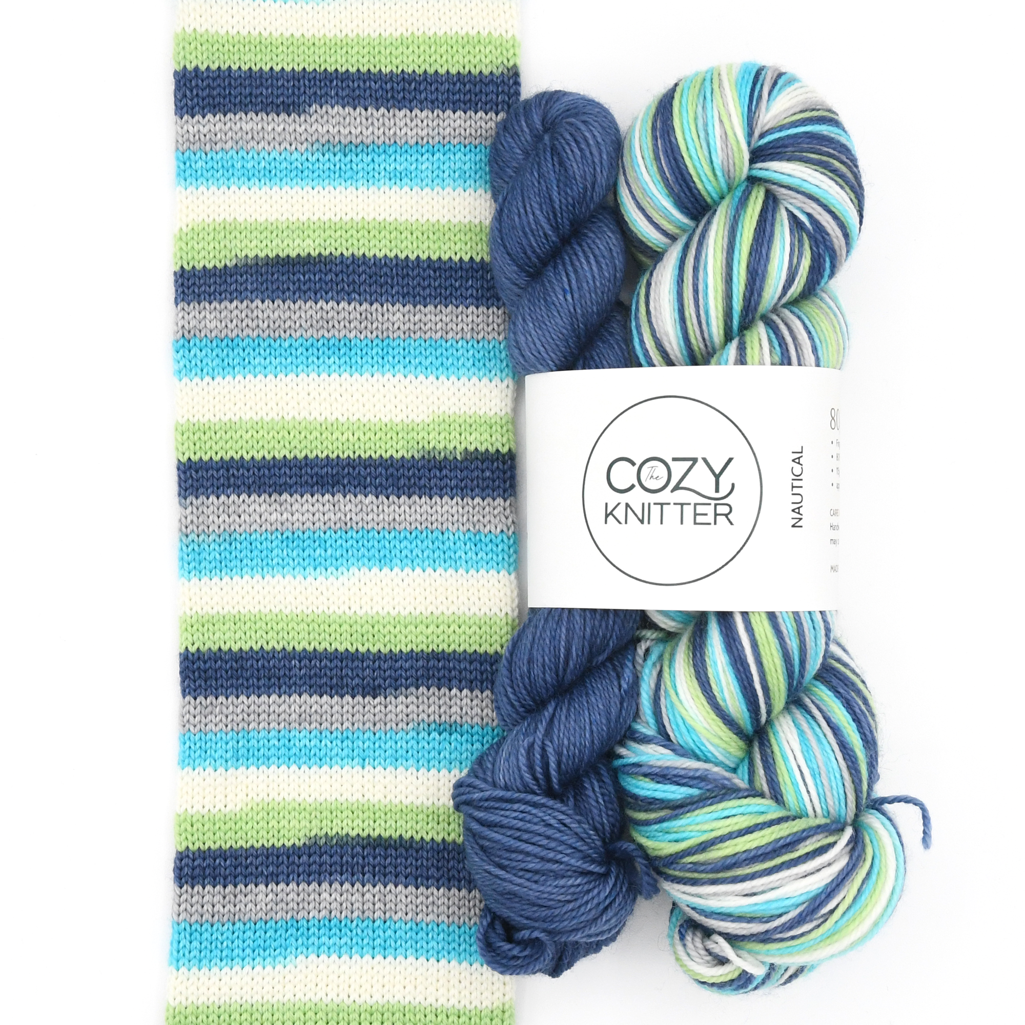 NAUTICAL is 1 skein of self-striping sock yarn {{ turquoise | light gray | navy | apple green | natural }} each stripe is approximately 4 rows depending on gauge on a 64 st. sock. You will also receive a mini-skein in navy/green for the toe/heel/cuff.