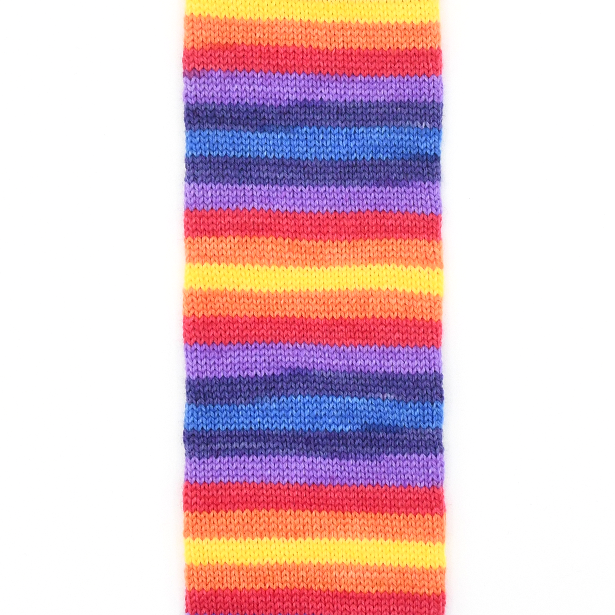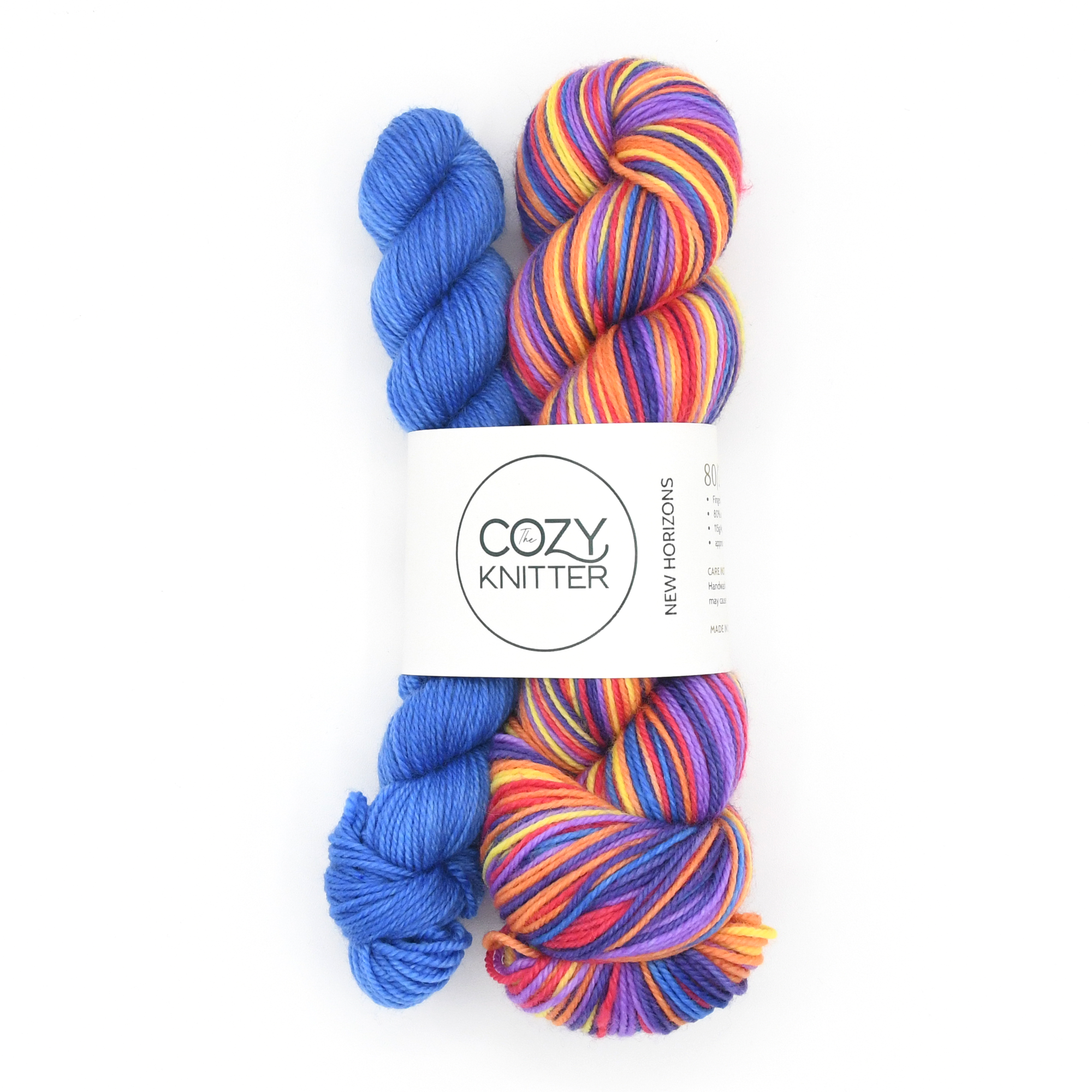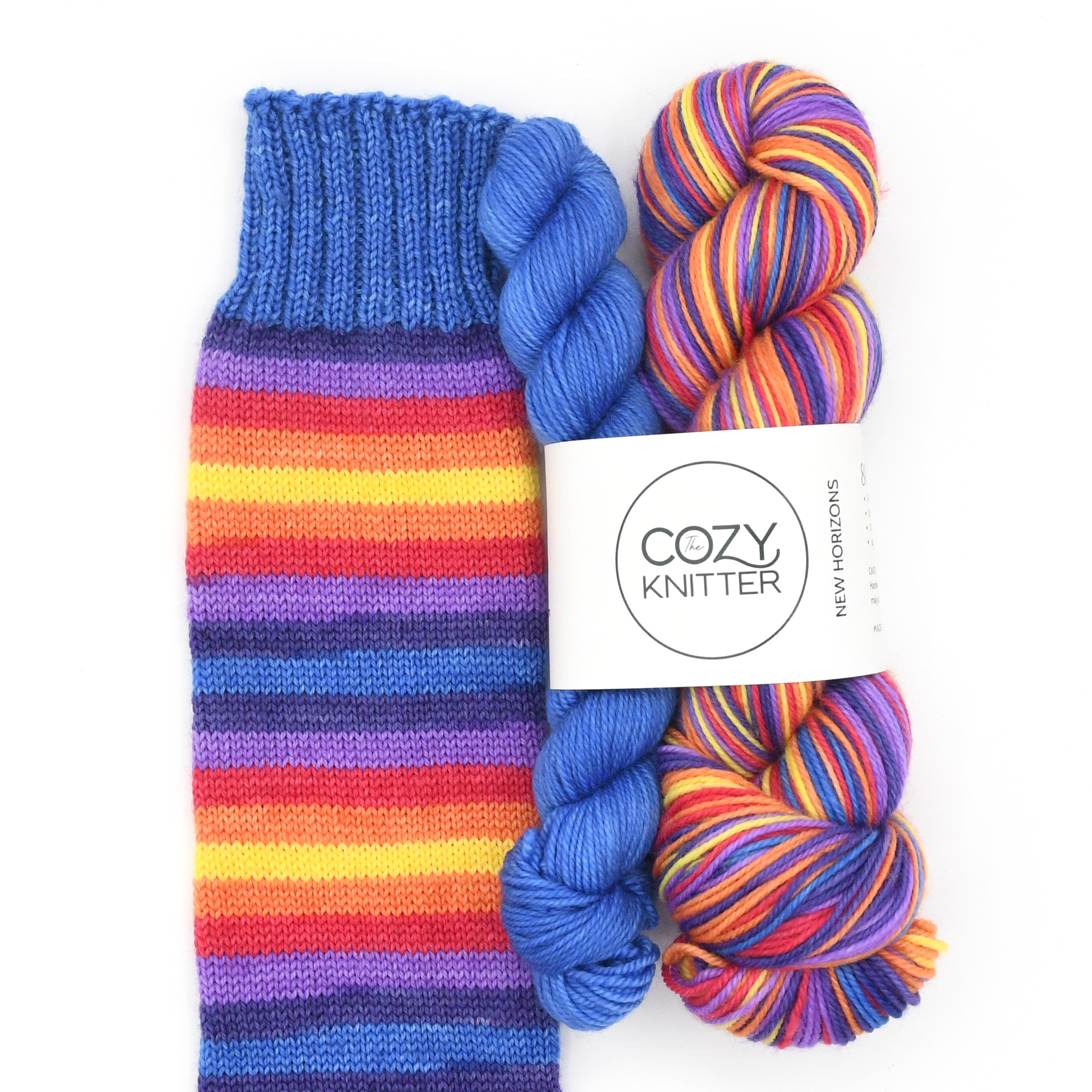 NEW HORIZONS is a 10-striping colourway. The colours in this colourway reminds me of the rising sun on the deep sea, each stripe is slightly tonal. You will also receive a co-ordinating mini-skein for your toes/heels/cuffs in blue. Each stripe is approximately 4 rows depending on gauge on a 64 st. sock.