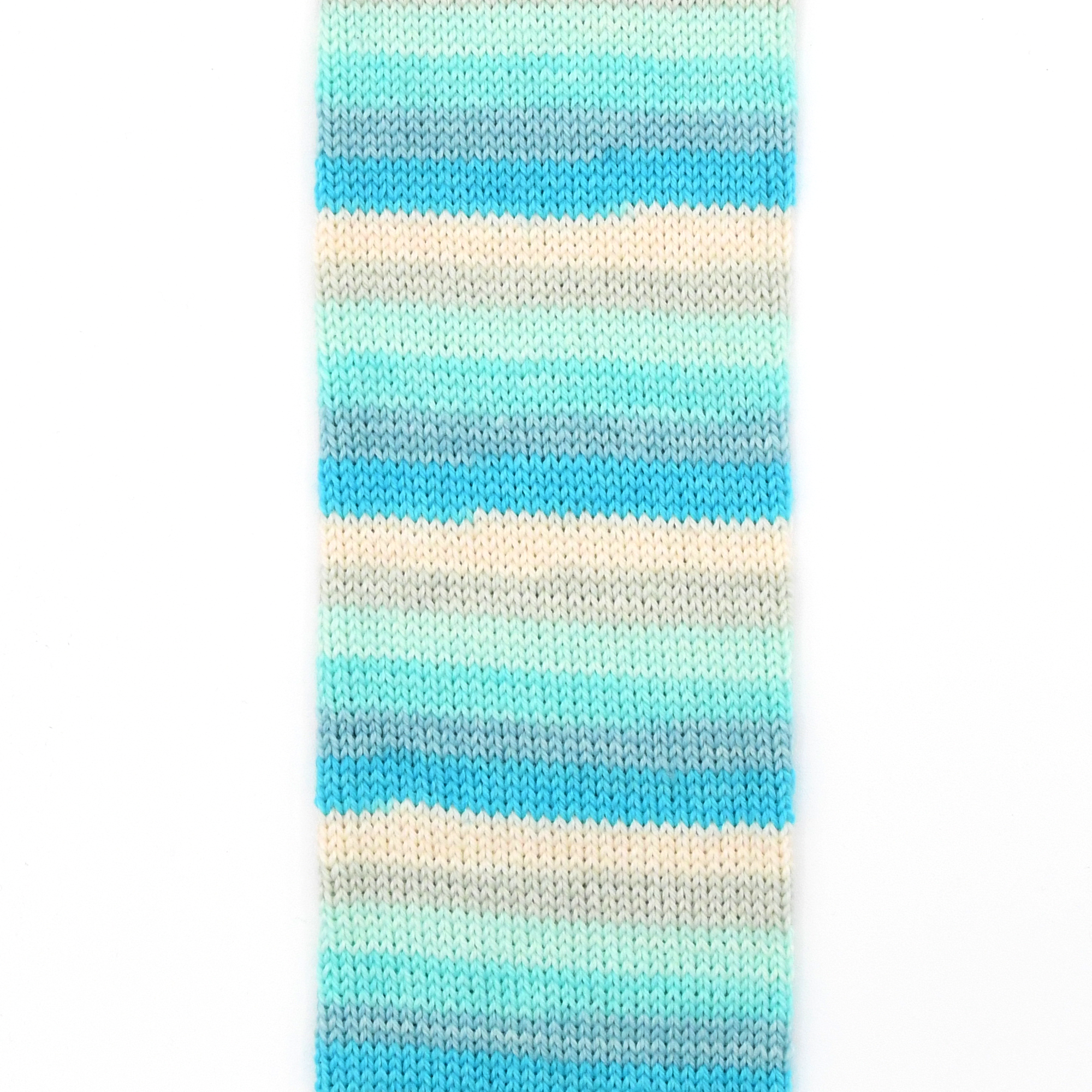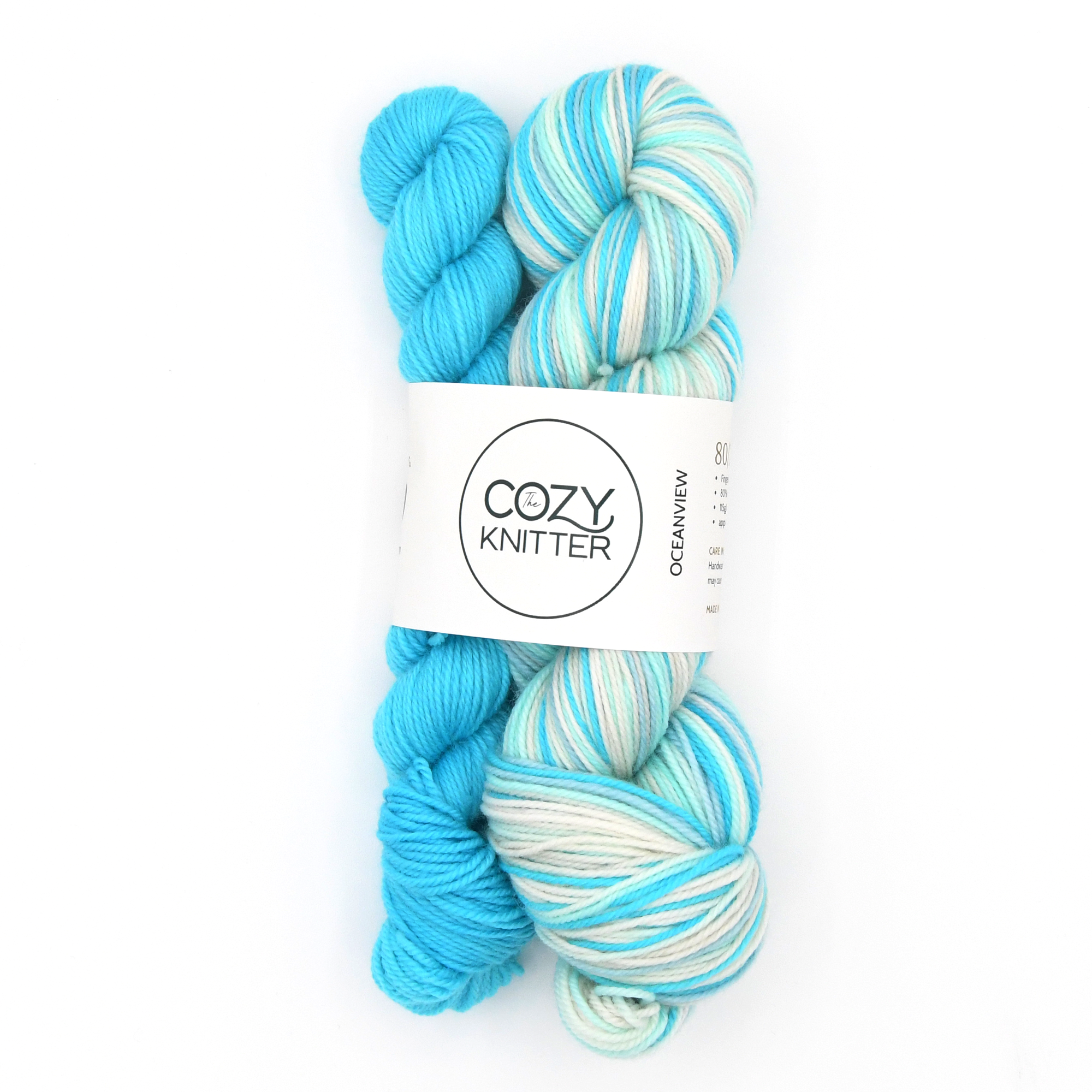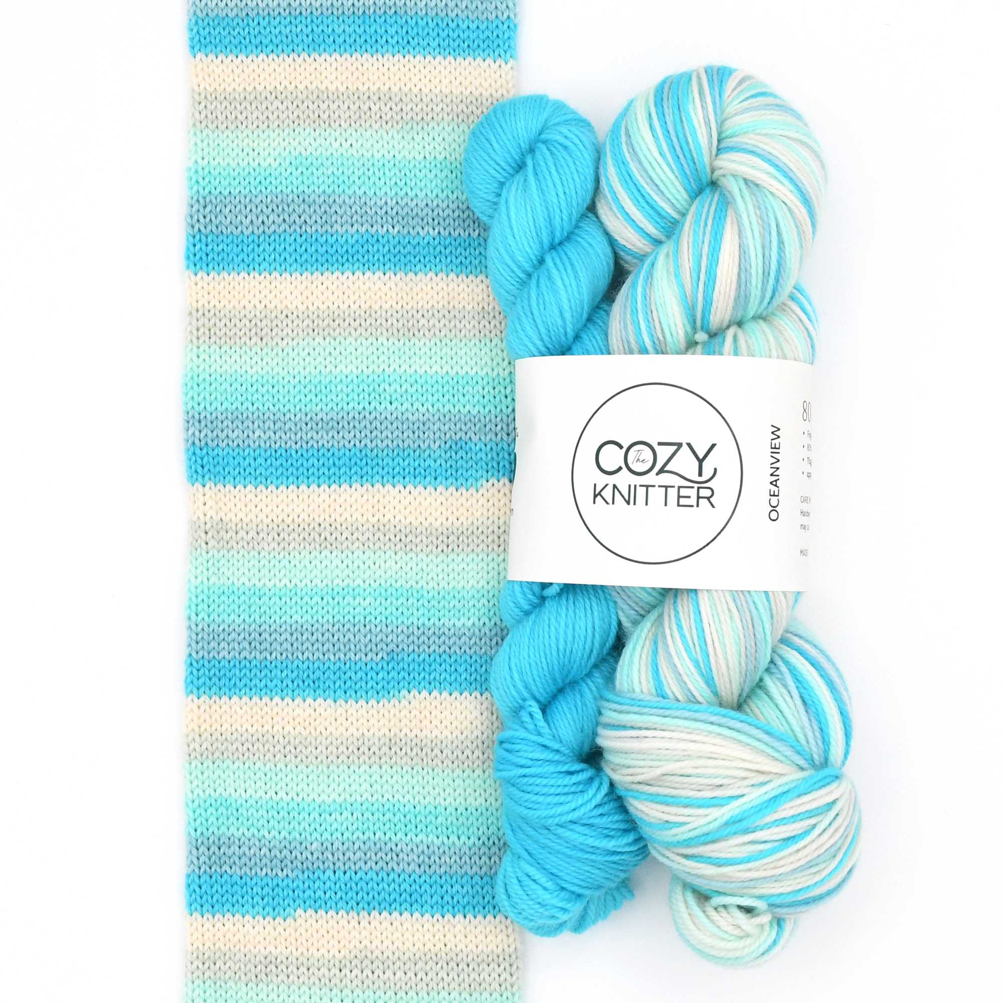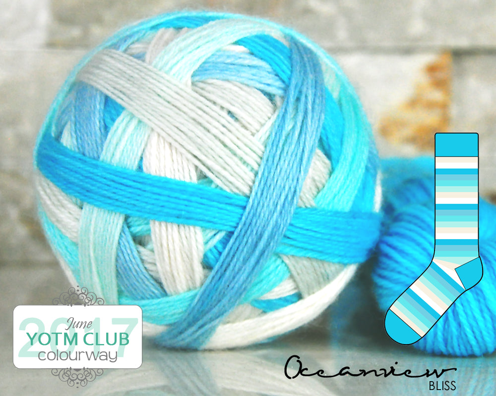 OCEANVIEW is the June 2017 YOTM club colourway. 1 skein of 6-self-striping sock yarn each stripe is approximately 4 rows depending on gauge on a 64 st. sock. You will also receive a coordinating mini-skein for your toes/heels/cuffs in turquoise.