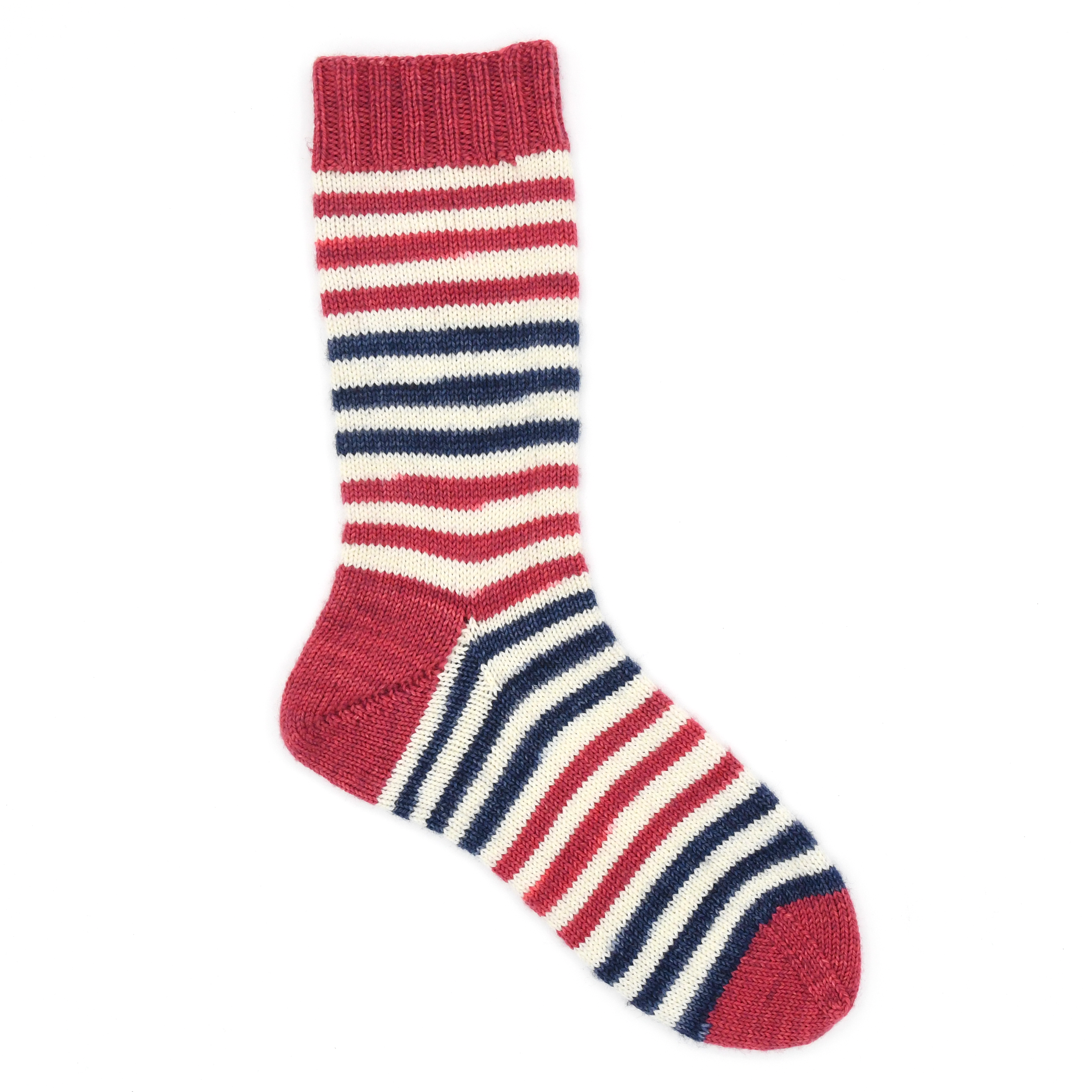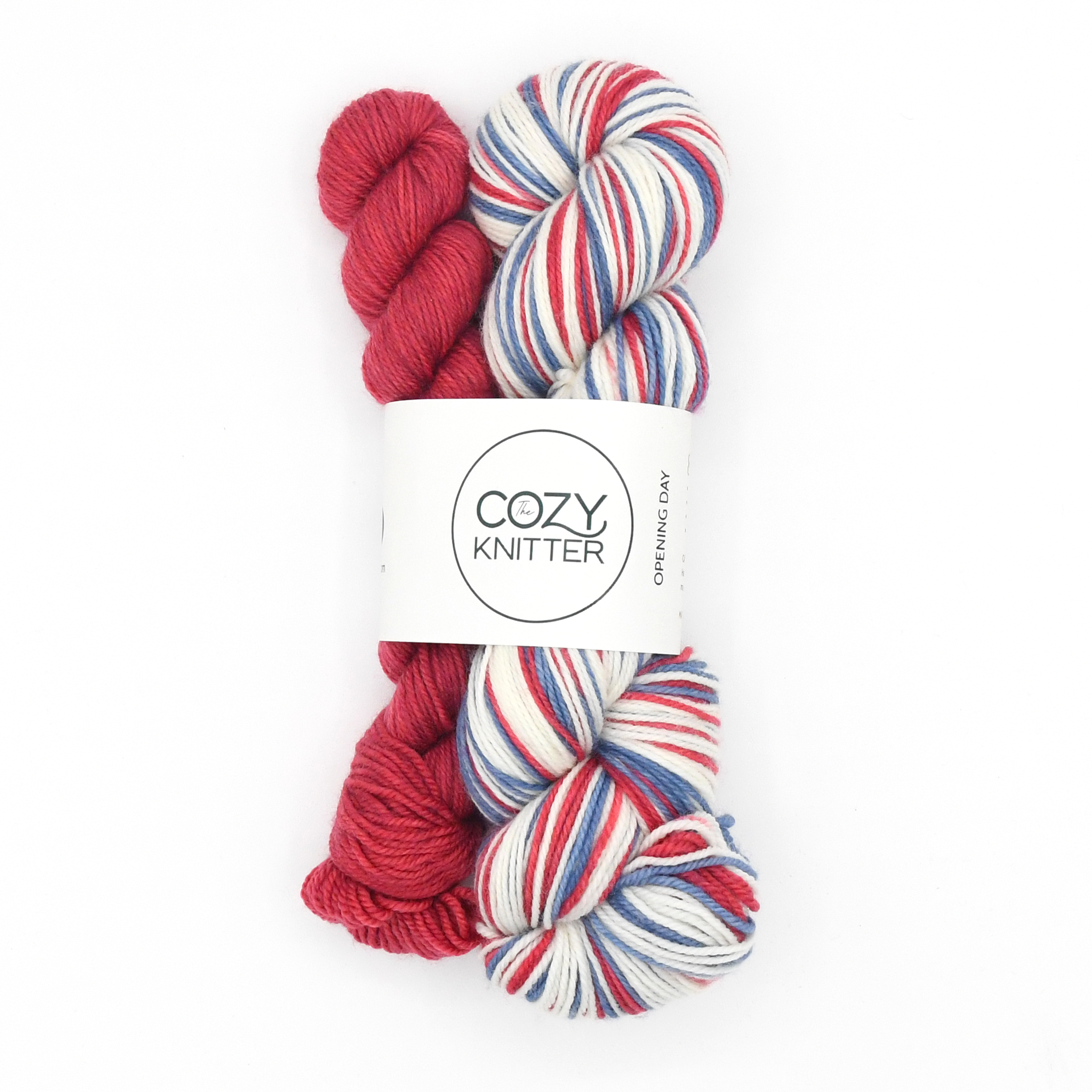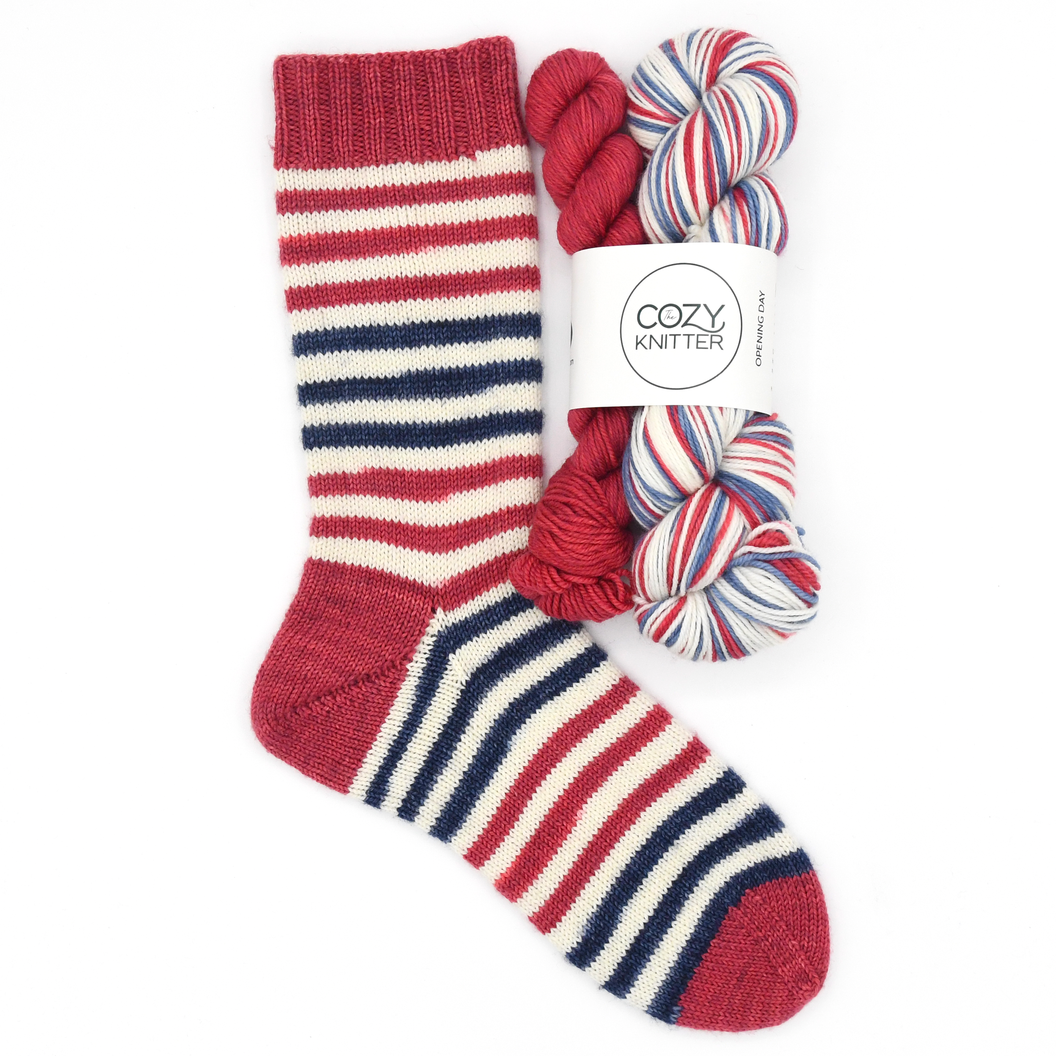OPENING DAY is a part of a series of 12 stripe sport themed colourways. This colourway has 3 colours, every other stipe is white the other 6 stripes alternate between blue and red in blocks of 3. You will also receive a co-ordinating mini-skein for your toes/heels/cuffs in the red. Each stripe is approximately 4 rows depending on gauge on a 64 st. sock.