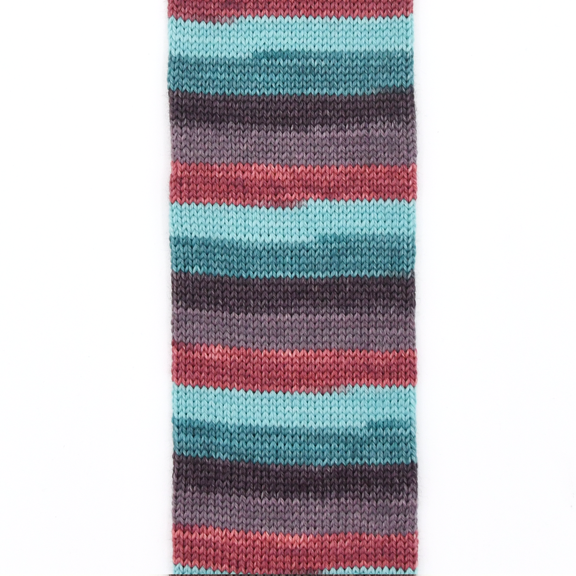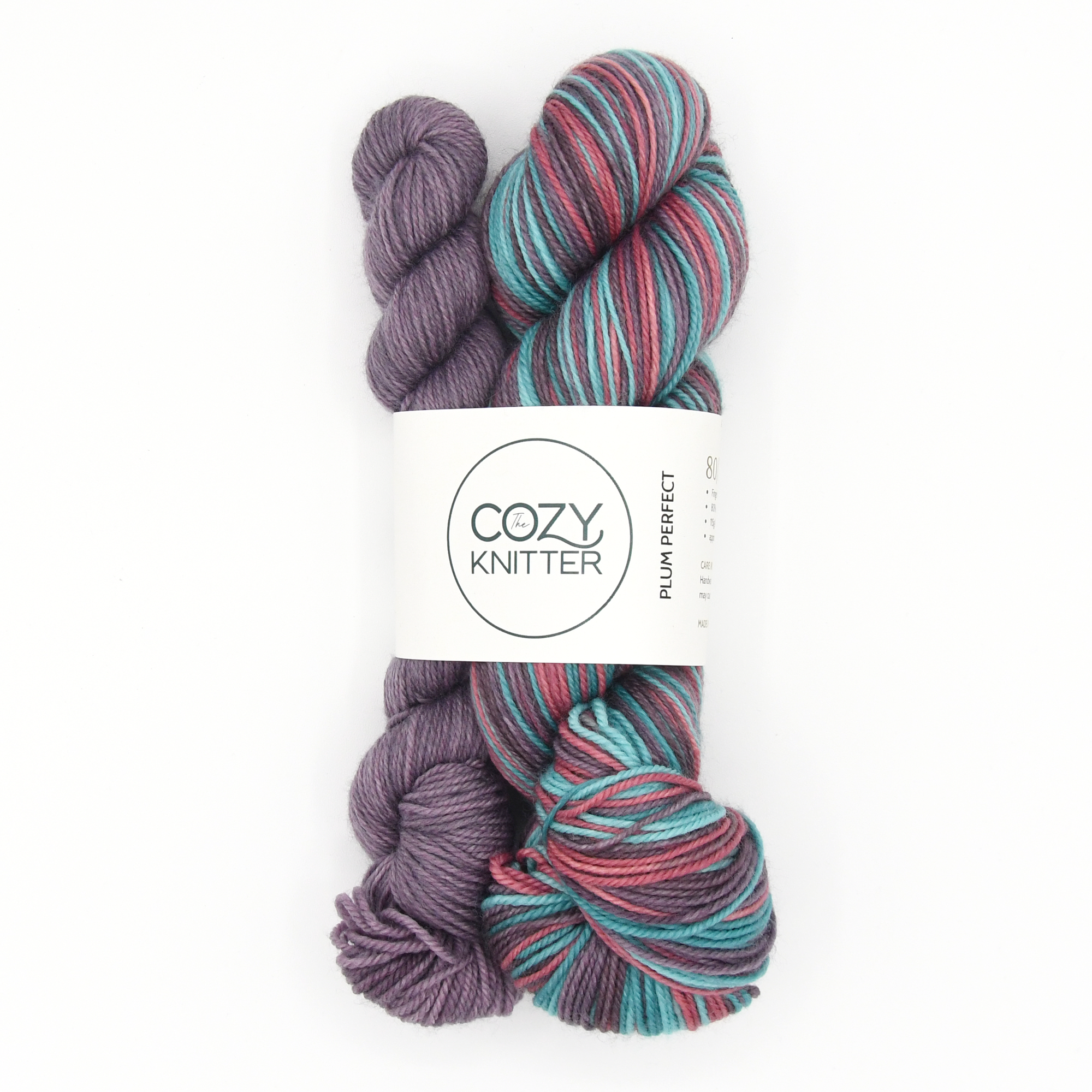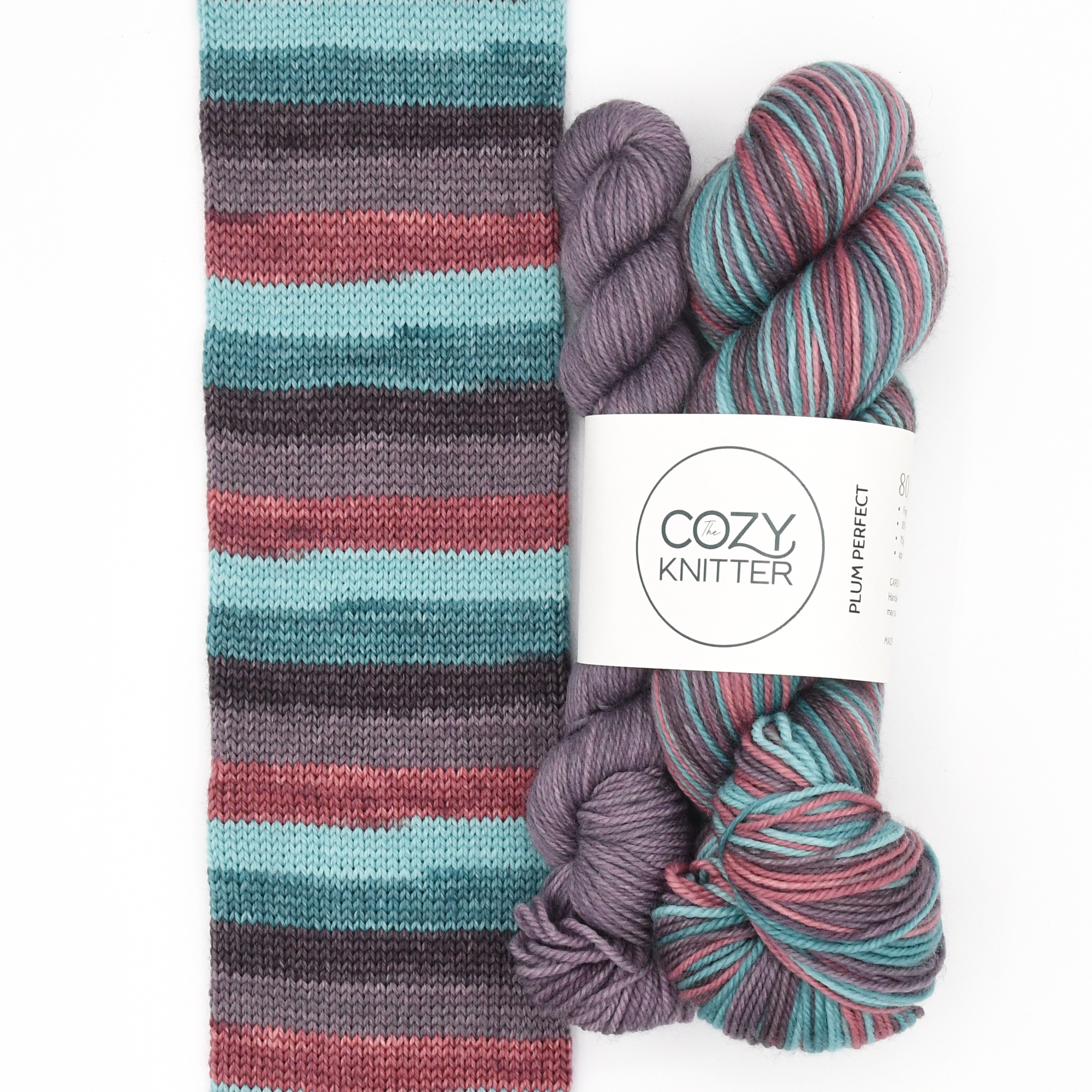 PLUM PERFECT is 1 skein of of 5-stripe self-striping sock yarn it comes with a perfectly matched mini-skein in plum for your toes/heels/cuffs. Each stripe is approximately 5-6 rows depending on gauge on a 64 st. sock.