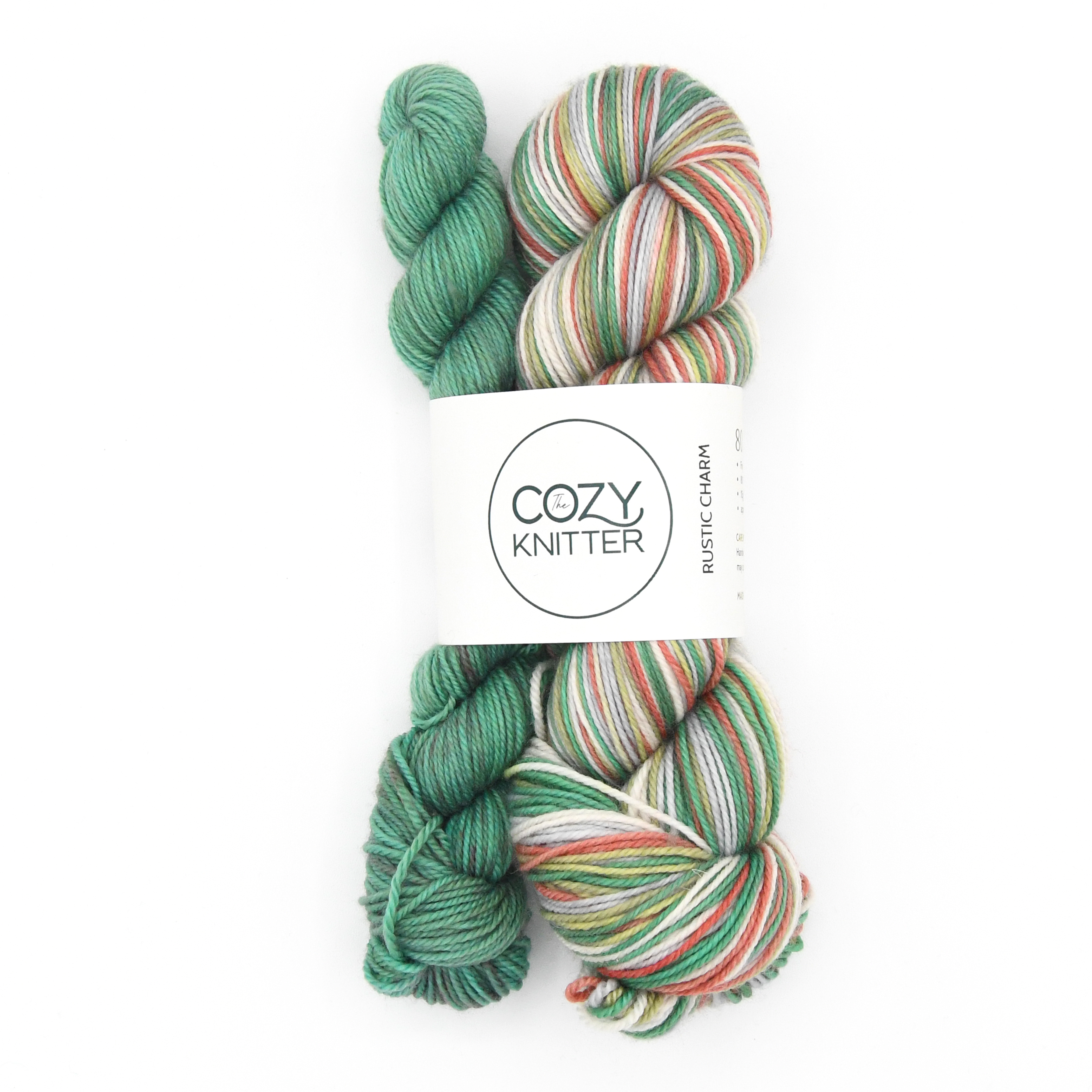 RUSTIC CHARM is the September 2023 YOTM club colourway. 1 skein of 5 stripe self-striping sock yarn each stripe is approximately 5-6 rows depending on gauge on a 64 st. sock.