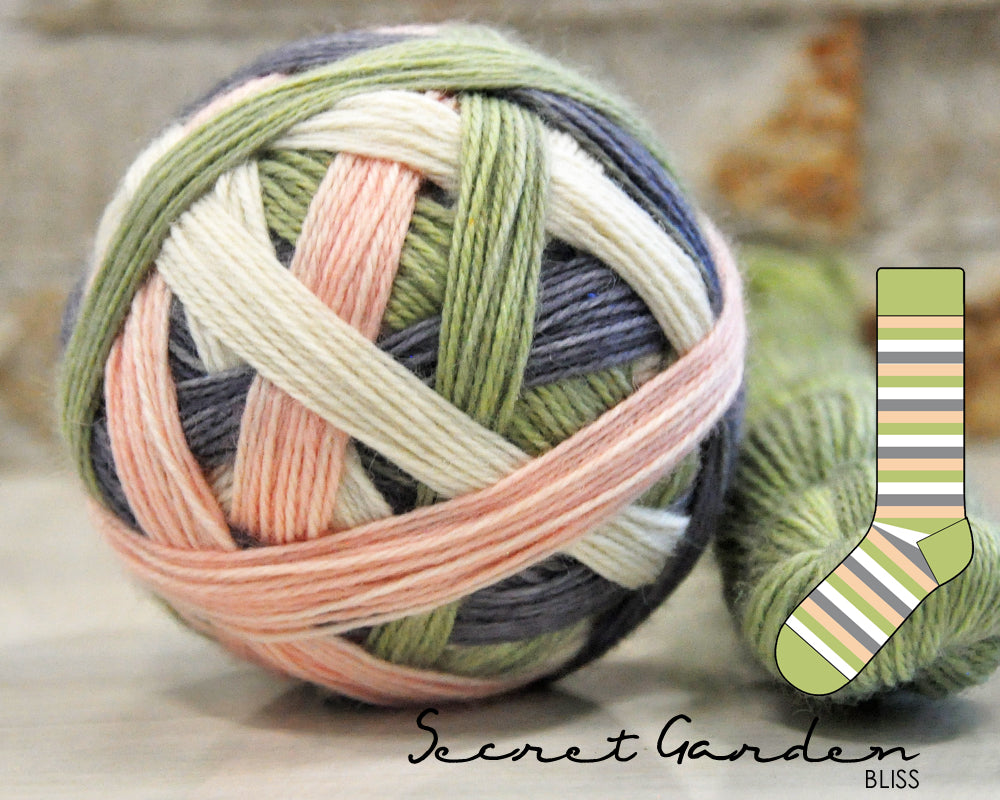 SECRET GARDEN is 1 skein of 4-stripe self-striping sock yarn with a perfectly matched grey mini-skein for your toes/heels/cuffs in the green. Each stripe is approximately 5-6 rows depending on gauge on a 64 st. sock.
