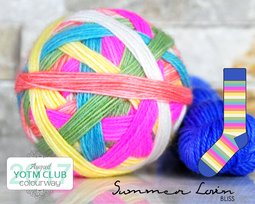 SUMMER LOVIN is the August 2017 YOTM club colourway. 1 skein of 6-self-striping sock yarn each stripe is approximately 5-6 rows depending on gauge on a 64 st. sock.