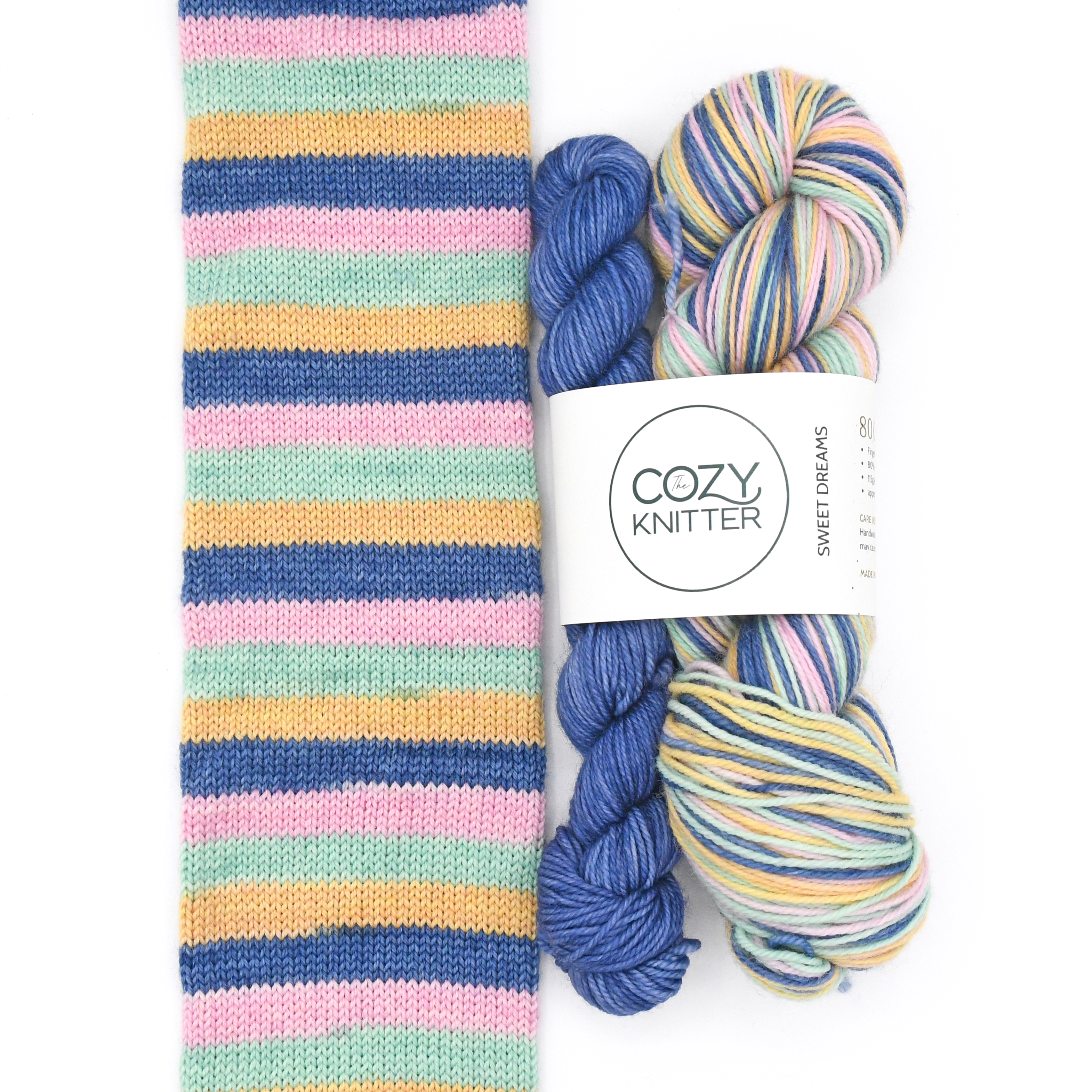 SWEET DREAMS is the August 2022 YOTM club colourway. 1 skein of 4 stripe self-striping sock yarn each stripe is approximately 5-6 rows depending on gauge on a 64 st. sock.