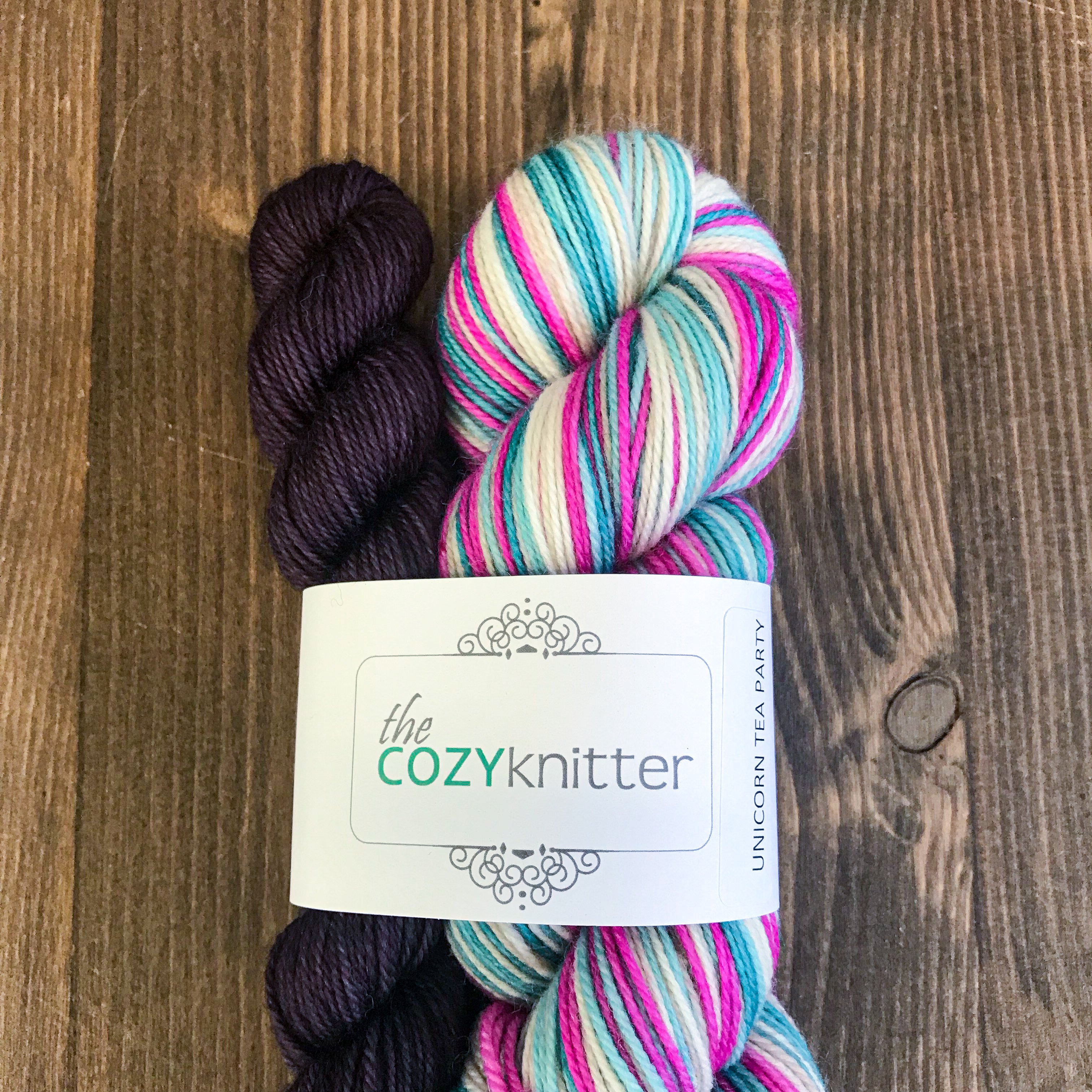 UNICORN TEA PARTY is the August 2018 YOTM club colourway. 1 skein of 5 stripe self-striping sock yarn each stripe is approximately 3-4 rows depending on gauge on a 64 st. sock.