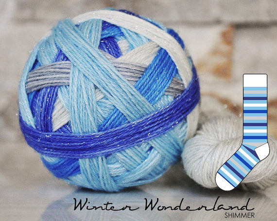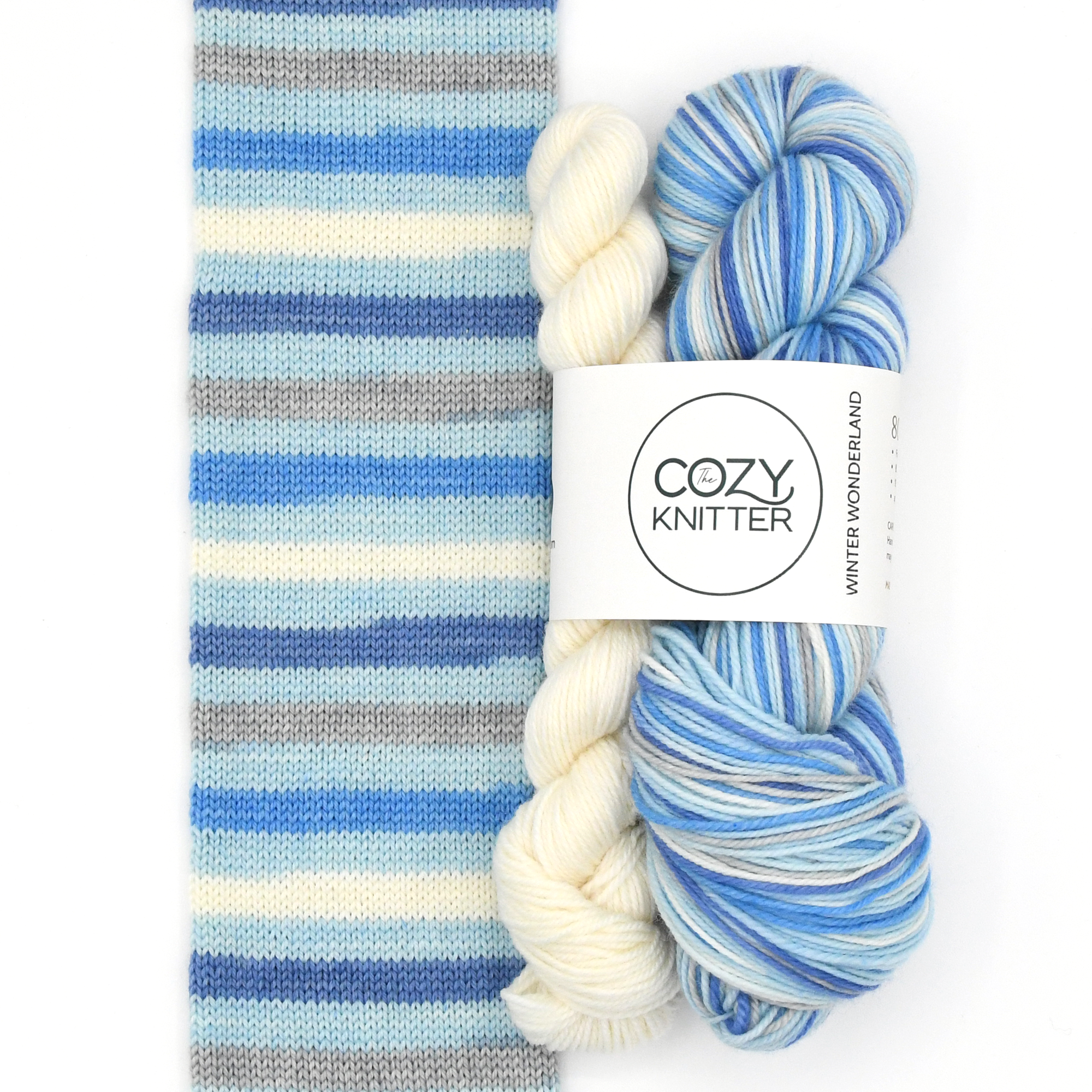 WINTER WONDERLAND is an 8-striping winter colourway. 1 skein of self-striping sock yarn in silver grey, white and 3 shades of blue each stripe is approximately 4 rows depending on gauge on a 64 st. sock. 1 skein is enough to knit a pair of socks in most sizes